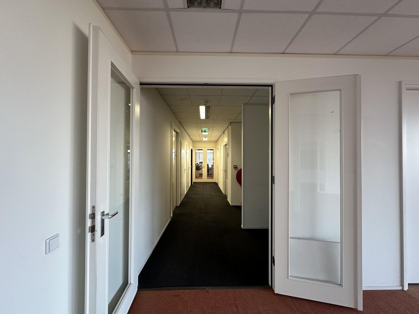 Op elke etage zijn systeemplafonds aangebracht. Hierboven lopen leidingen.
