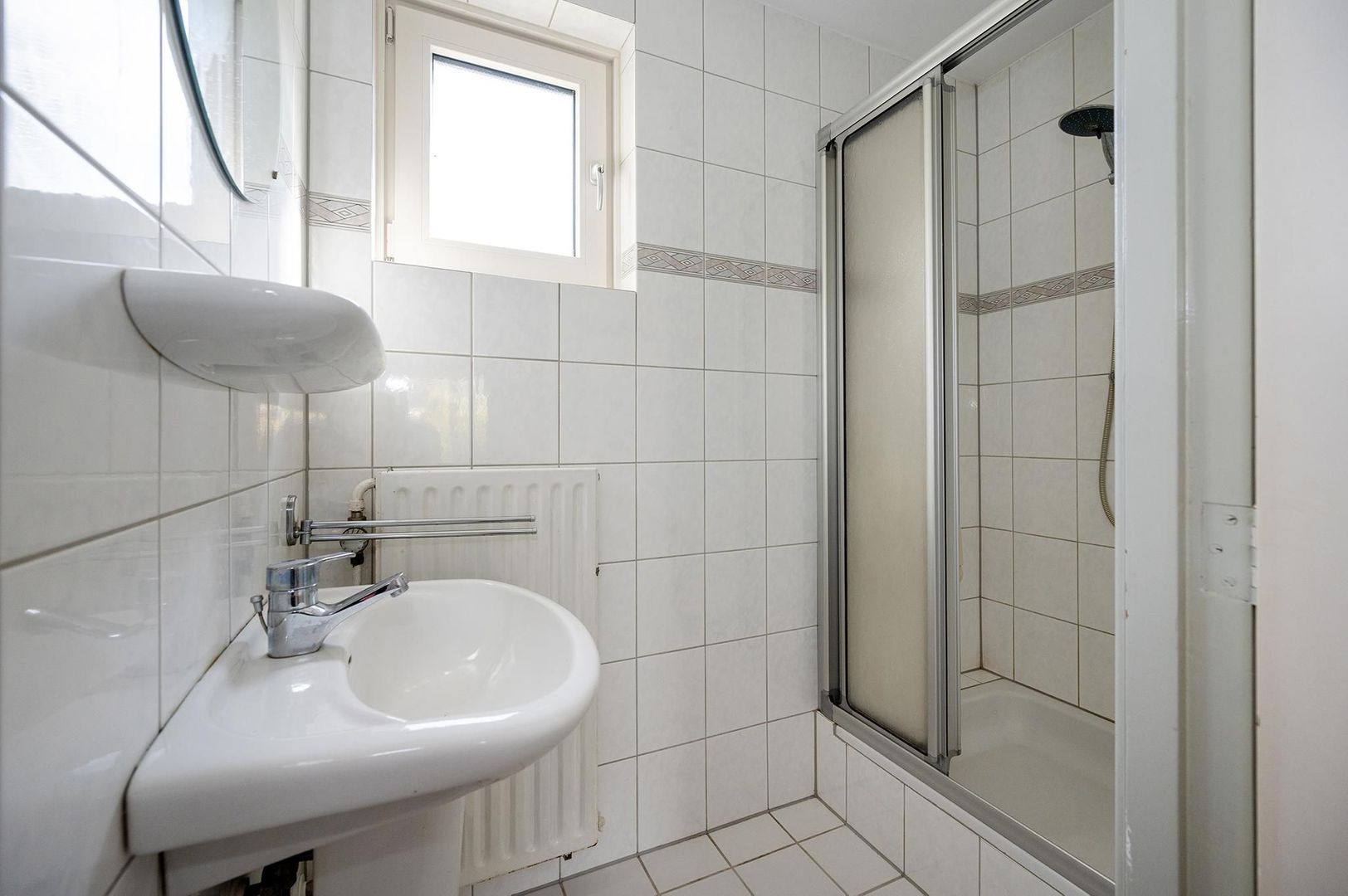 De badkamer bevindt zich aan de voorzijde van de woning en is uitgevoerd met lichte tegels tot aan het plafond. Deze is uitgerust met een wastafelmeubel en een douchehoek.