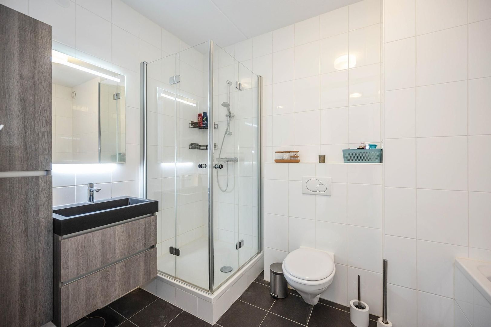 De ruime badkamer is volledig betegeld met witte wandtegels en grijze vloertegels. Voorzien van een ligbad met douche, een aparte douchecabine, een tweede toilet, een wastafel met meubel en een spiegel met verlichting.