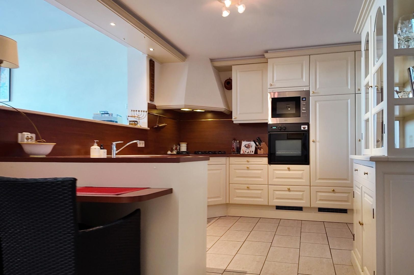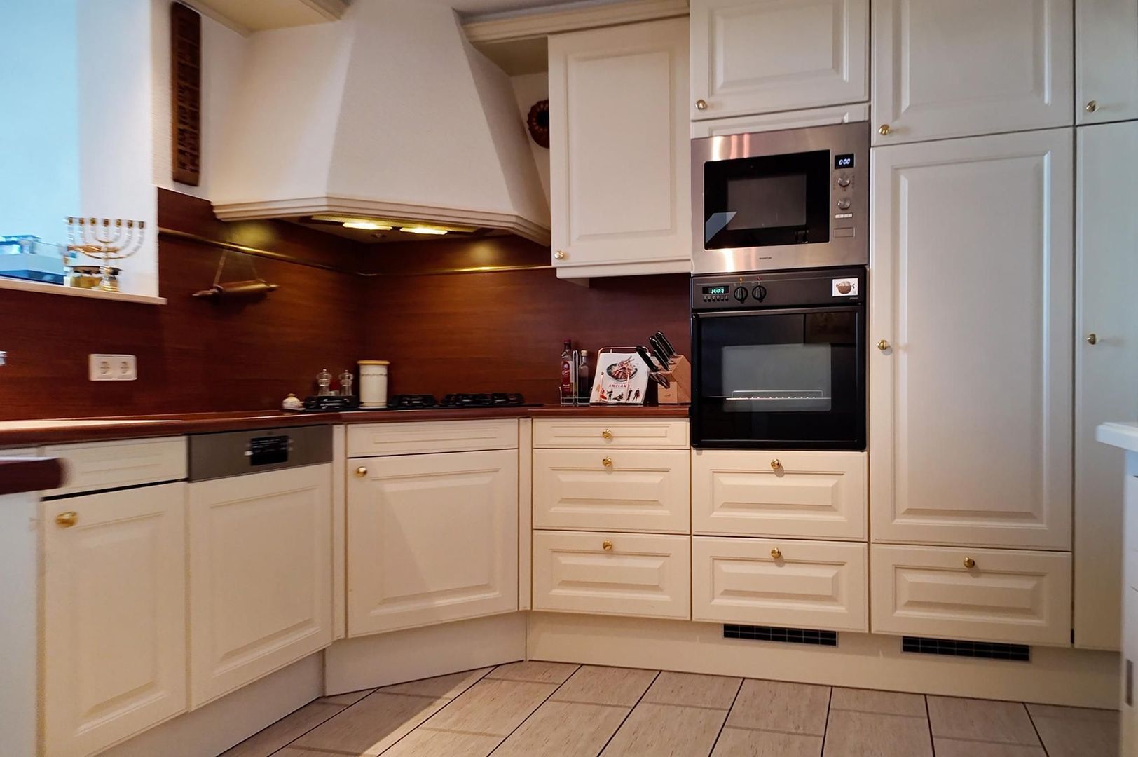 Halfopen keuken met diverse inbouwapparatuur zoals een kookplaat, oven, koelkast, vriezer, afzuigkap en vaatwasser.