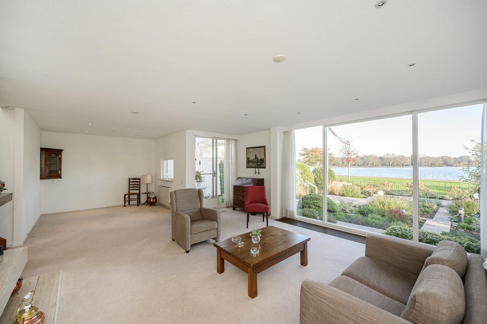 Ruime, lichte woonkamer met grote raampartijen, sfeervolle gashaard en een schuifpui naar het overdekte terras met uitzicht op de tuin en Zegerplas.