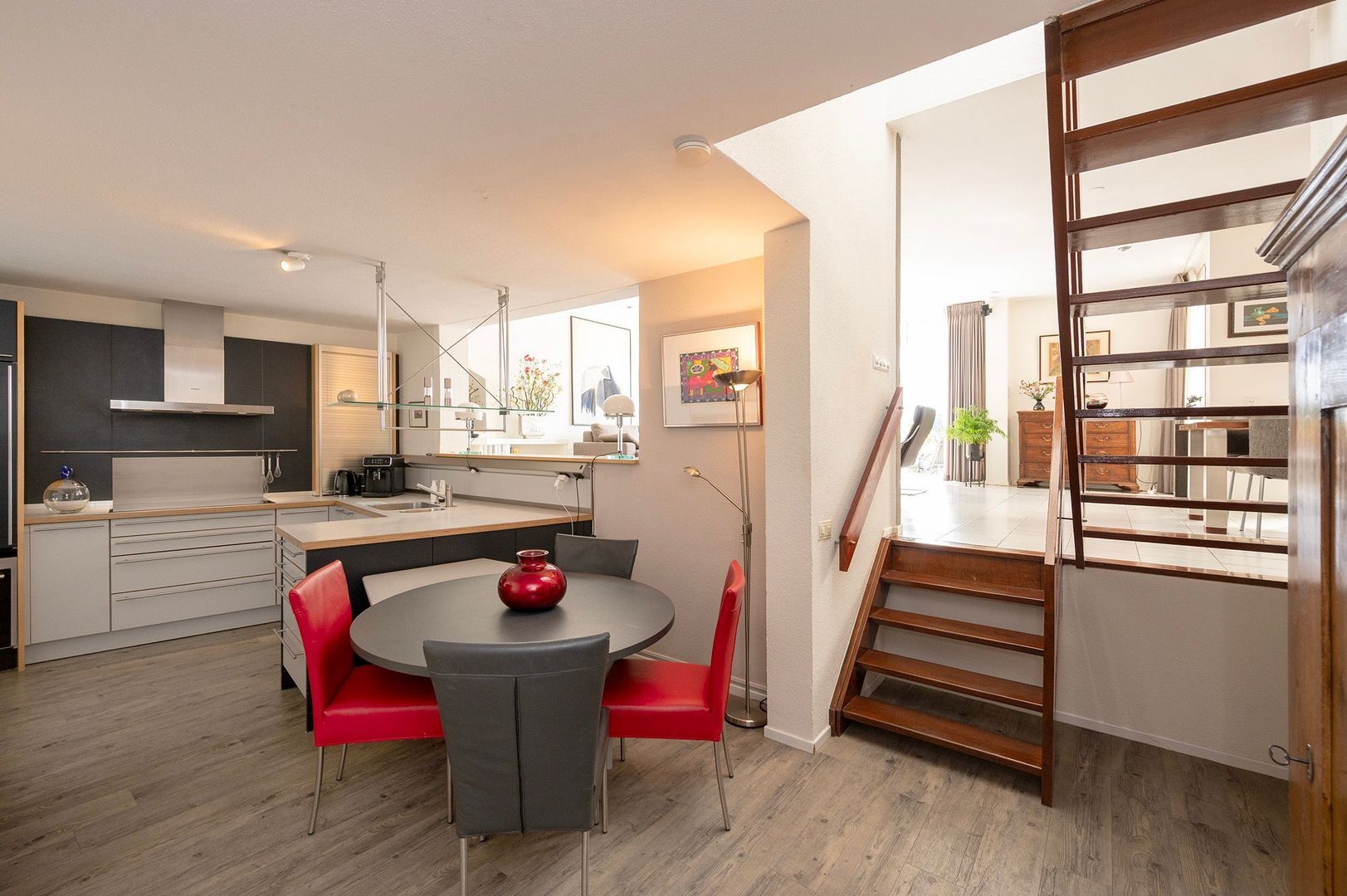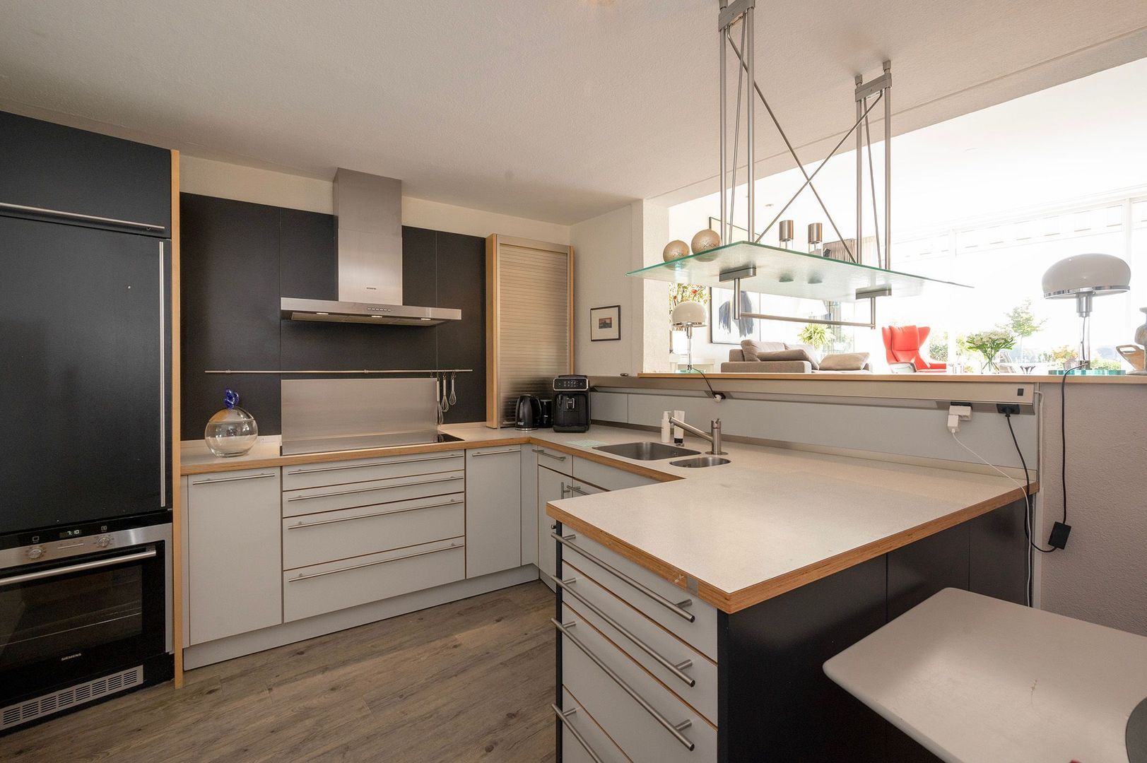 De halfopen keuken is uitgerust met diverse inbouwapparatuur, waaronder een inductiekookplaat, oven, koelkast, vriezer en afzuigkap. Aansluitend bevindt zich een handige bijkeuken/berging met de opstelling voor de cv-ketel, vaatwasser, wasmachine en droger.