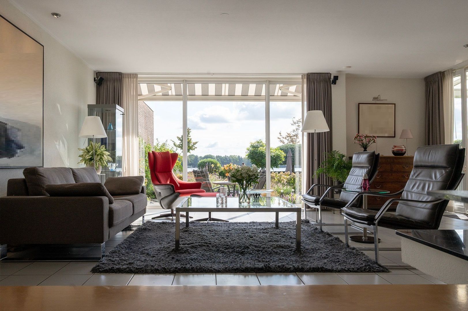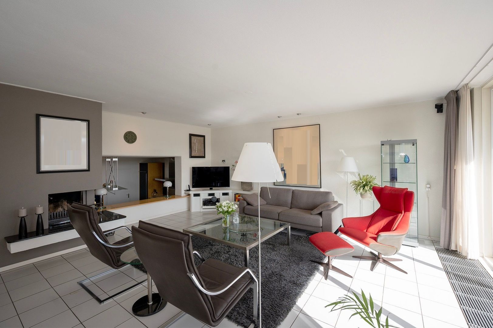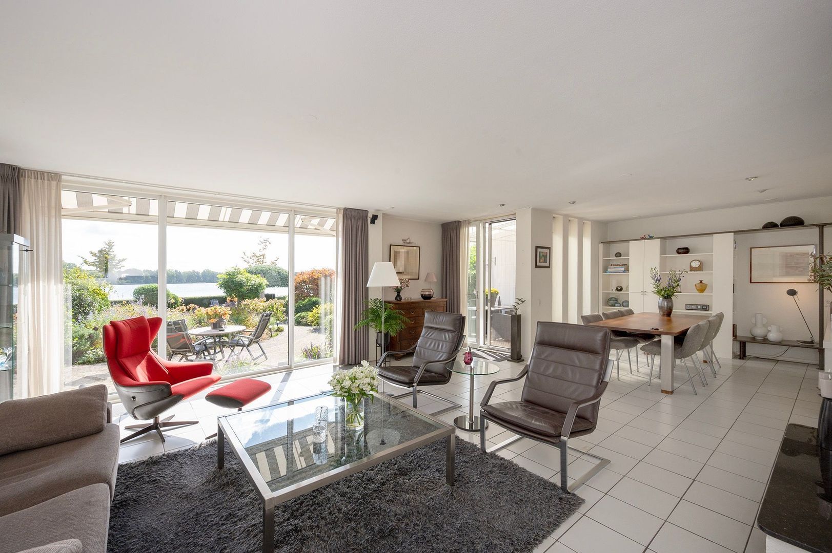 De royale en lichte woonkamer wordt gekenmerkt door grote raampartijen, een sfeervolle open haard en een schuifpui naar het overdekte terras. Dankzij de terrasverwarmer kunt u hier het hele jaar door genieten van het prachtige uitzicht over de tuin en de Zegerplas.