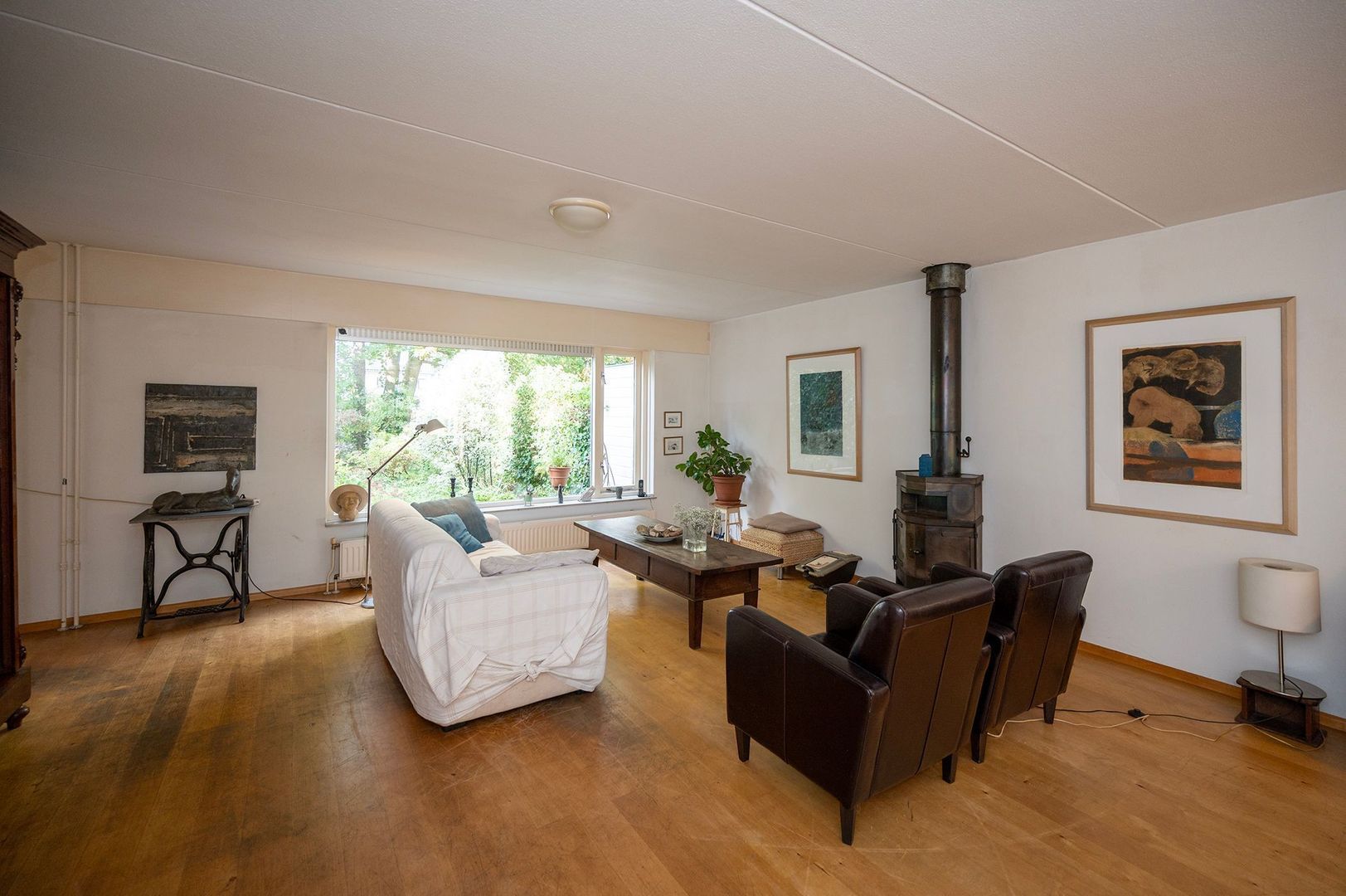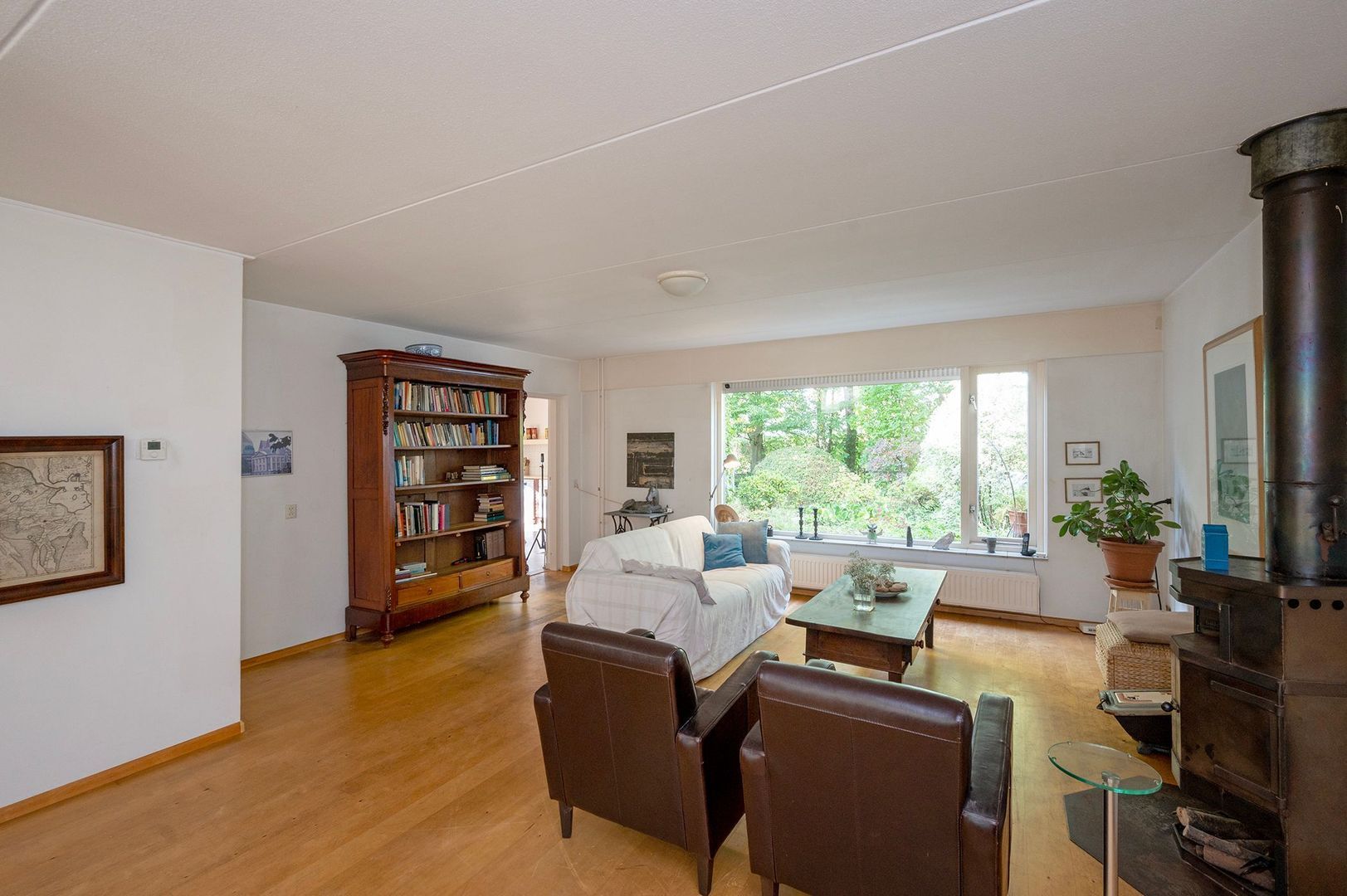 - Lichte, sfeervolle woonkamer met houtkachel en panoramisch uitzicht op het park