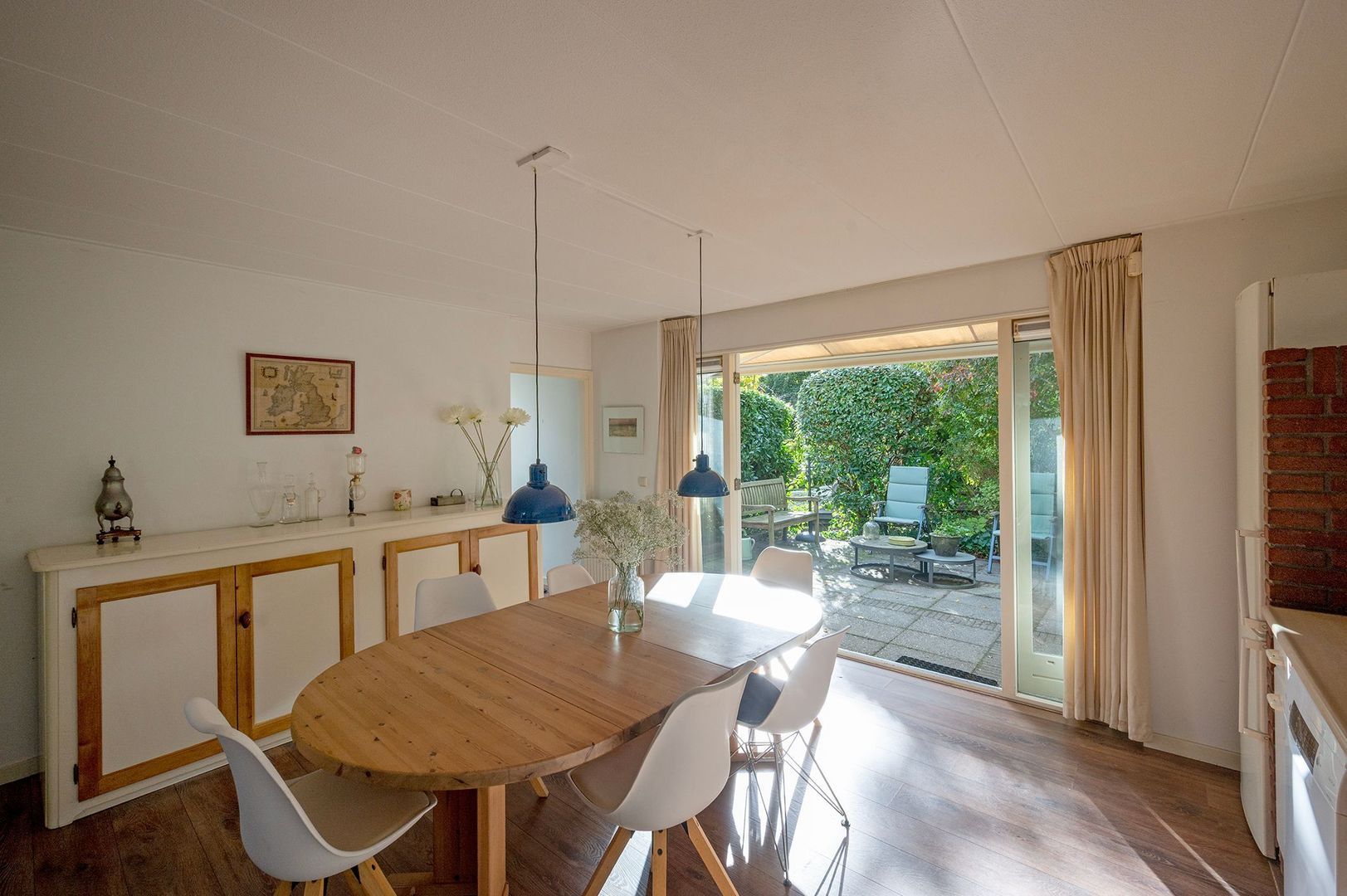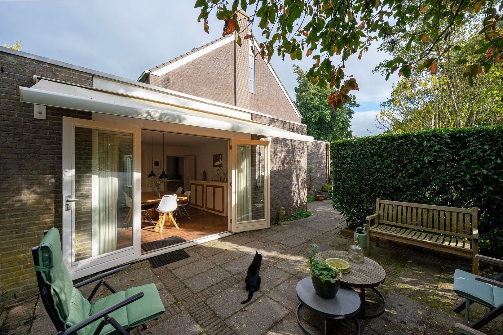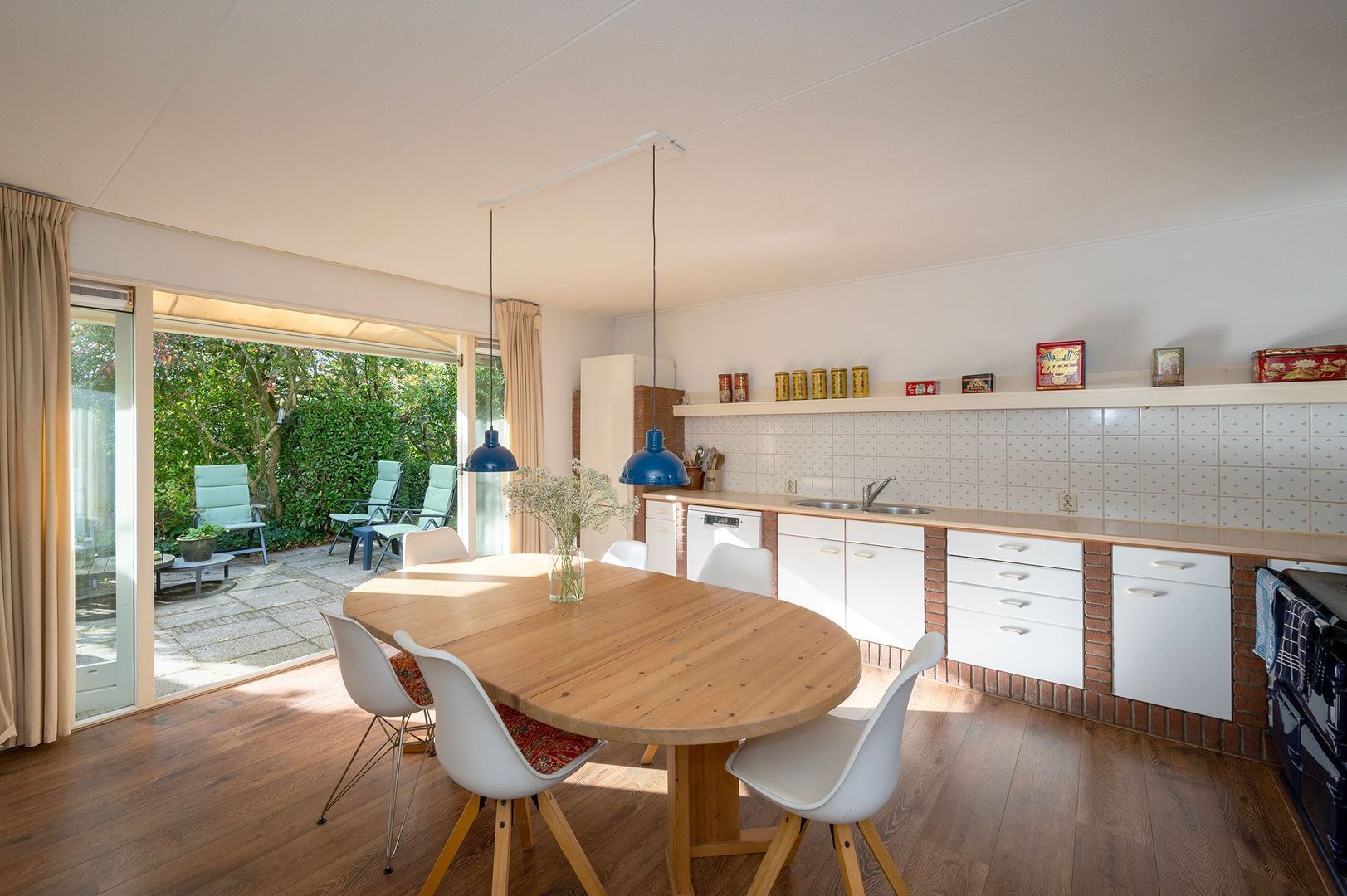 Aan de achterzijde bevindt zich de royale woonkeuken, voorzien van een vaatwasser, koelkast en een karakteristiek jaren ’60 fornuis van het merk AGA. Openslaande deuren geven toegang tot de zonnige zij- en achtertuin, die is ingericht met terrassen, groen en uitzicht op een waterpartij. Hier ervaart u optimale privacy en rust.