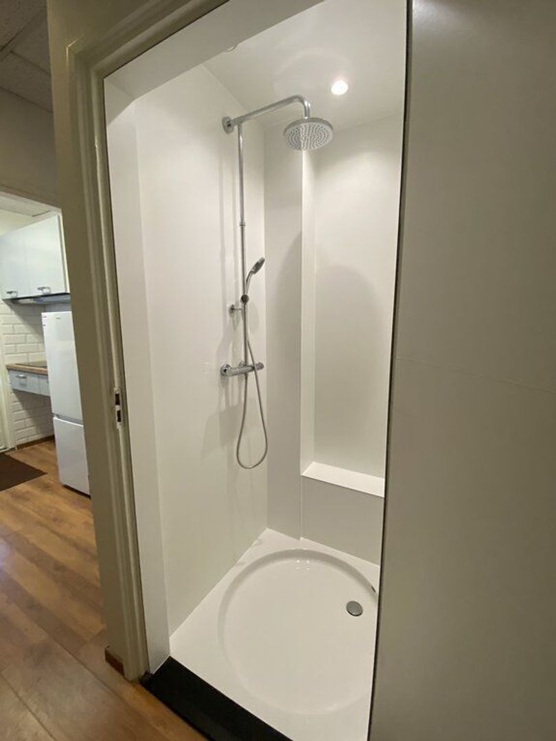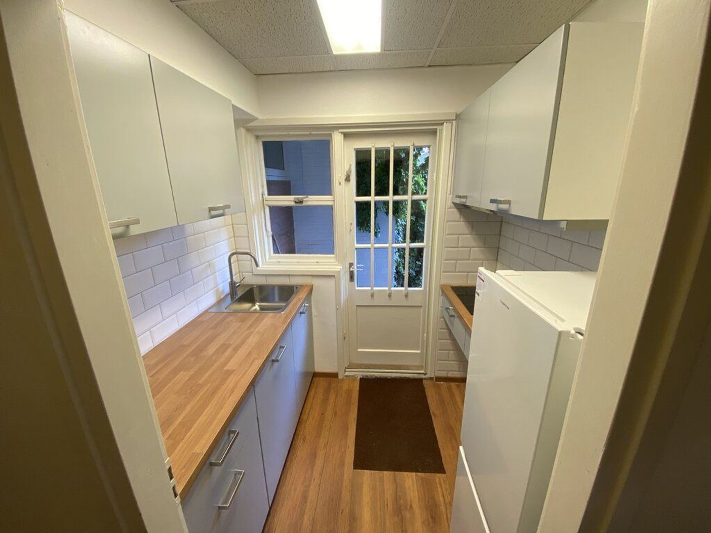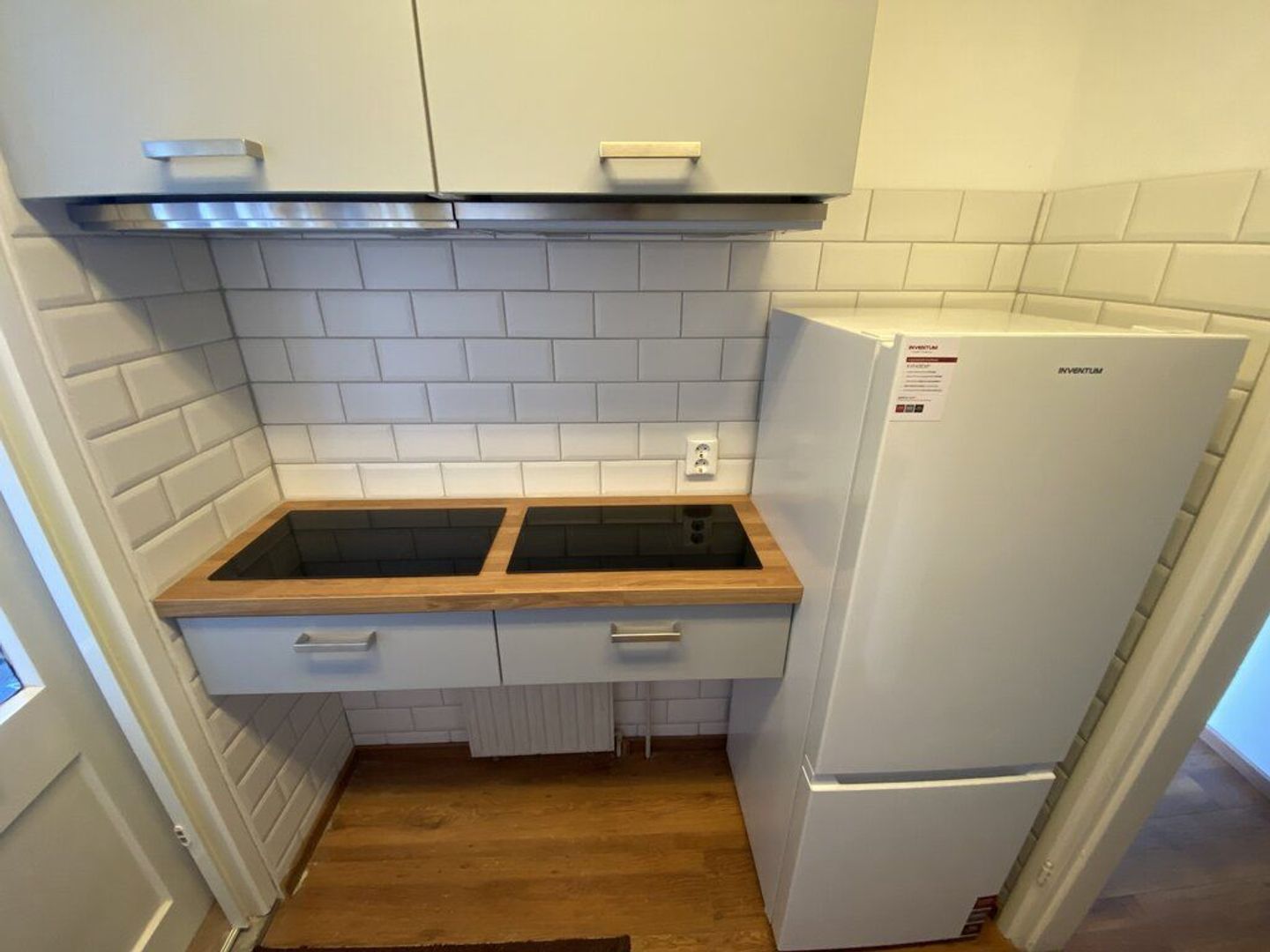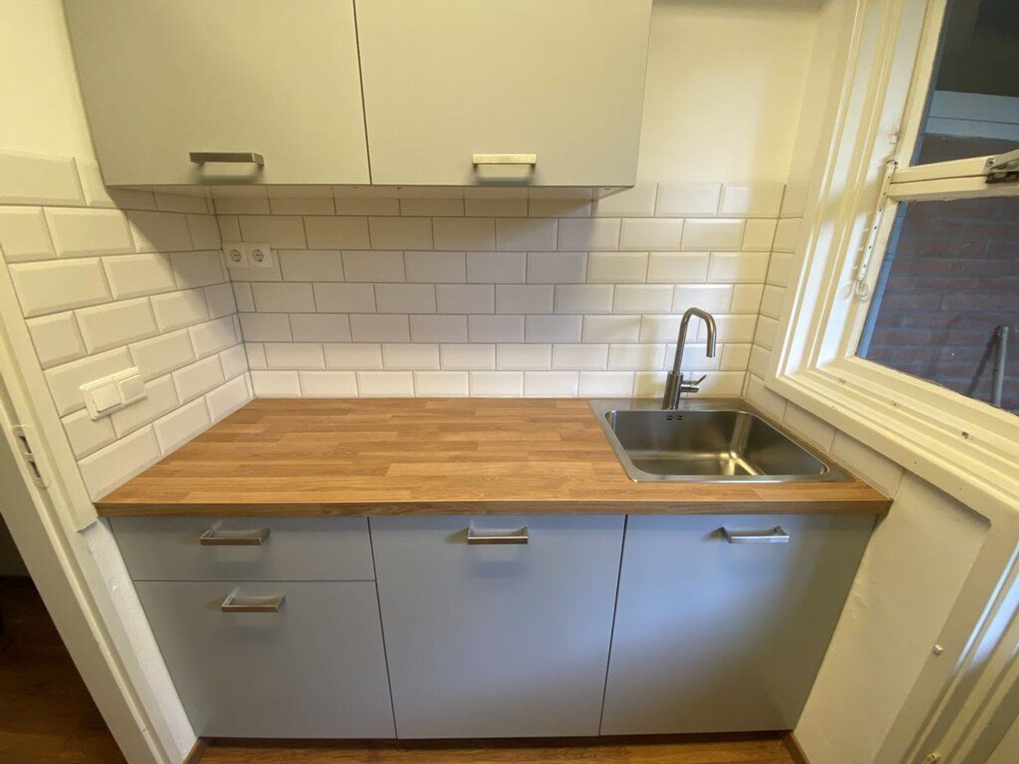 Bij binnenkomst bevindt u zich in de hal waar de toiletruimte en de douche zich bevinden. Aan het einde van de gang bevindt zich de keuken welke volledig is gerenoveerd. De keuken beschikt over voldoende kastruimte, een vaatwasser, afzuiginstallatie, inductie kookplaten en een koelkast met vries compartiment.