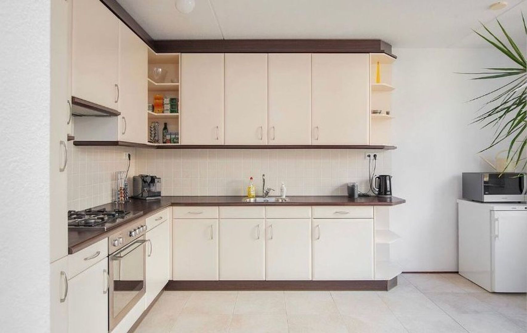 Vanaf de keuken heeft u uitzicht op het rustige hofje met enkel bestemmingsverkeer en een handige vaste kast voor extra opbergruimte.