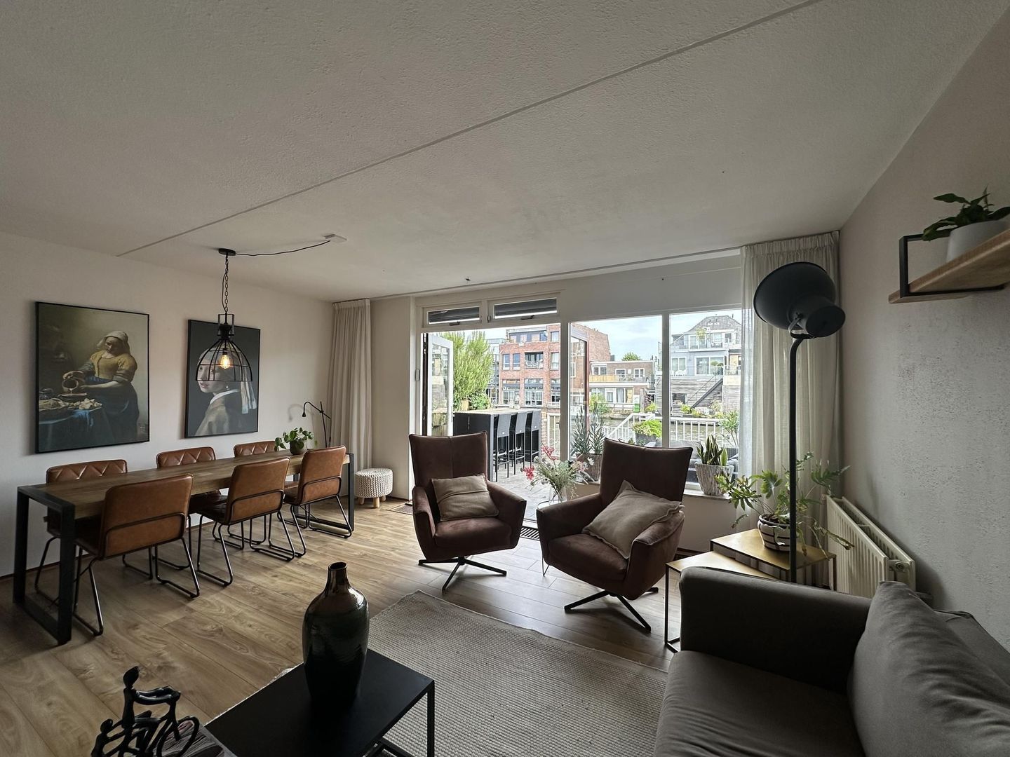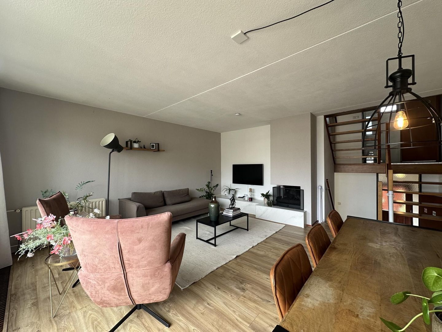 Via de trap vanuit de woonkeuken komt u in de woonkamer, die uitkijkt op de Oude Rijn. Dankzij de openslaande deuren en het grote raam stroomt er veel daglicht de woonkamer binnen en geniet u van het mooie uitzicht op het water. De woonkamer heeft een open haard en is afgewerkt met gladde wanden.