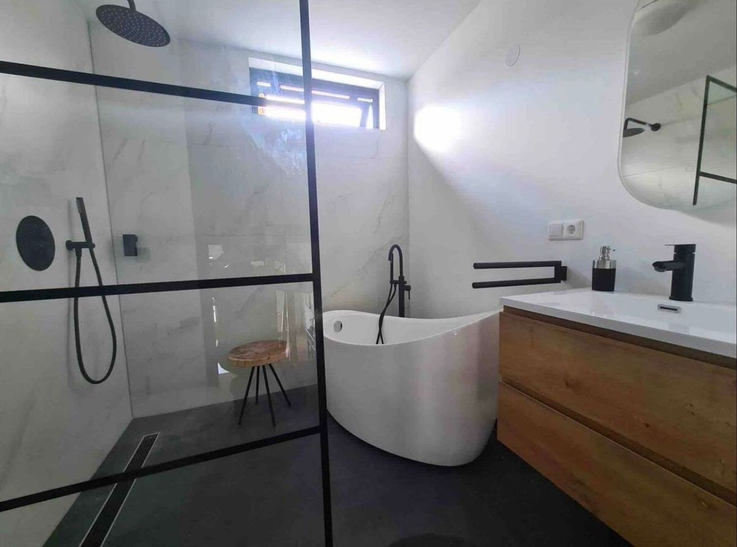 De badkamer, welke recentelijk is vernieuwd, is uitgevoerd met lichte wandtegels in combinatie met donkere vloertegels. Deze bevat een inloopdouche, wastafelmeubel, hangend toilet en bad.
