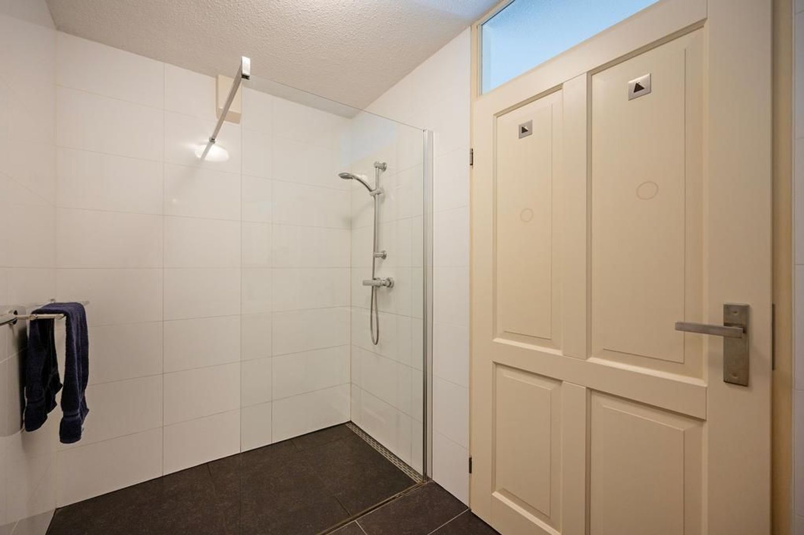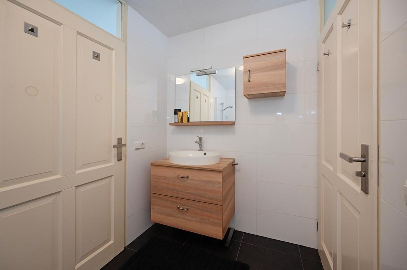 De badkamer is in dezelfde stijl betegeld als de toiletruimte, te weten donkergrijze vloertegels en witte wandtegels. De badkamer is voorzien van een royale inloopdouche plus wastafelmeubel met spiegelkast.