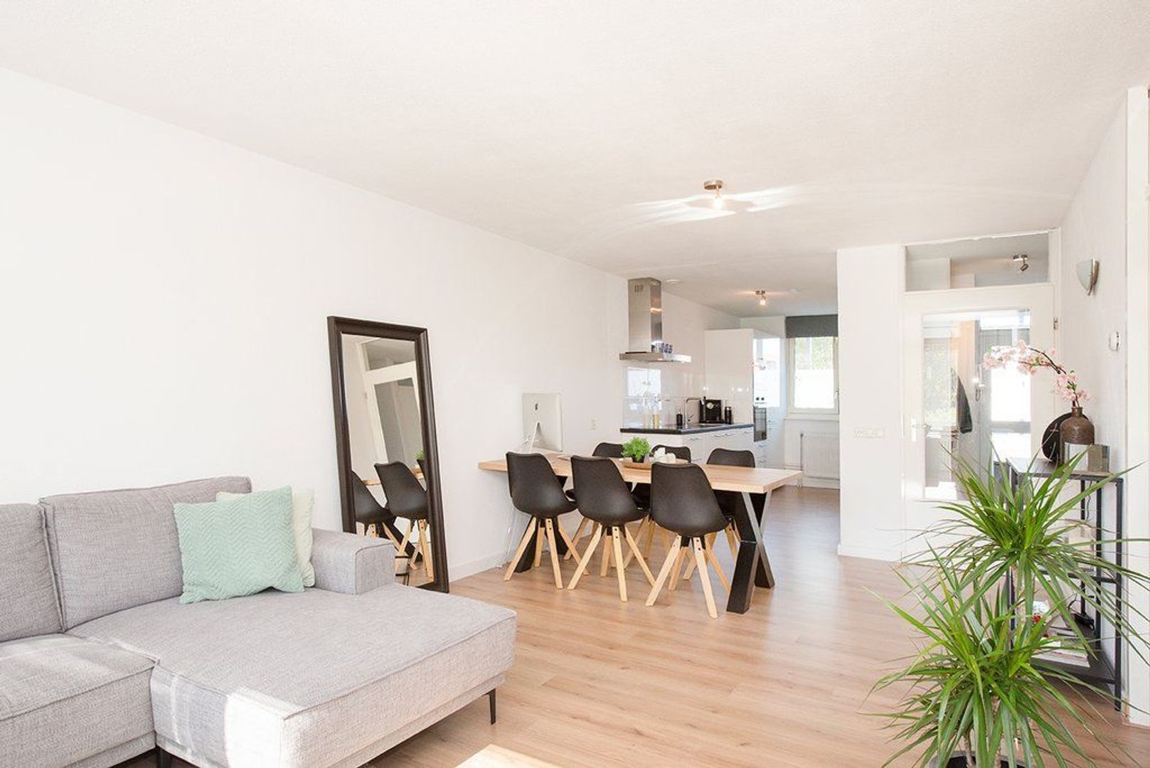 Ruime woonkamer voorzien van luxe laminaatvloer en glad afgewerkte wanden.