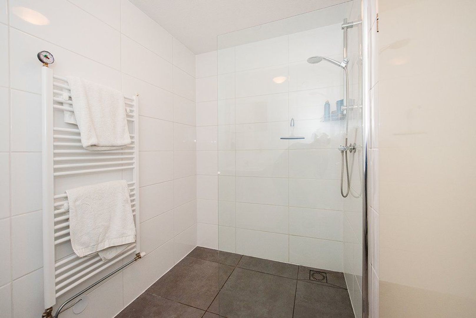 De badkamer is voorzien van een royale inloopdouche, wastafel, wasmachine en wasdroger opstelling.