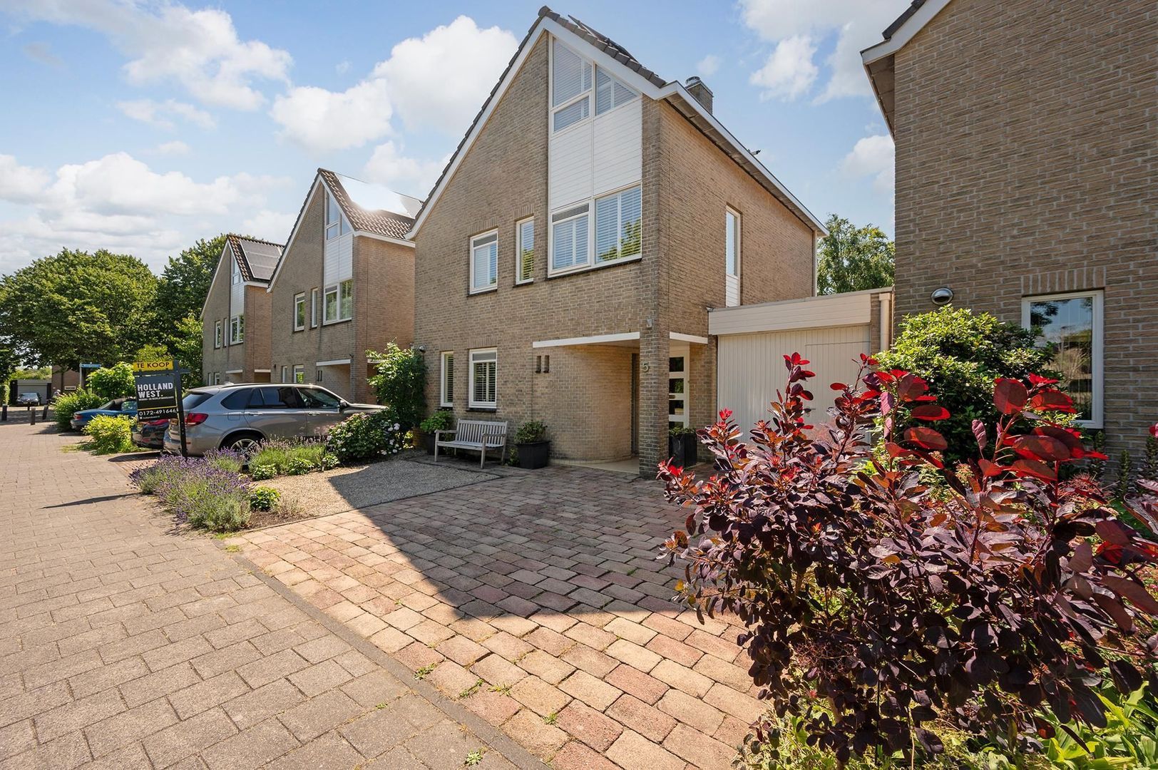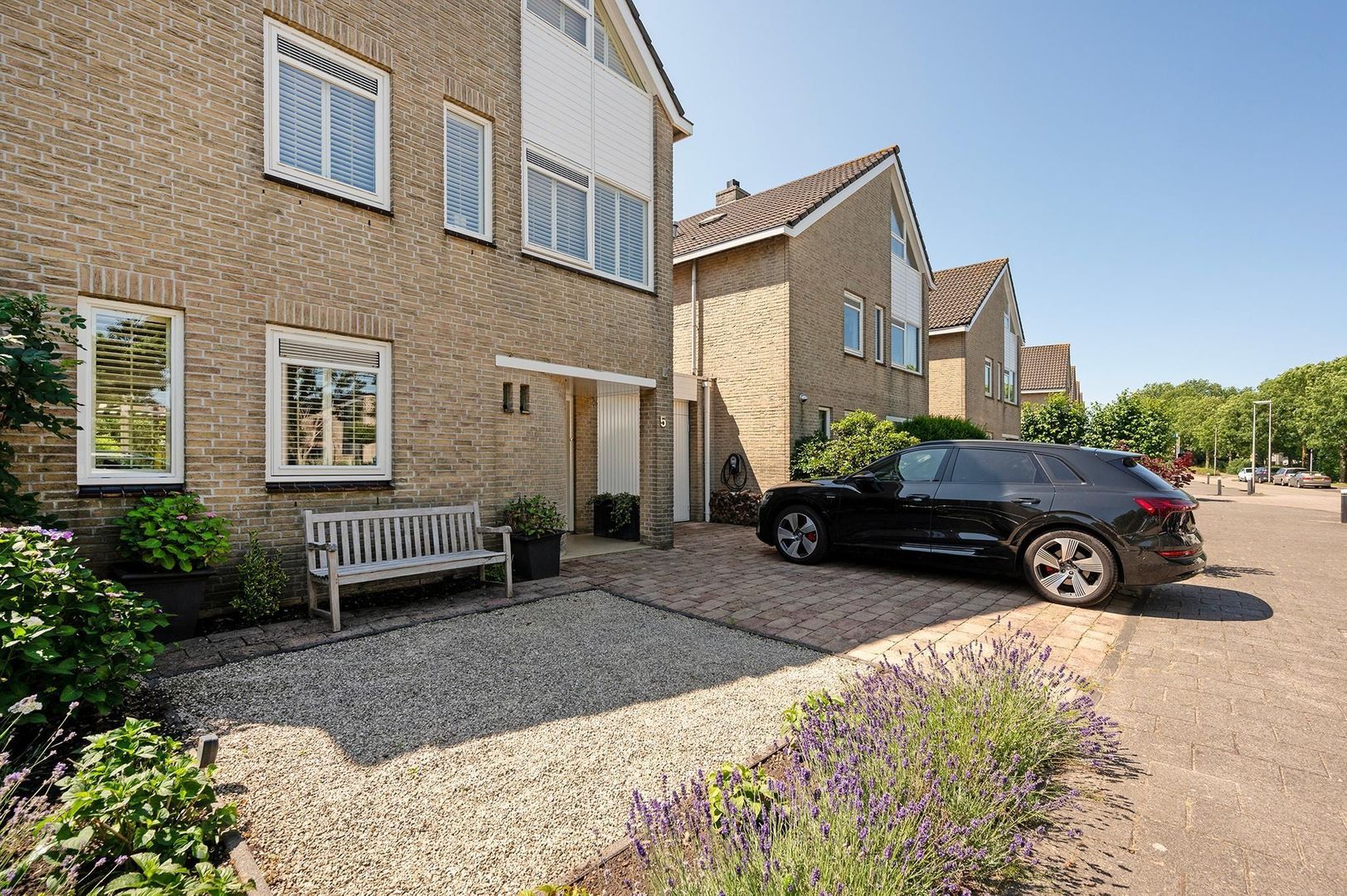 Riante voortuin met oprit voor meerdere auto’s en garage