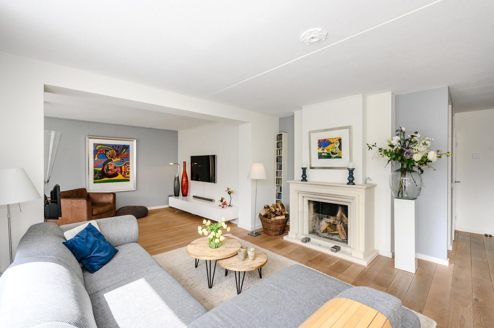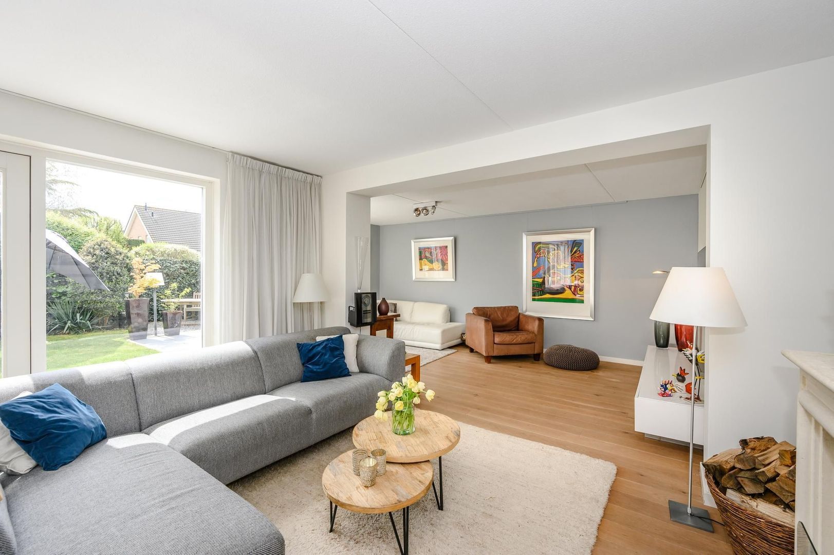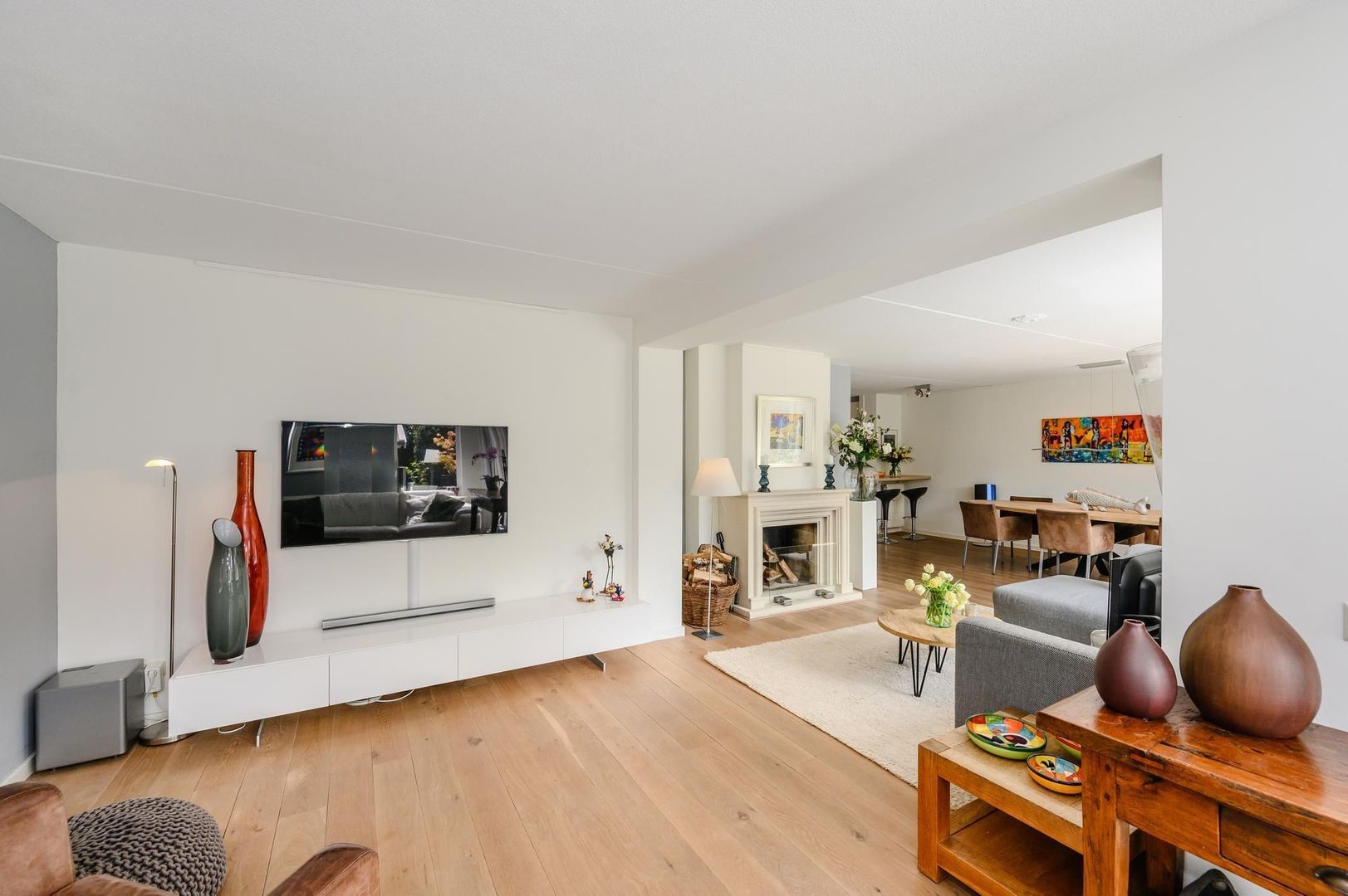 Bij binnenkomst in de living wordt u overvallen door de prettige lichtinval welke van beide kanten de woning binnenkomt. Aan de voorzijde van de woning is de keuken gesitueerd welke is voorzien van een Siemens magnetron, oven en vaatwasser. De koelkast en vriezer van Miele. Verder beschikt de keuken over een 5-pits gaskookplaat, afzuigkap en meer dan voldoende bergruimte. De keuken loopt vervolgens met een bar, over in het eetkamergedeelte die grenst aan de openslaande deuren die toegang geven tot de achtertuin. Naast de eettafel bevindt zich de zithoek welke beschikt over een gezellige openhaard met schouw van Anneke Dekkers. Dankzij de uitbouw is er ook nog een ruime tv-kamer gecreëerd. .