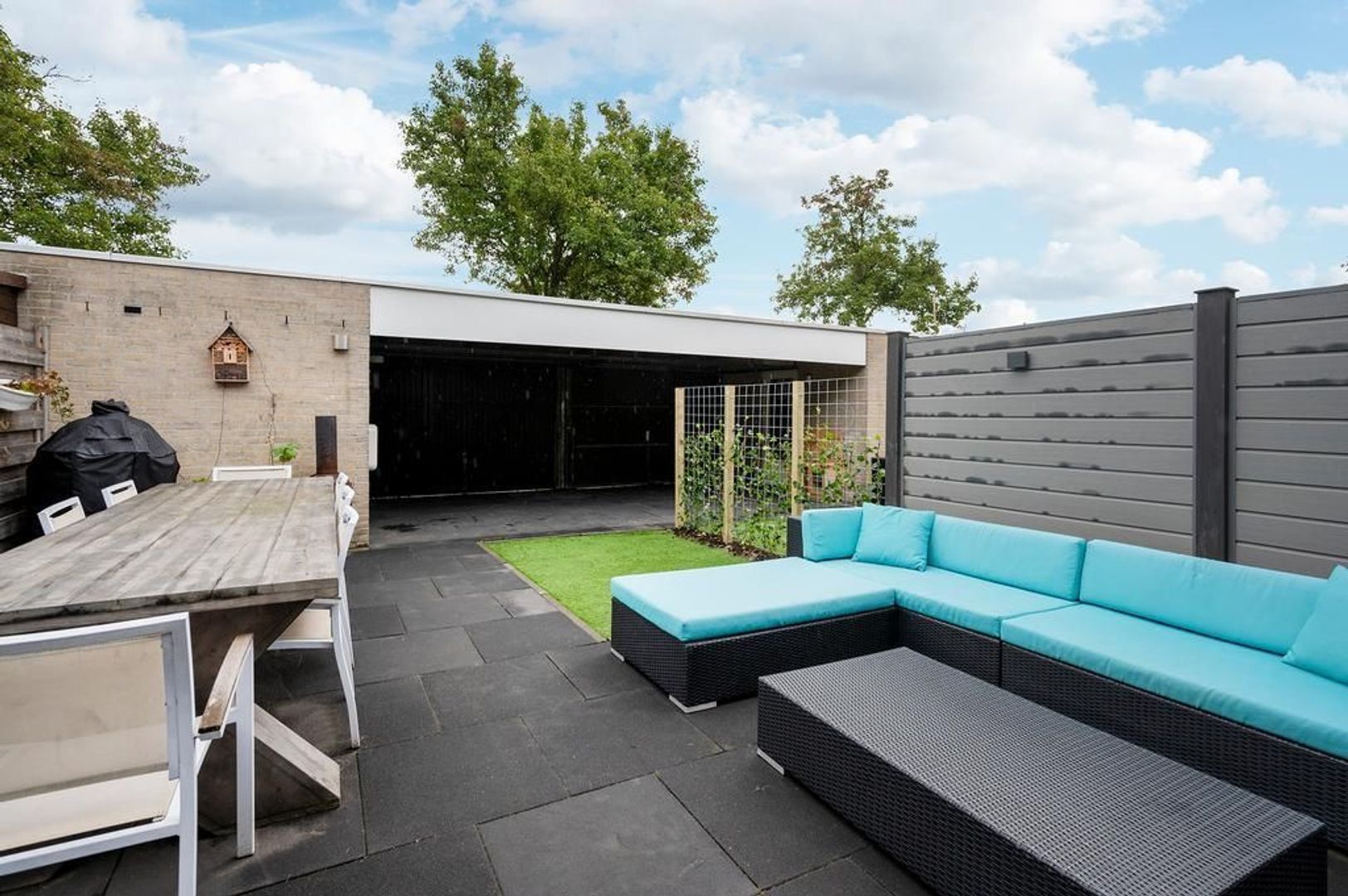 Zeer nette achtertuin met een goede verdeling tussen tegelwerk en kunstgras. Achterin de tuin is een carport te vinden en een berging.