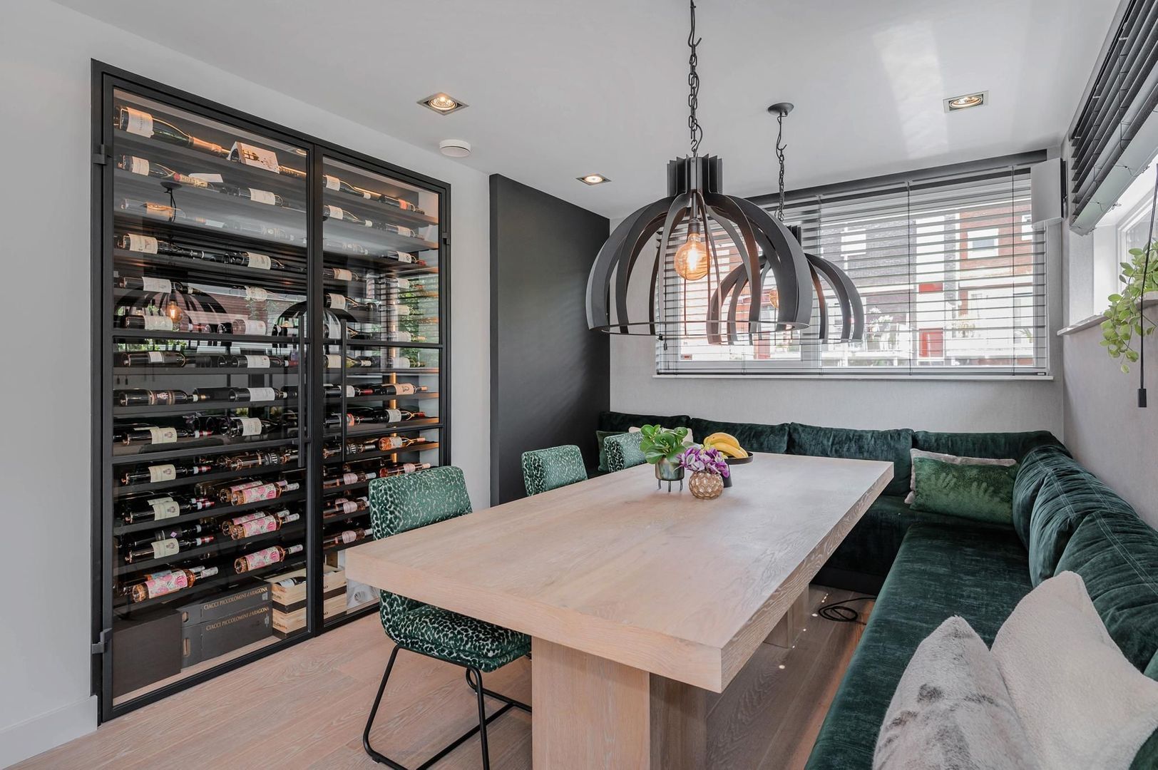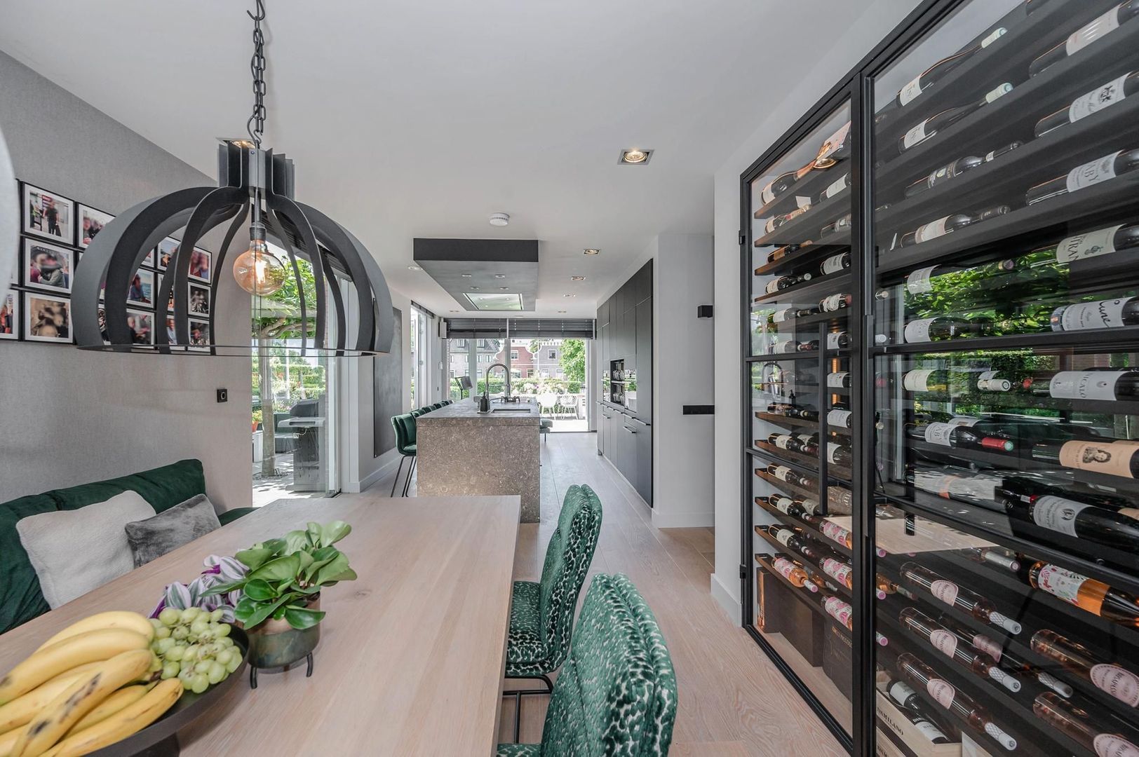 De luxe woonkeuken, uitgerust met een stijlvol kookeiland, biedt alles wat een moderne keuken nodig heeft: een inductiekookplaat met gas wokbrander, een in het plafond geïntegreerde afzuigkap, twee combimagnetron-ovens, een vaatwasser, een koelkast en een vriezer. Aan opbergruimte is er geen gebrek dankzij de slimme wandindeling en het praktische kookeiland. De gezellige bar met plek voor vijf personen en de fraaie combinatie van hout en gebrand graniet zorgen voor een warme en uitnodigende sfeer. Aan de voorzijde van de woning is bovendien een sfeervolle eethoek gecreëerd met een chique wijnkast.