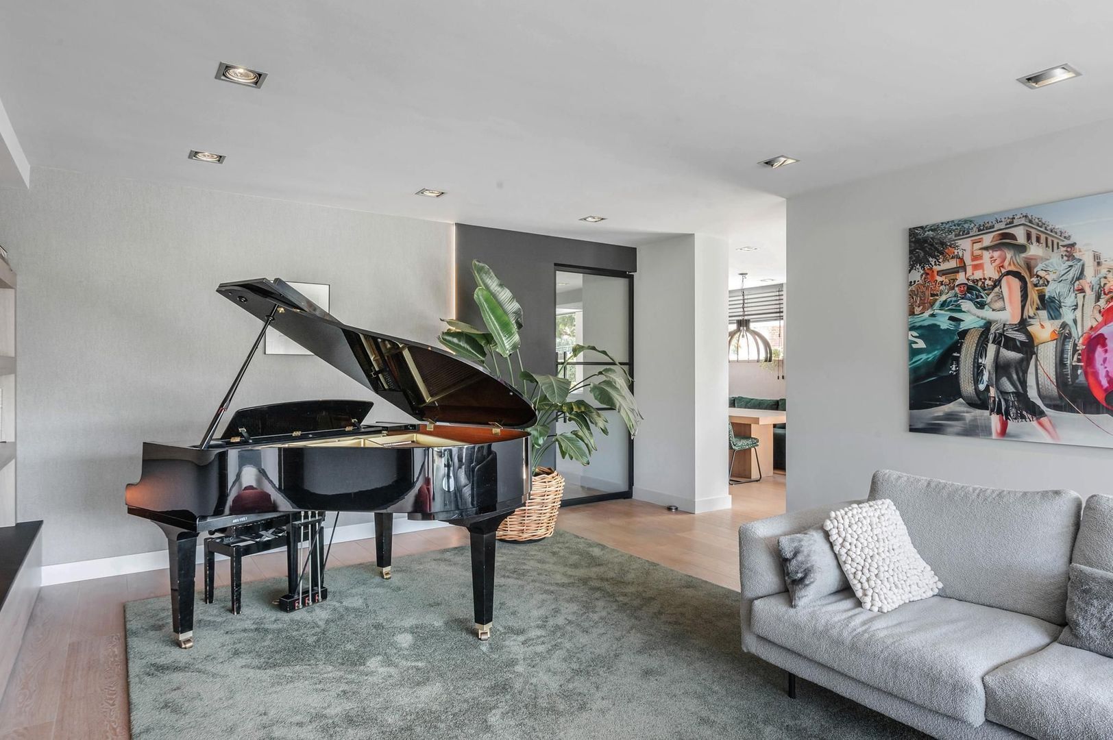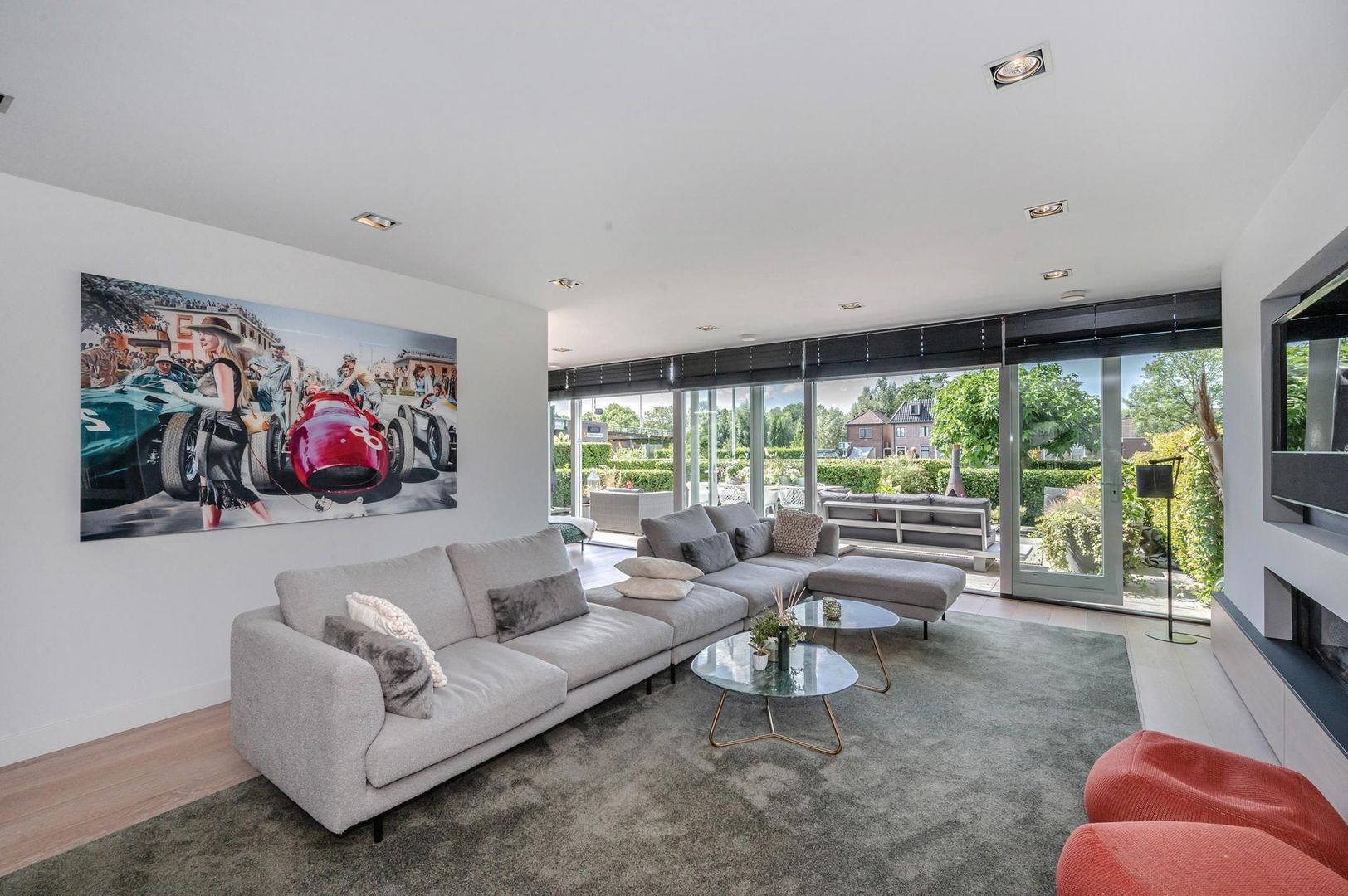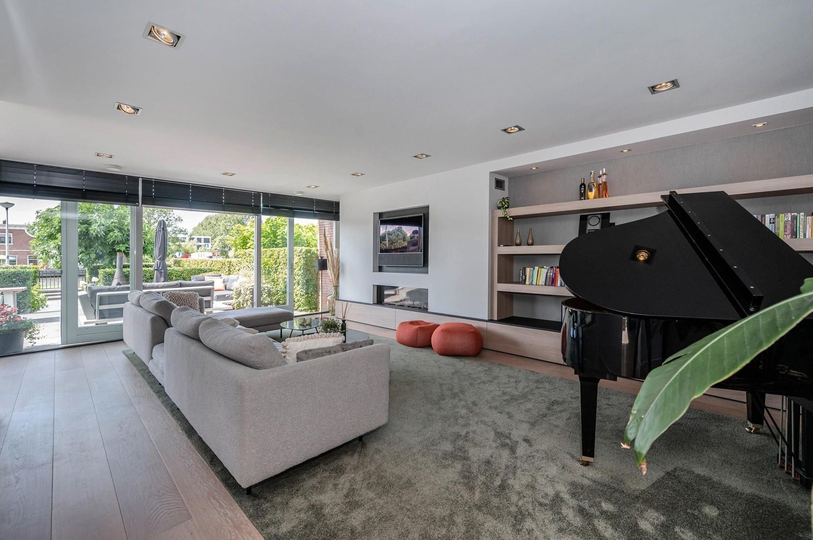 De recent gerenoveerde woonkamer straalt warmte en luxe uit en biedt via openslaande deuren direct toegang tot de tuin, waar u continu kunt genieten van het prachtige uitzicht op zowel de tuin als het water.