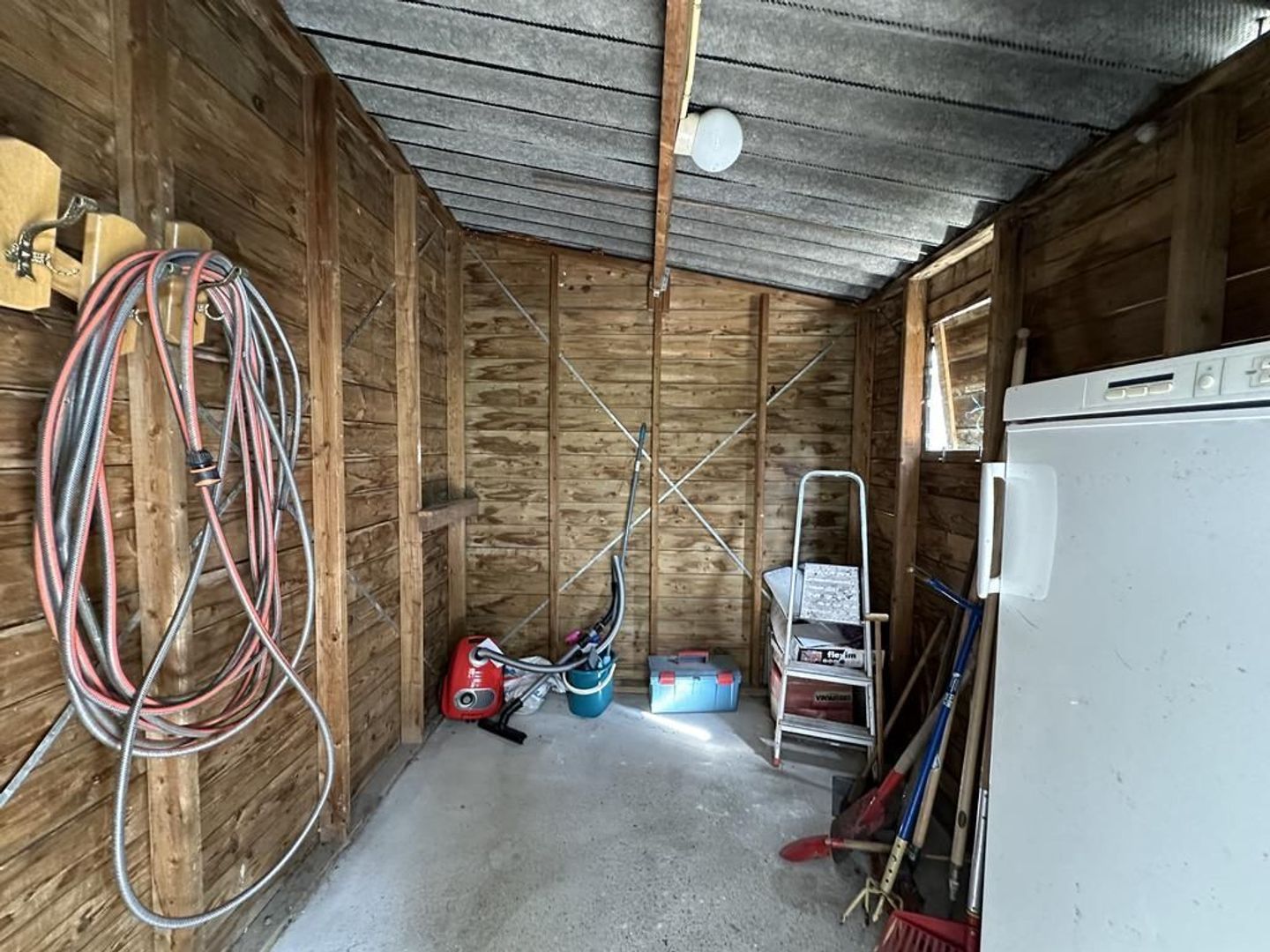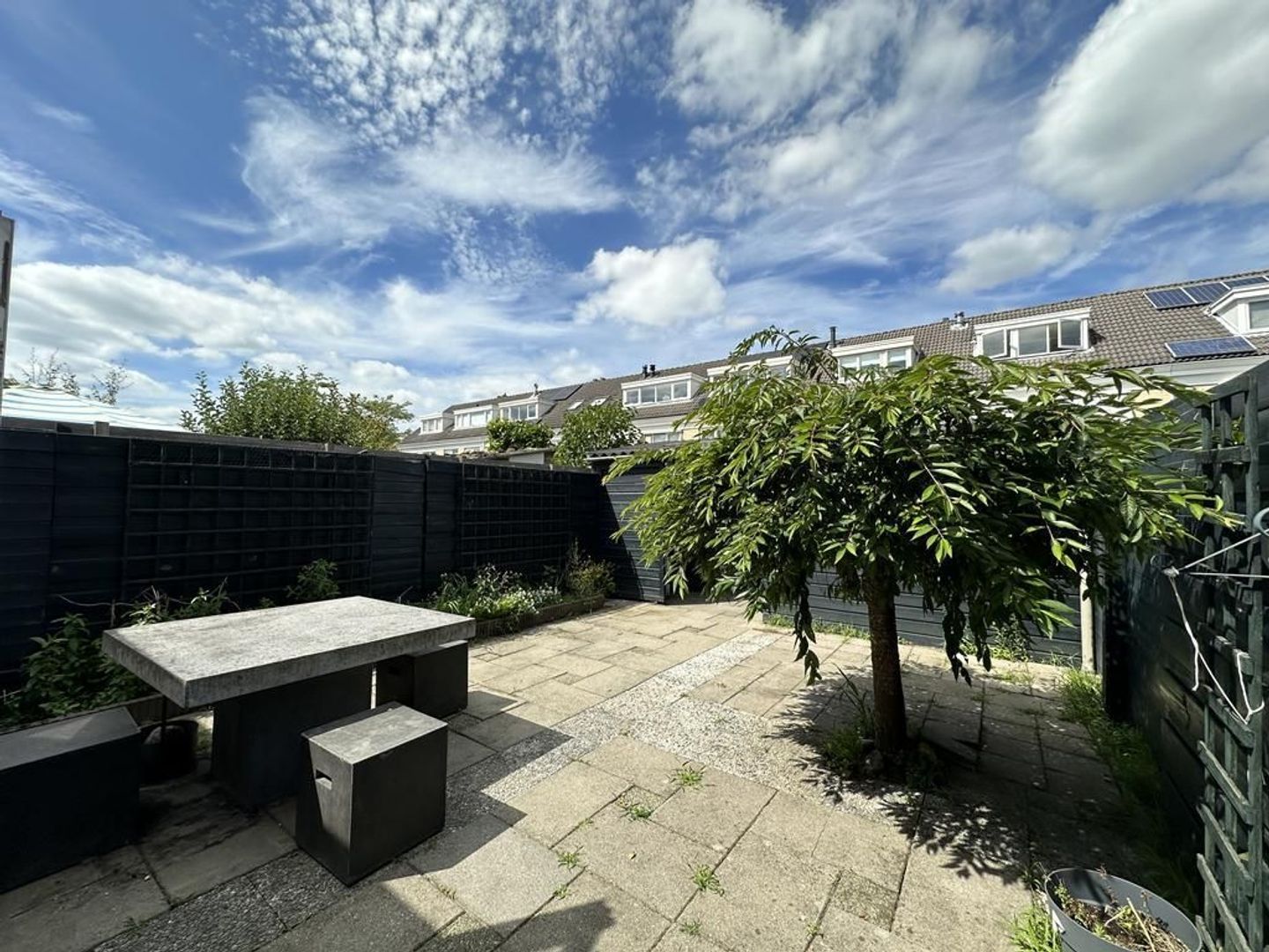 De strakke, onderhoudsvriendelijke tuin heeft aan de linkerzijde een border. Aan de rechterzijde heeft u een poort gelegen aan de steeg en achterin is de houten berging met elektra en verlichting.