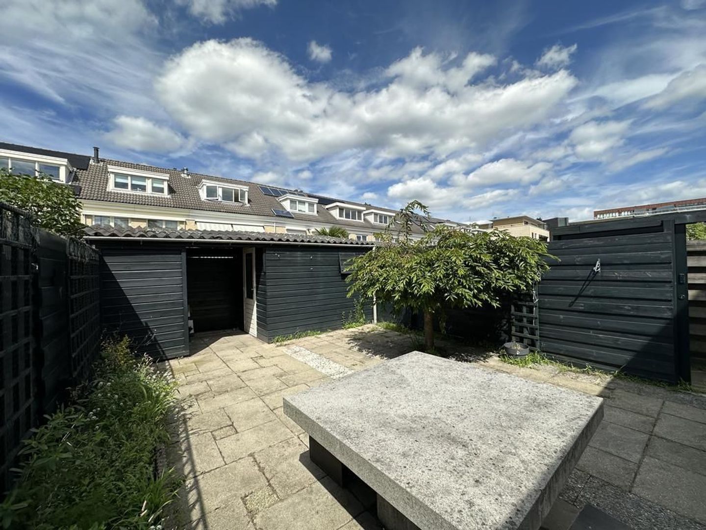 De strakke, onderhoudsvriendelijke tuin heeft aan de linkerzijde een border. Aan de rechterzijde heeft u een poort gelegen aan de steeg en achterin is de houten berging met elektra en verlichting.