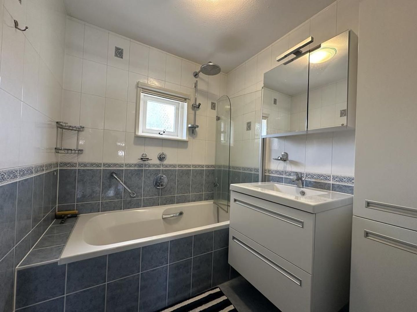 De badkamer is volledig betegeld en beschikt over een ligbad met douche en wastafel met meubel.