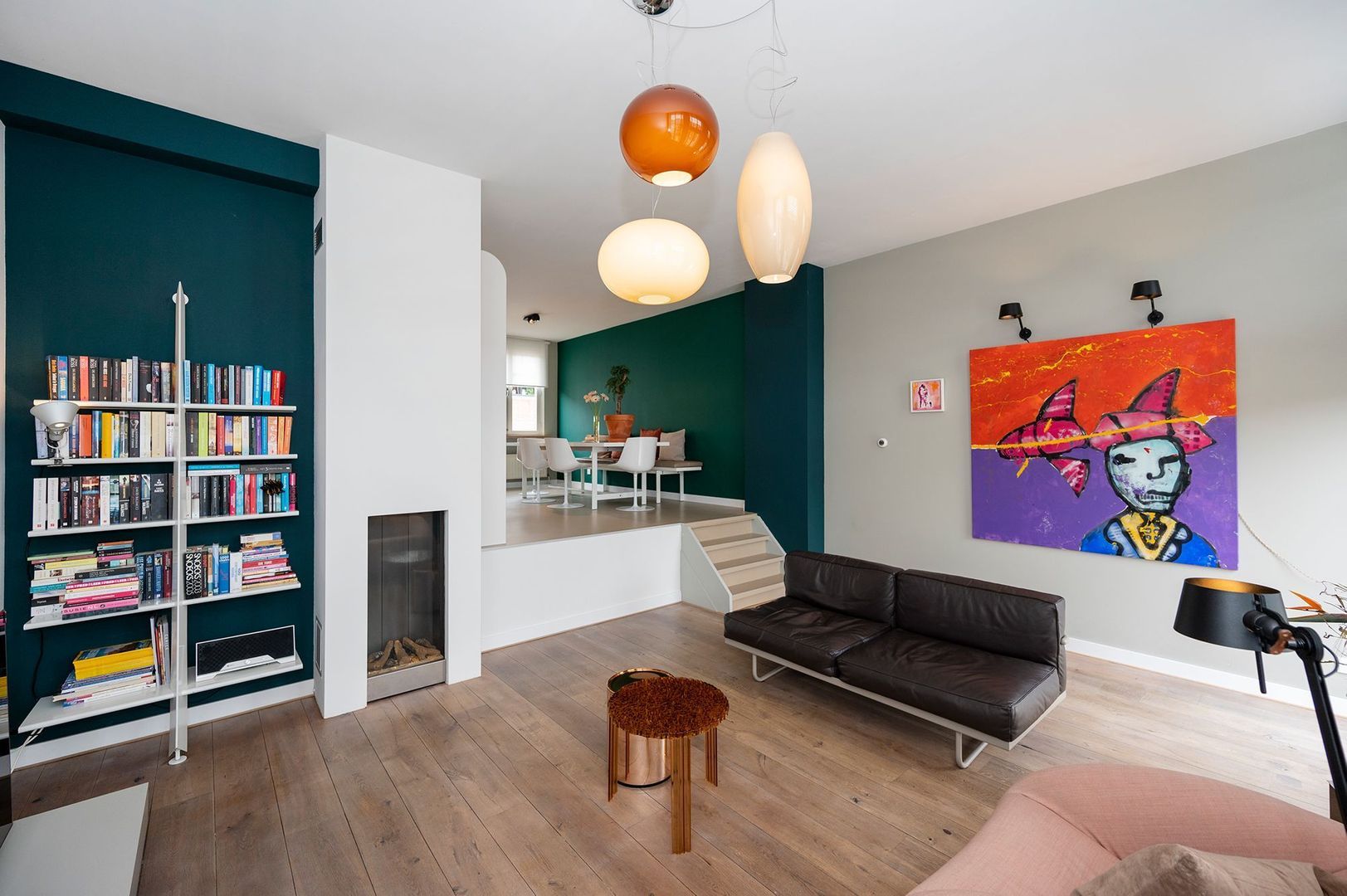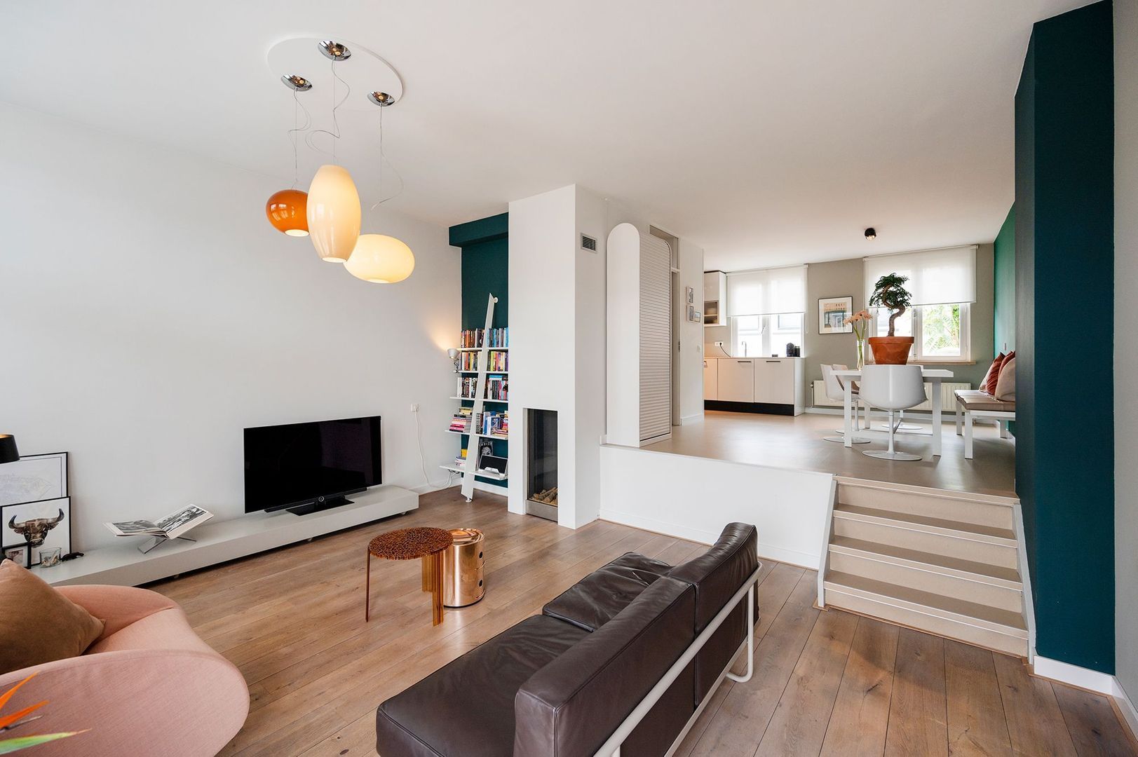 Omdat de living enkele treden lager ligt heeft deze een hoog plafond en hoge raampartijen. Hierdoor heeft u zowel vanuit de eetkamer als vanuit de living een prachtig uitzicht over het water. De woonkamer is voorzien van een gezellige gashaard en een prachtige eiken vloer in brede delen. Vanuit hier bereikt u het royale terras aan de