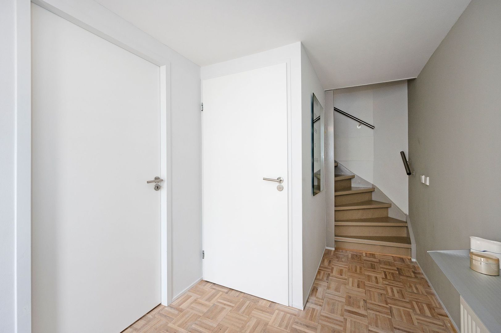 Entree/hal, meterkast, toiletruimte met vrijhangend closet en fonteintje. Middels een geheel nieuwe pui met draaikiepdeuren is in de voormalige garage een werkkamer/atelier gerealiseerd. Deze is voorzien van een eiken mozaïek vloer, vaste kastenwand, trapkast met uitstortgootsteen. Tevens bereikt u vanuit hier de voorkelder en een zeer grote achterkelder op stahoogte.