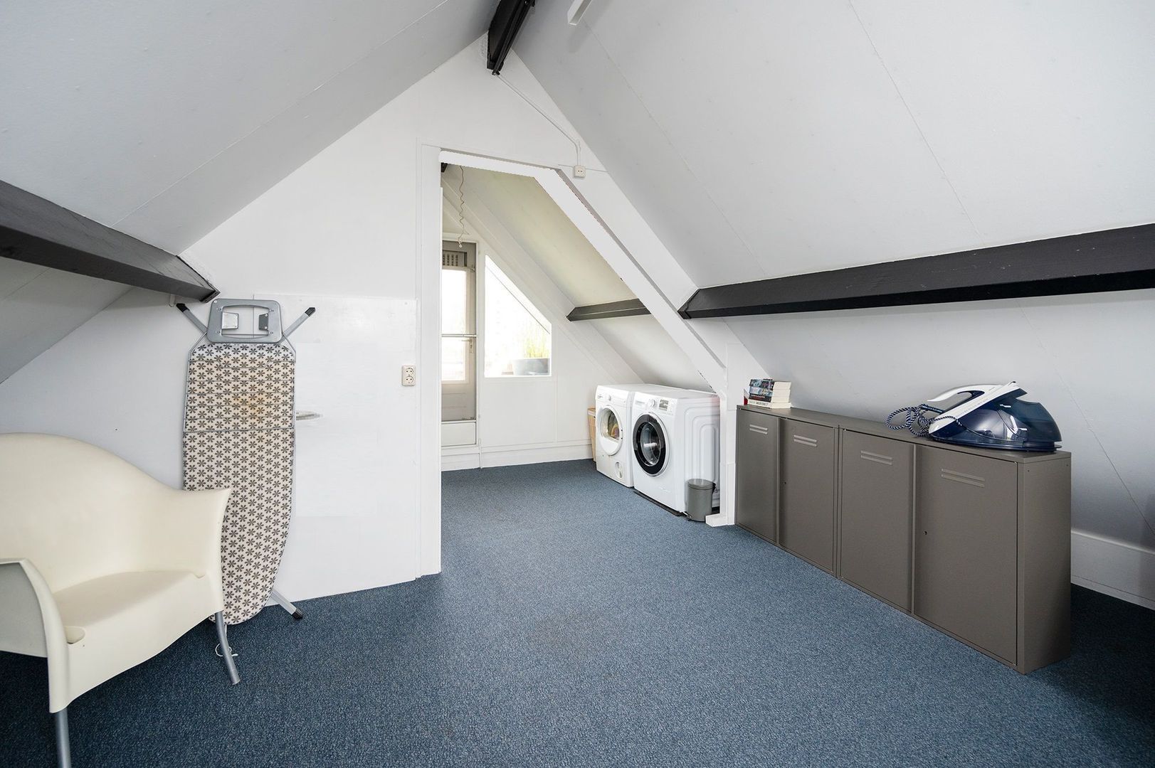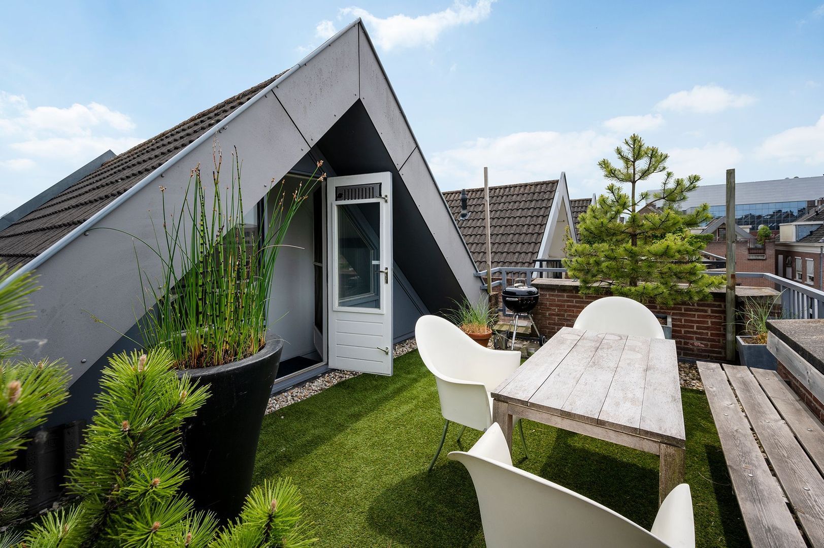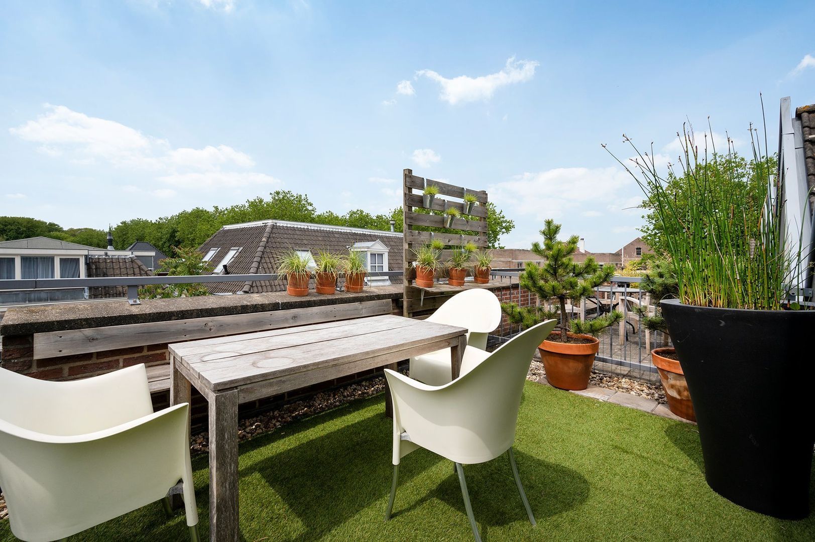 Grote zolderkamer met aan de straatzijde een riant terras met leuk uitzicht over de wijk.