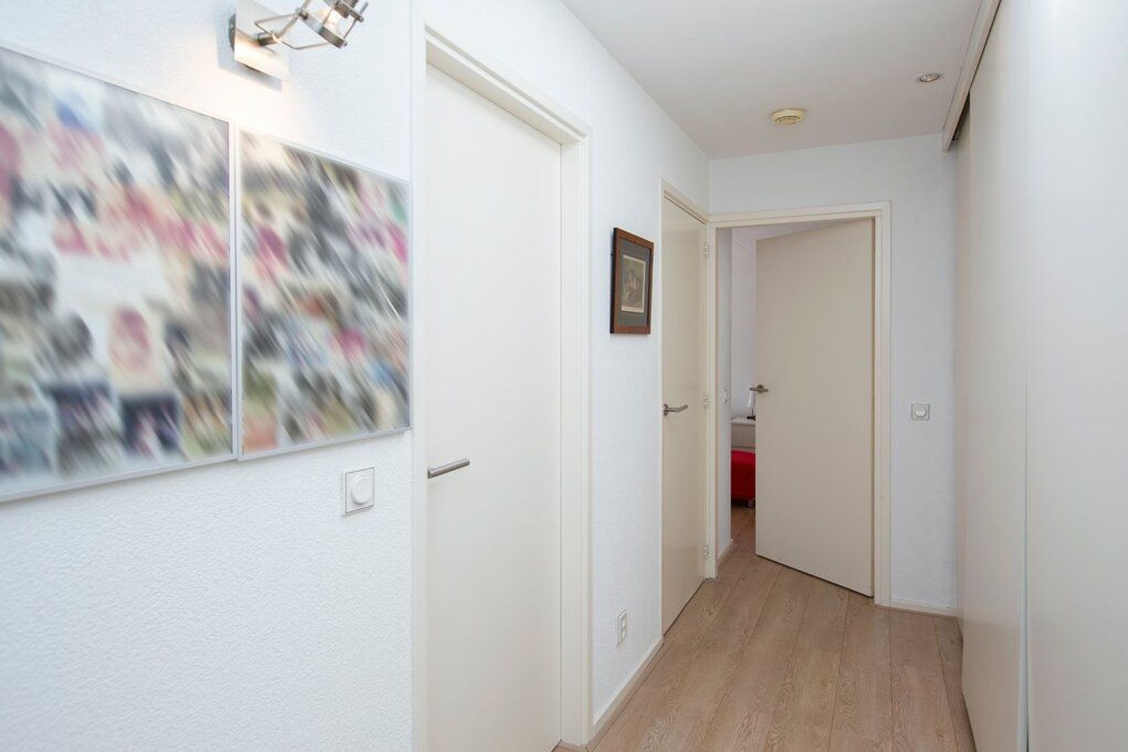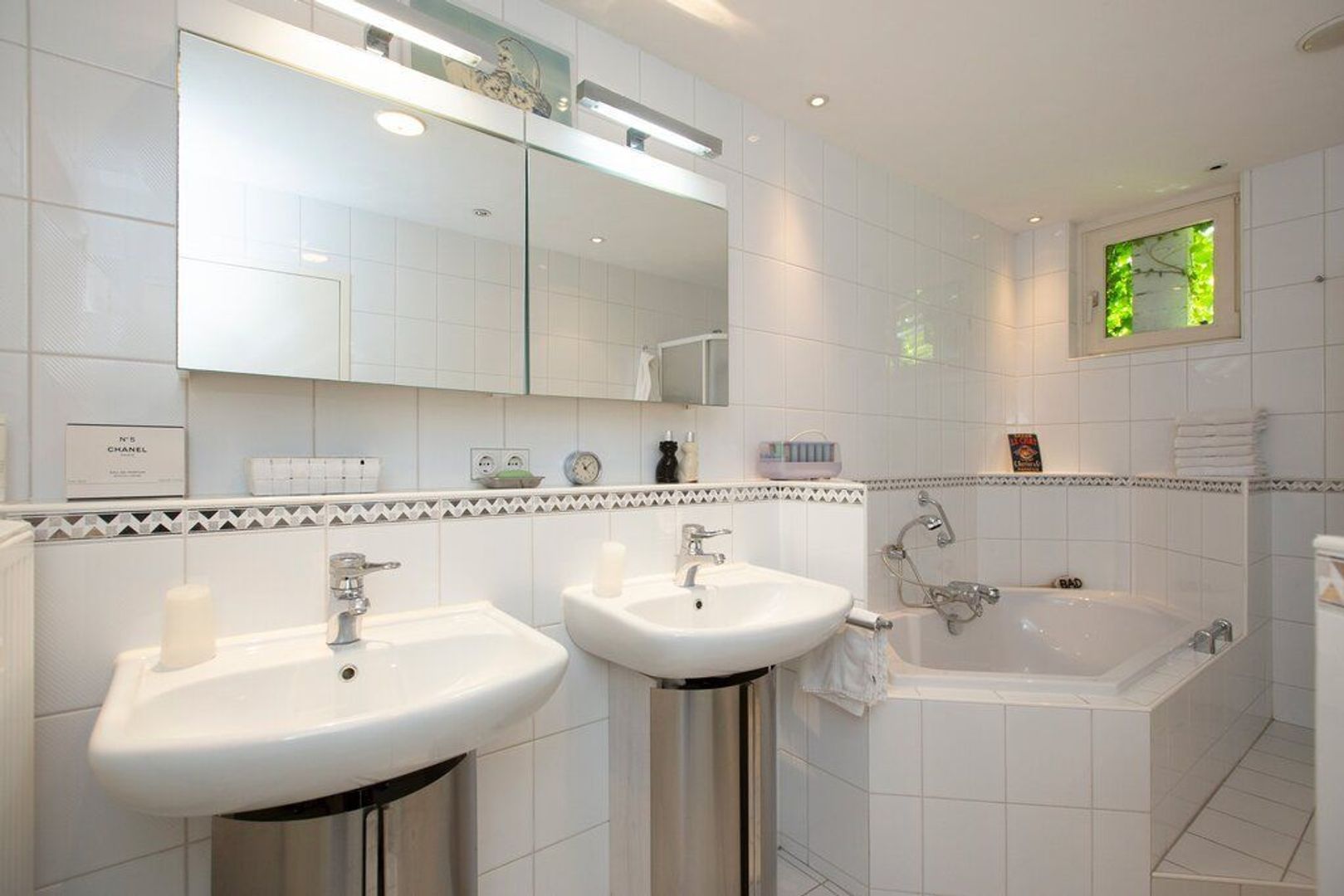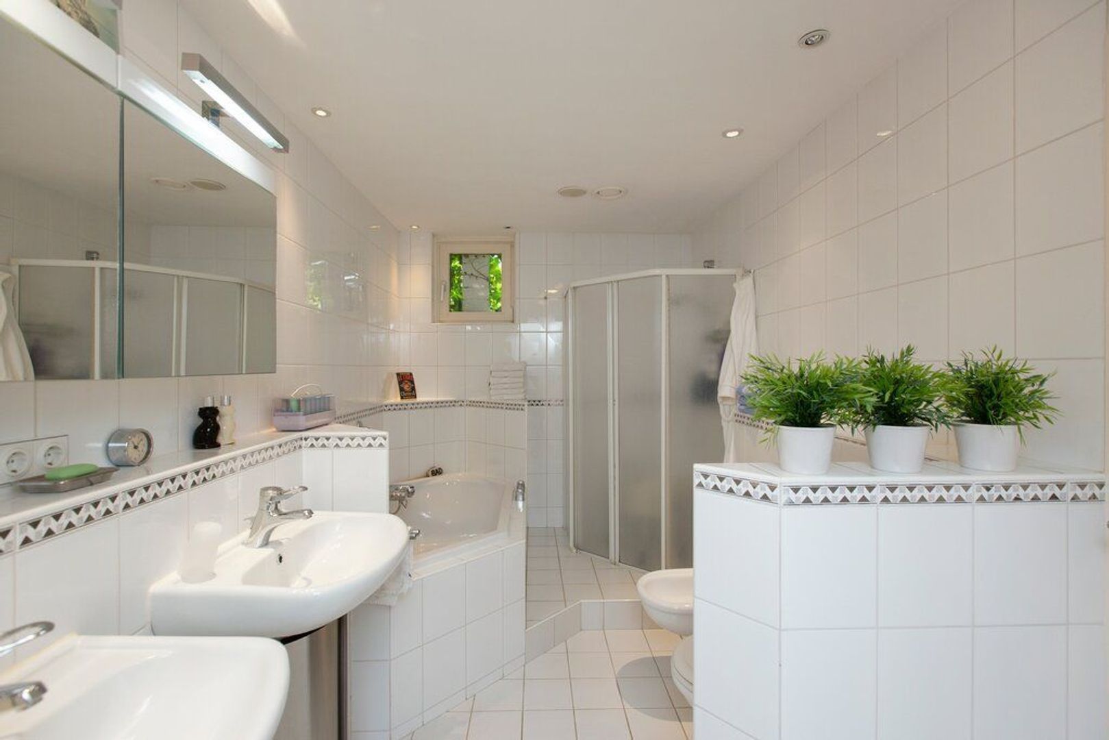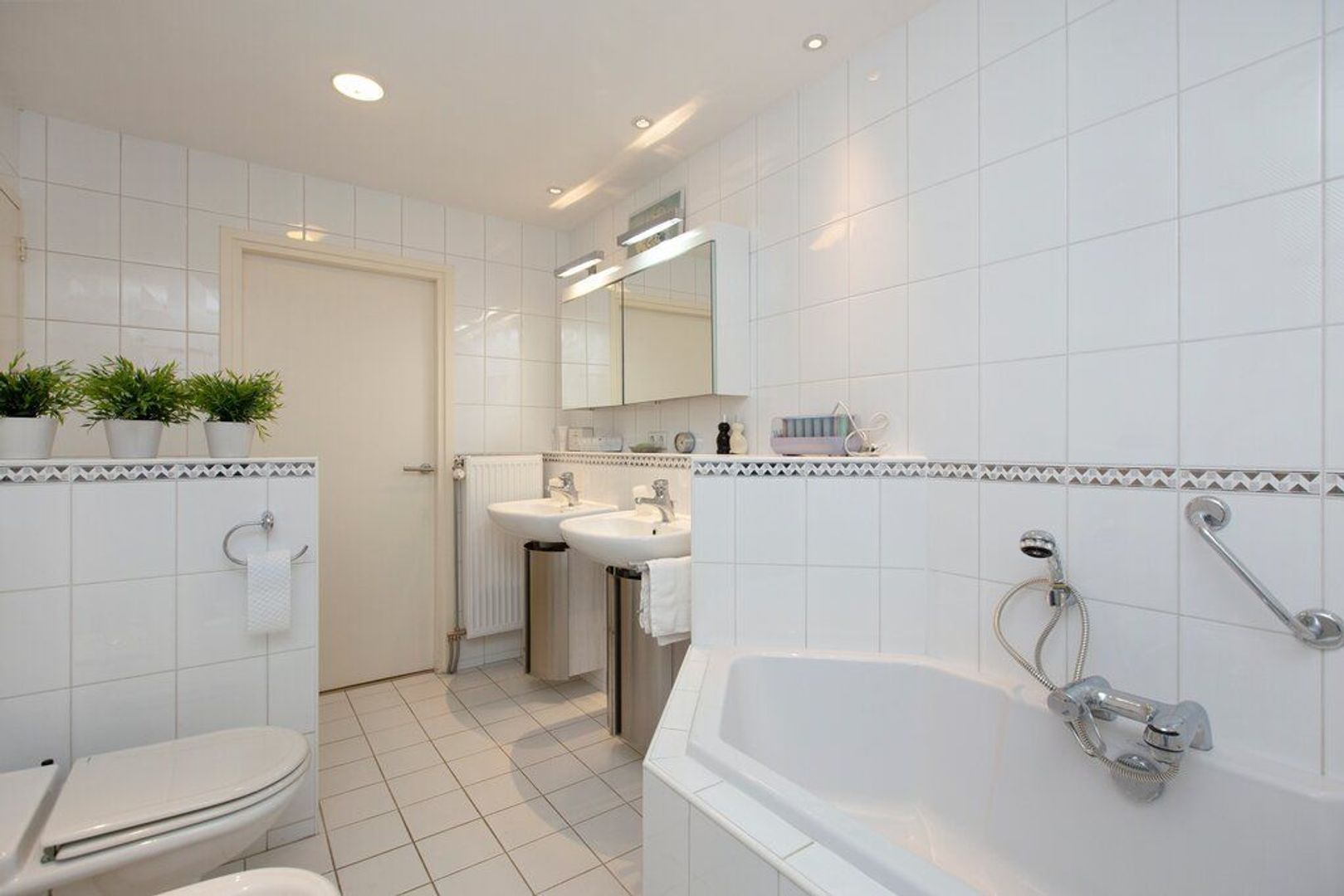 De hal is voorzien van inbouwkasten en laat u toe tot twee royale slaapkamers achterin de woning. Één van deze slaapkamers is verbonden met de badkamer, welke is voorzien van dubbele wastafel, ligbad, toilet, bidet en douchehoek.