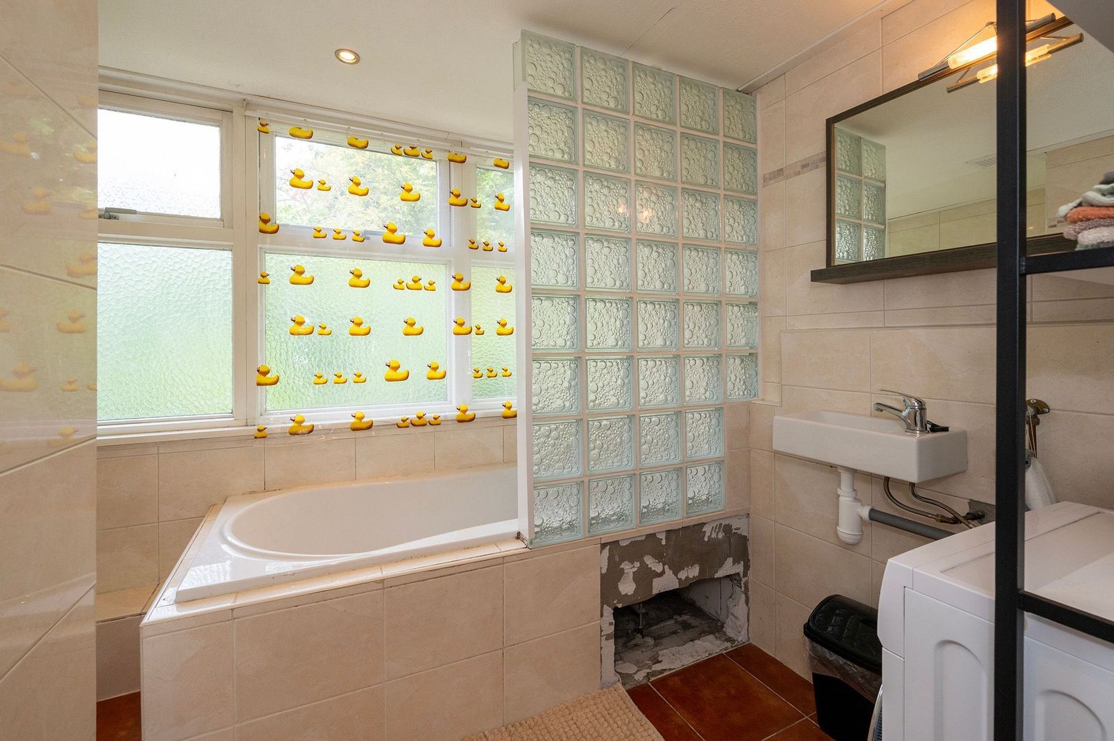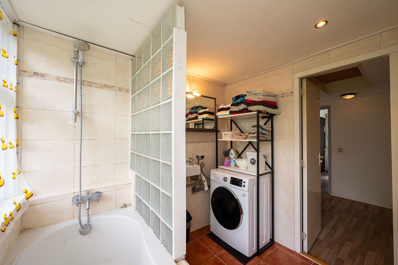 De badkamer is voorzien van een wastafelmeubel, een bad met douche en aansluitingen voor wasmachine en droger.