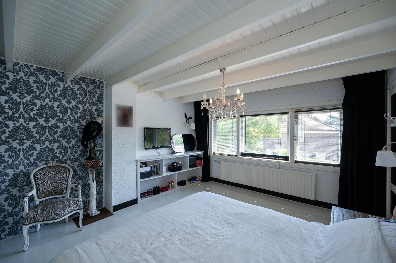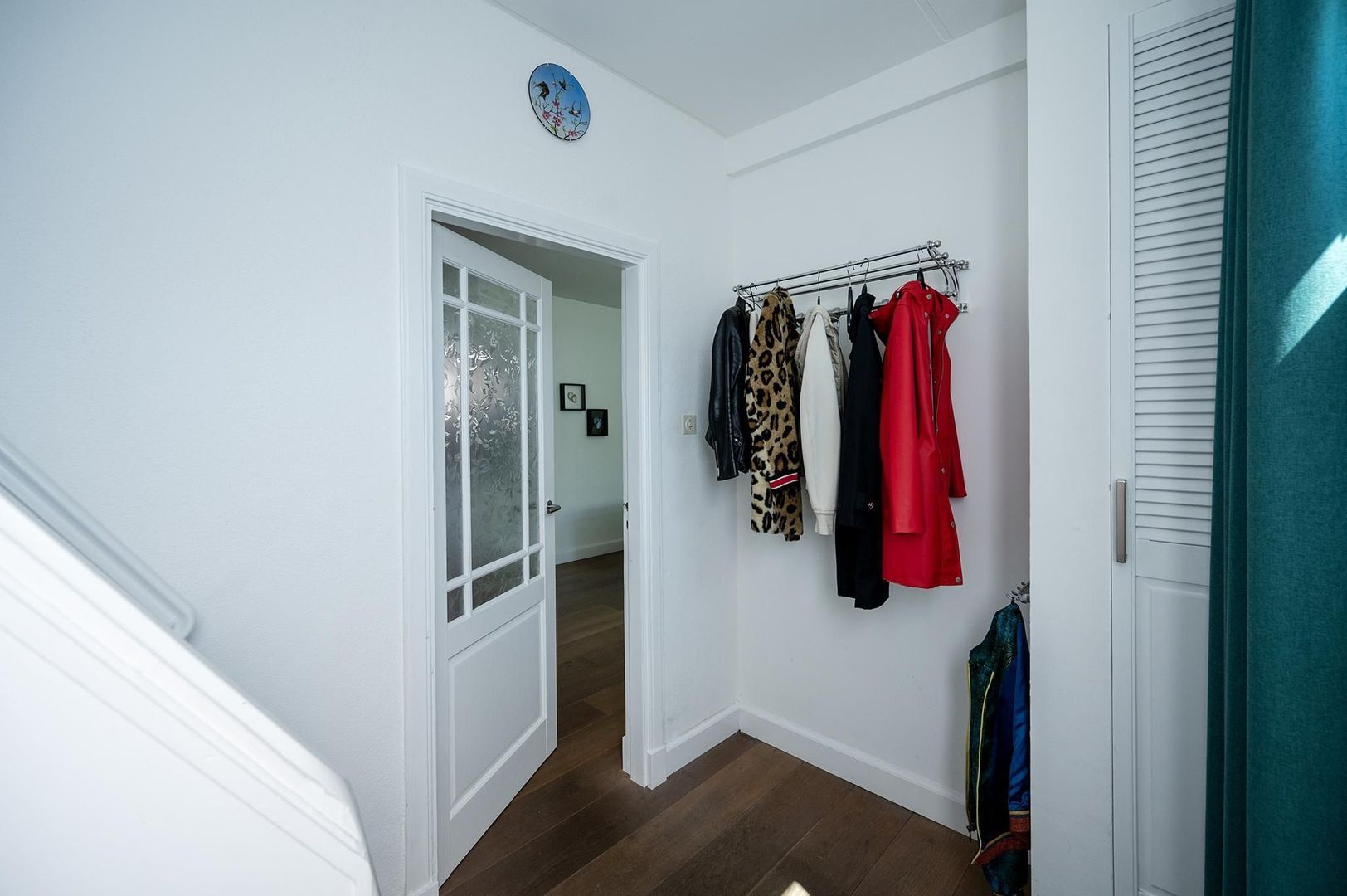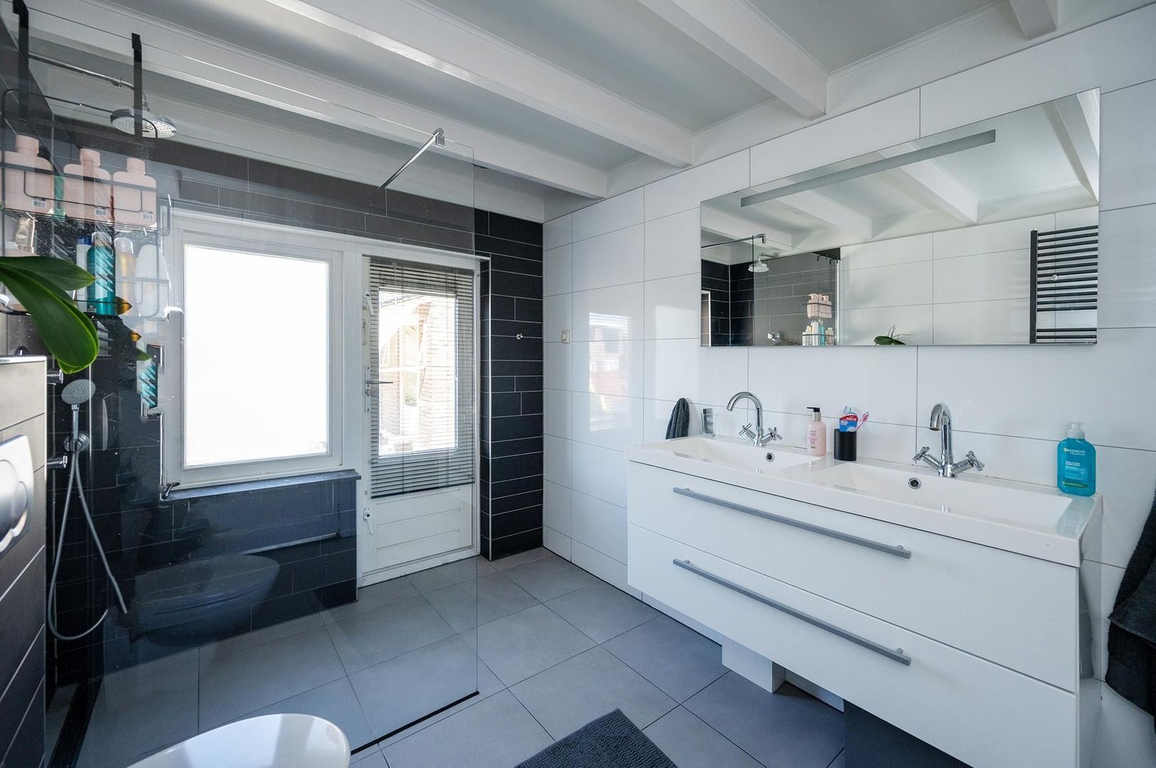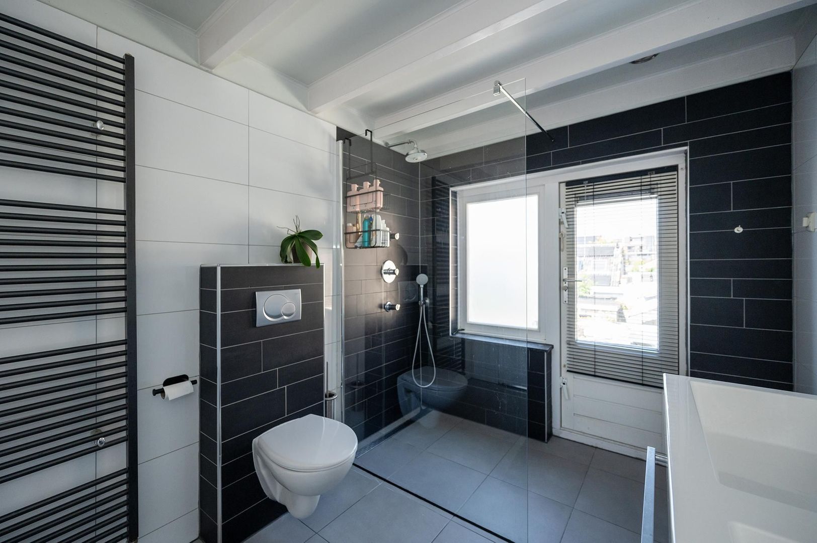 - Lichte overloop met jaren '30 raampartij, twee slaapkamers (inclusief ruime ouderslaapkamer met vaste kast), en een ruime badkamer met dubbele wastafel, tweede toilet, douchehoek met glazen wand, en een hoog balkenplafond.