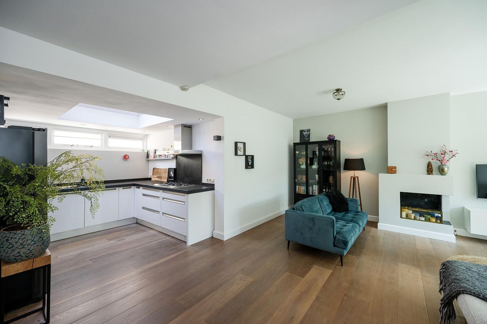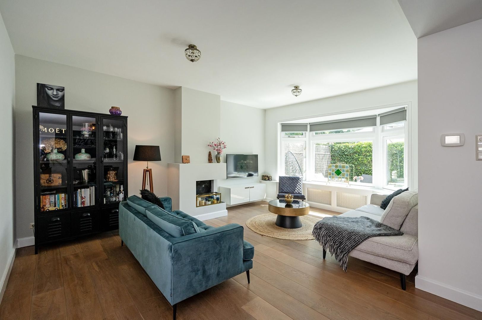 - Onderhoudsvriendelijke voortuin, hal met meterkast en trapopgang, houten vloerdelen, glad gestukte wanden en plafonds, lichte woonkamer met erker en haardpartij, ruime eethoek met voorraadkast, en een strakke witte keuken met lichtkoepel en inbouwapparatuur.