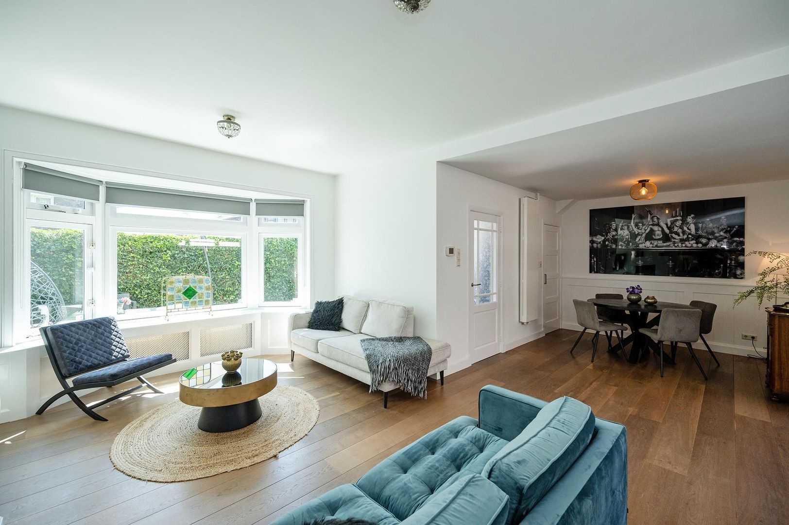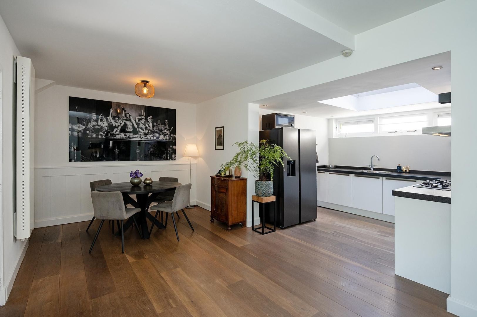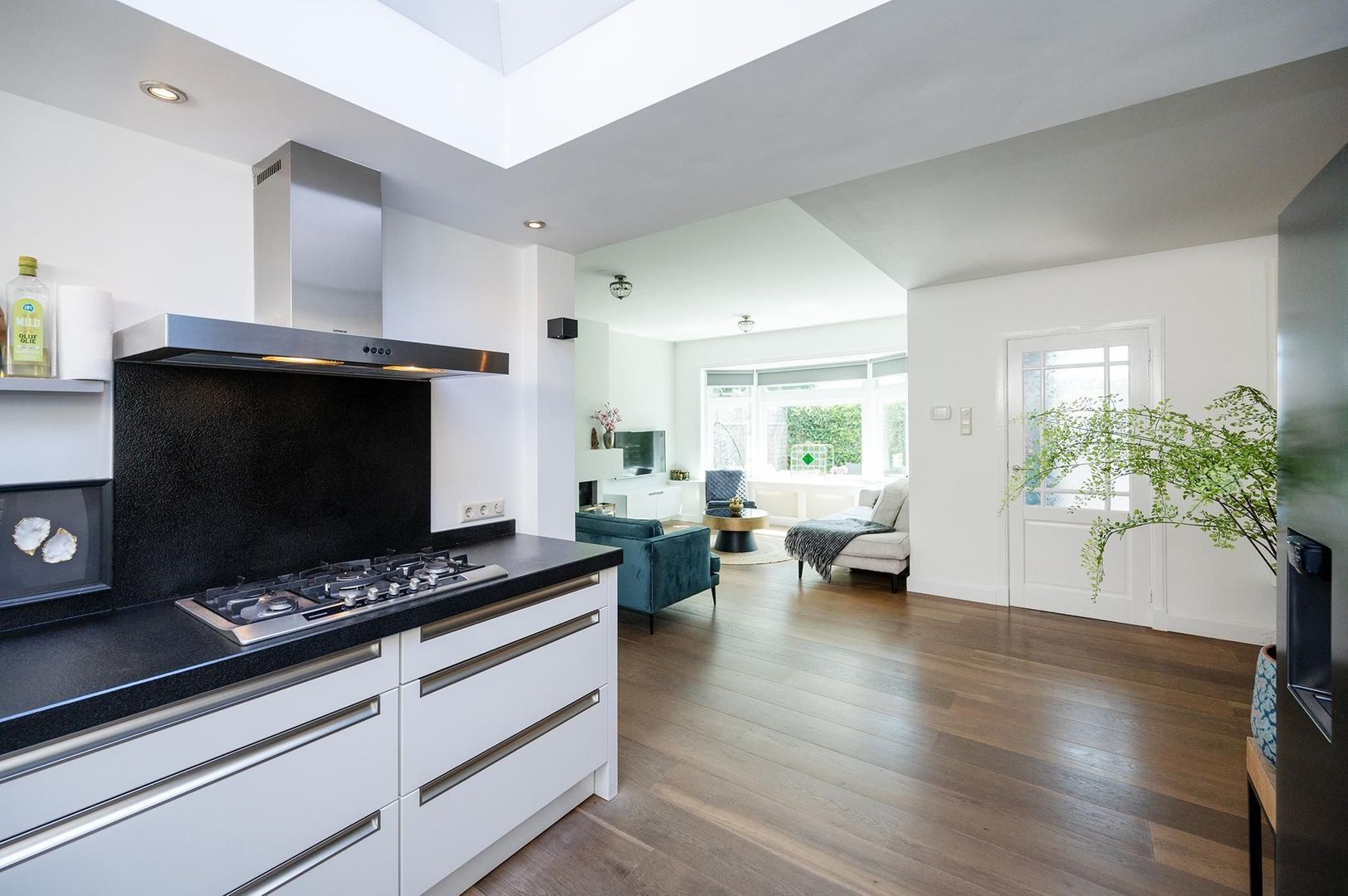 Via de voortuin, die onderhoudsvriendelijk is aangelegd met sierbestrating, betreedt u de woning. Bij binnenkomst komt u in de hal met de meterkast en de trapopgang naar de eerste etage. De begane grond is voorzien van houten vloerdelen, en de wanden en plafonds zijn glad gestukt. Hierdoor is de jaren '30 sfeer behouden gebleven, terwijl de luxe afwerking van nu is toegevoegd. De lichte woonkamer, met erker en een haardpartij, biedt een gezellige sfeer. Aangrenzend vindt u de ruime eethoek met een voorraadkast. De strakke witte keuken met zwart werkblad is uitgerust met diverse inbouwapparatuur. Dankzij het lichtinval van de bovenlichten en de lichtkoepel is de keuken een perfect geïntegreerd onderdeel van de woning.