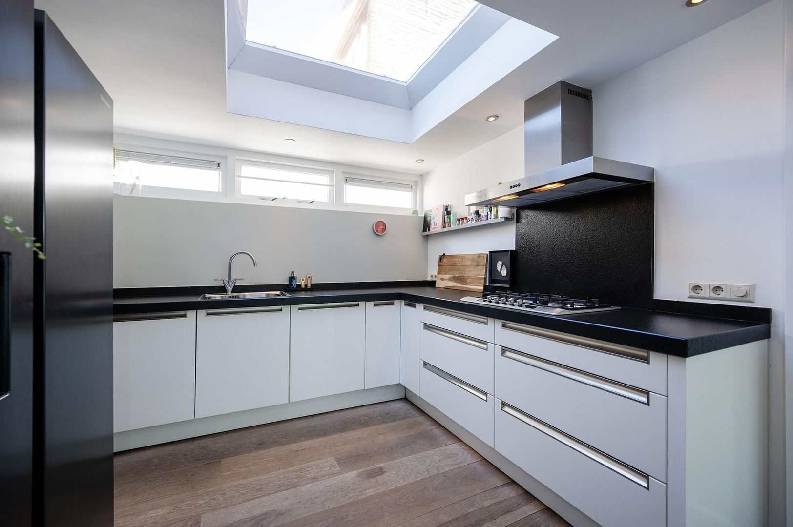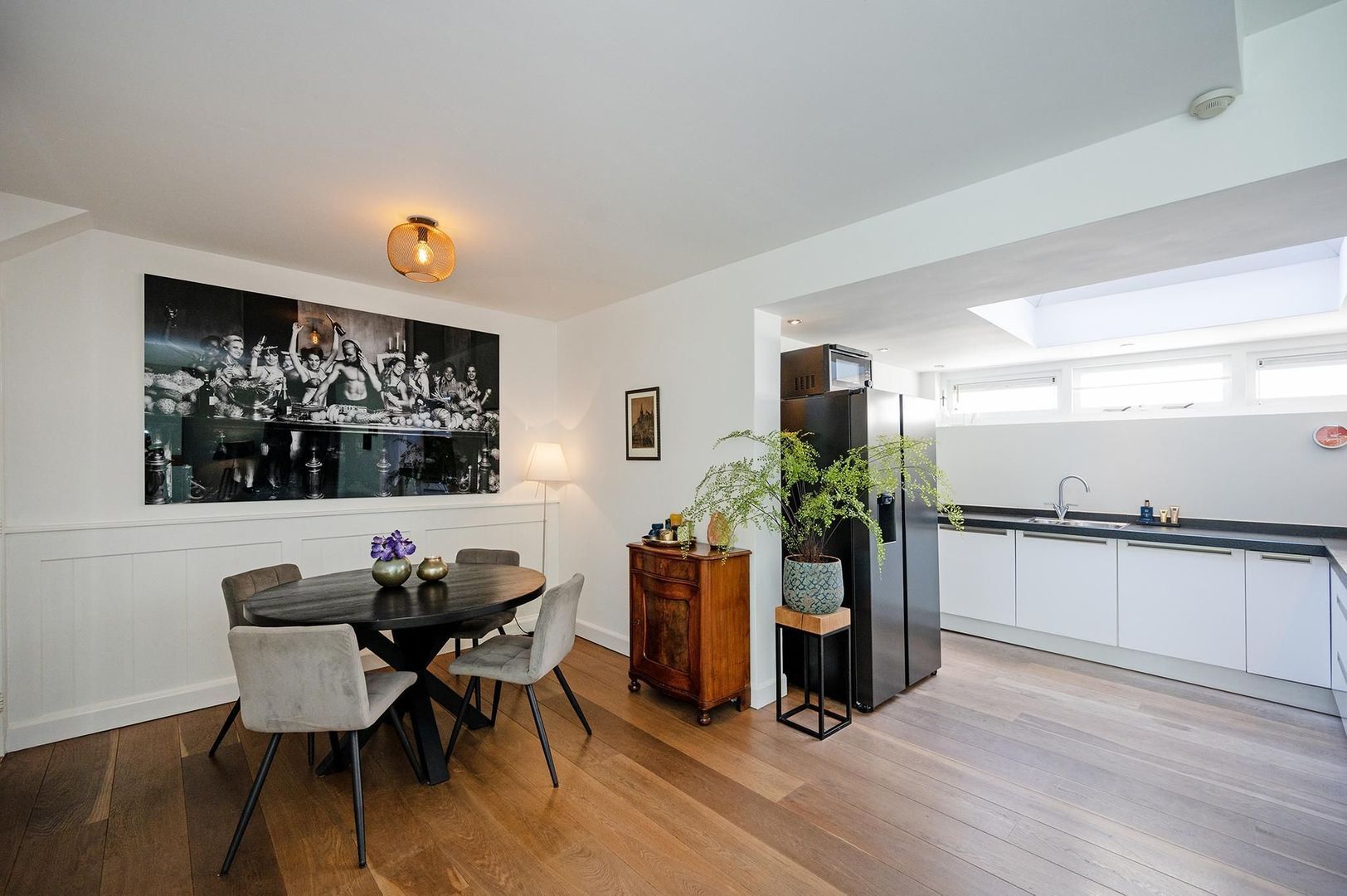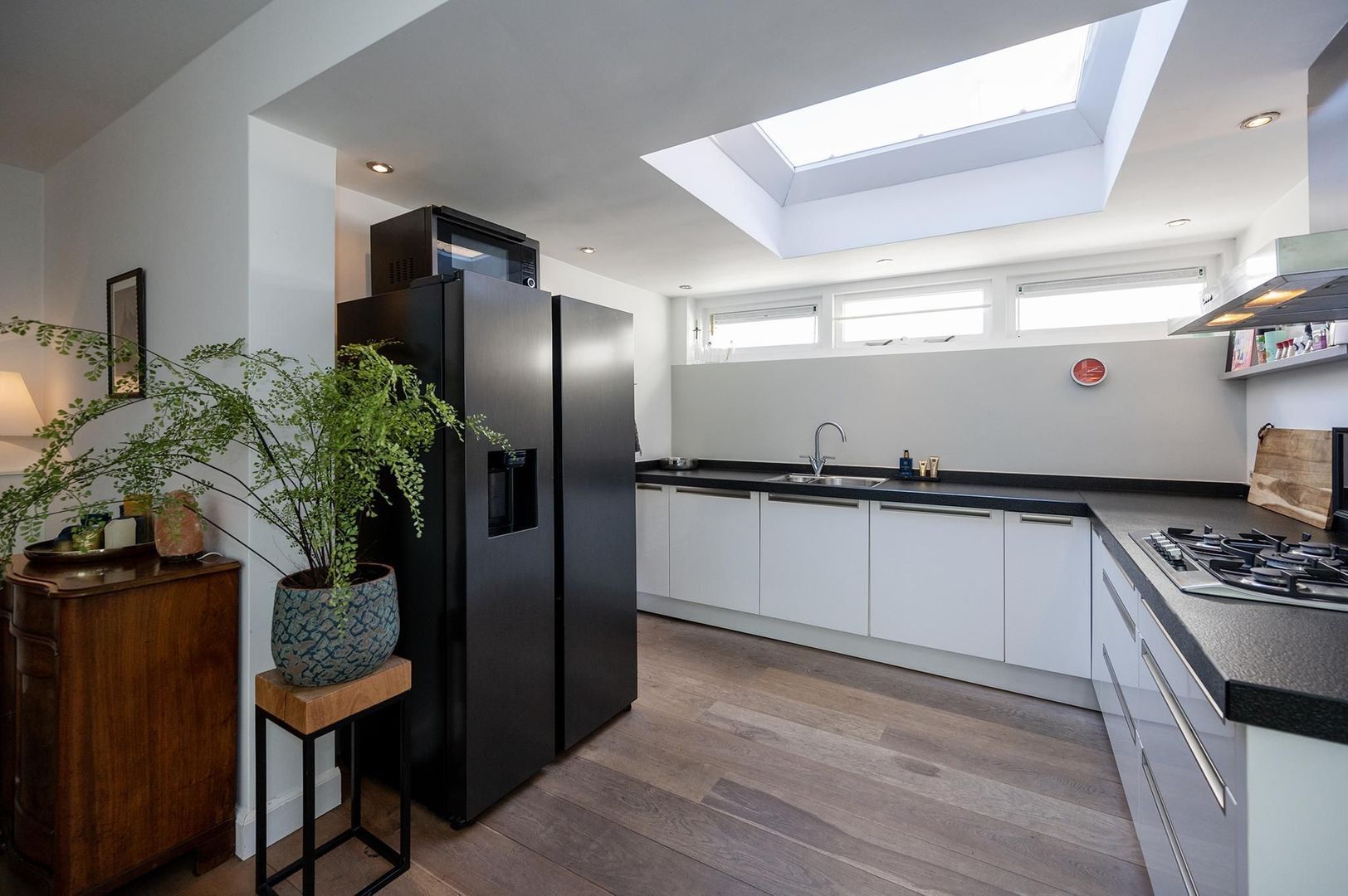 Via de voortuin, die onderhoudsvriendelijk is aangelegd met sierbestrating, betreedt u de woning. Bij binnenkomst komt u in de hal met de meterkast en de trapopgang naar de eerste etage. De begane grond is voorzien van houten vloerdelen, en de wanden en plafonds zijn glad gestukt. Hierdoor is de jaren '30 sfeer behouden gebleven, terwijl de luxe afwerking van nu is toegevoegd. De lichte woonkamer, met erker en een haardpartij, biedt een gezellige sfeer. Aangrenzend vindt u de ruime eethoek met een voorraadkast. De strakke witte keuken met zwart werkblad is uitgerust met diverse inbouwapparatuur. Dankzij het lichtinval van de bovenlichten en de lichtkoepel is de keuken een perfect geïntegreerd onderdeel van de woning.