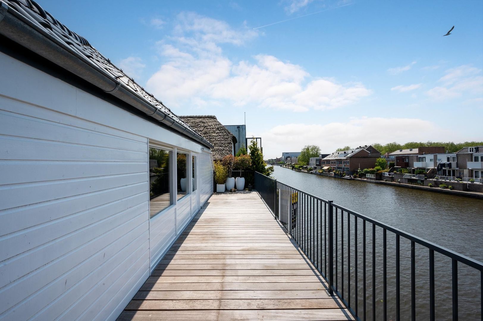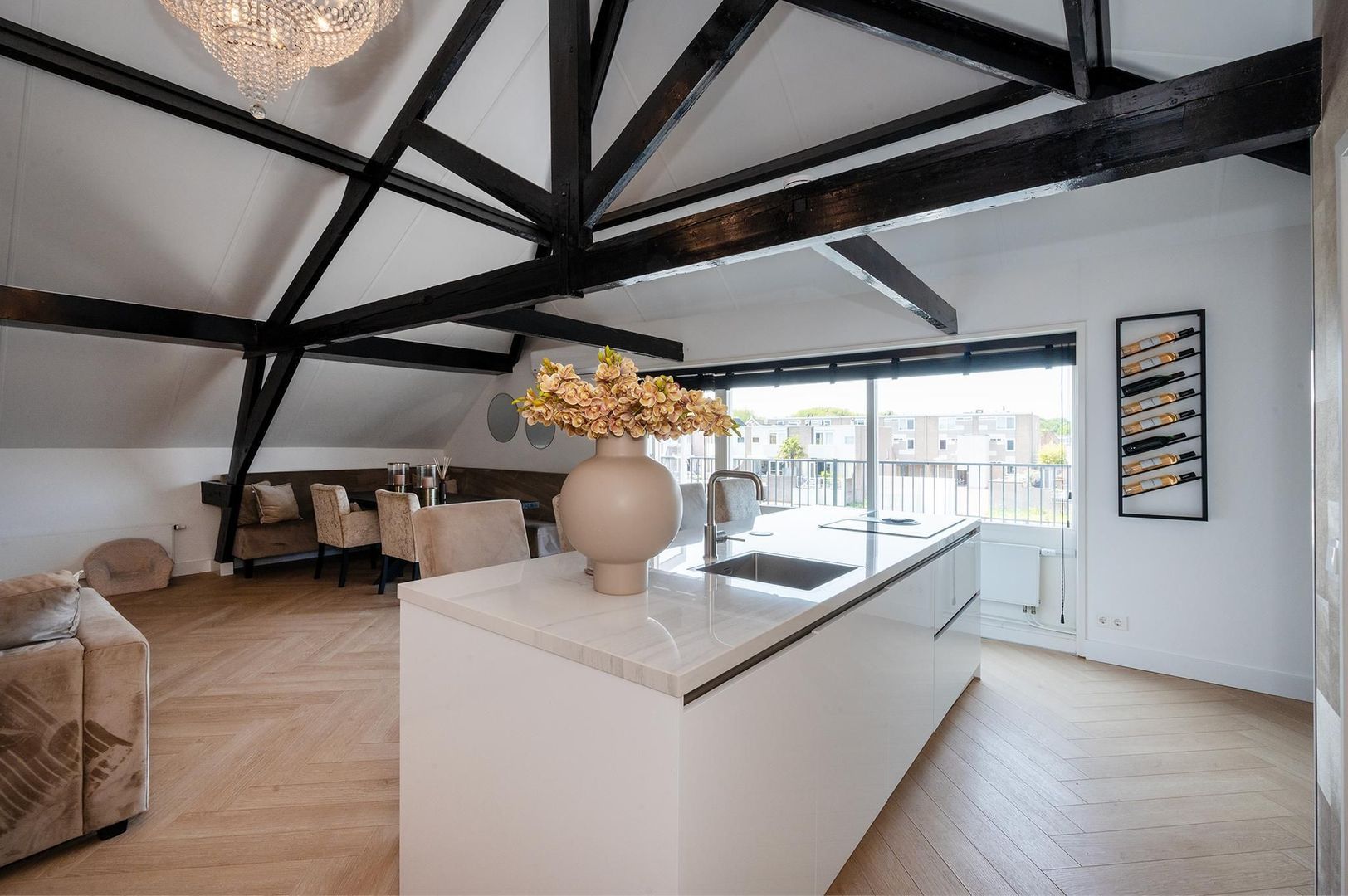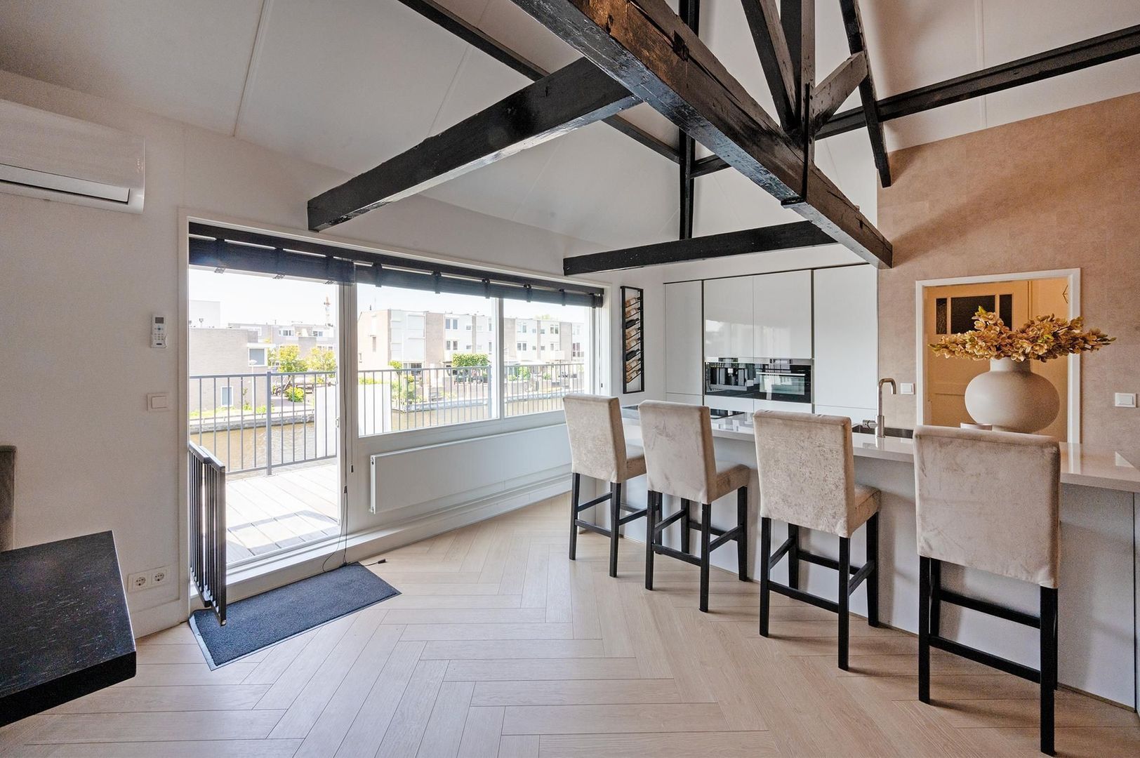 Aan de achterzijde van de woning treft u de woonkamer. De woonkamer is verdeeld in een zithoek, eethoek en een open keuken met kookeiland. De keuken is voorzien van alle denkbare apparatuur. Vanuit de woonkamer heeft u direct toegang tot het royale en zonnige dakterras met zeer fraai en wijds uitzicht over de Oude Rijn.