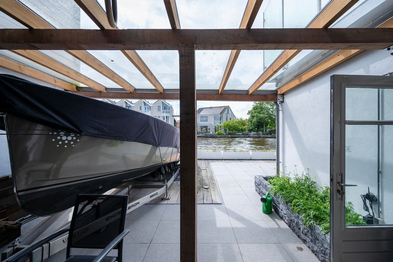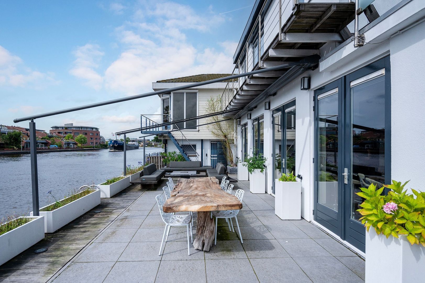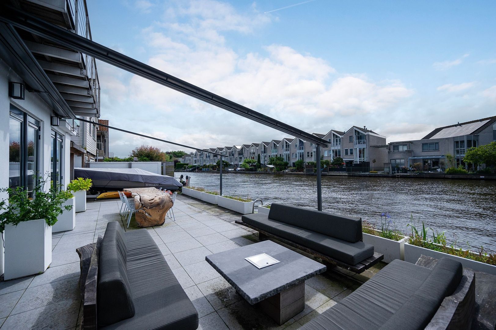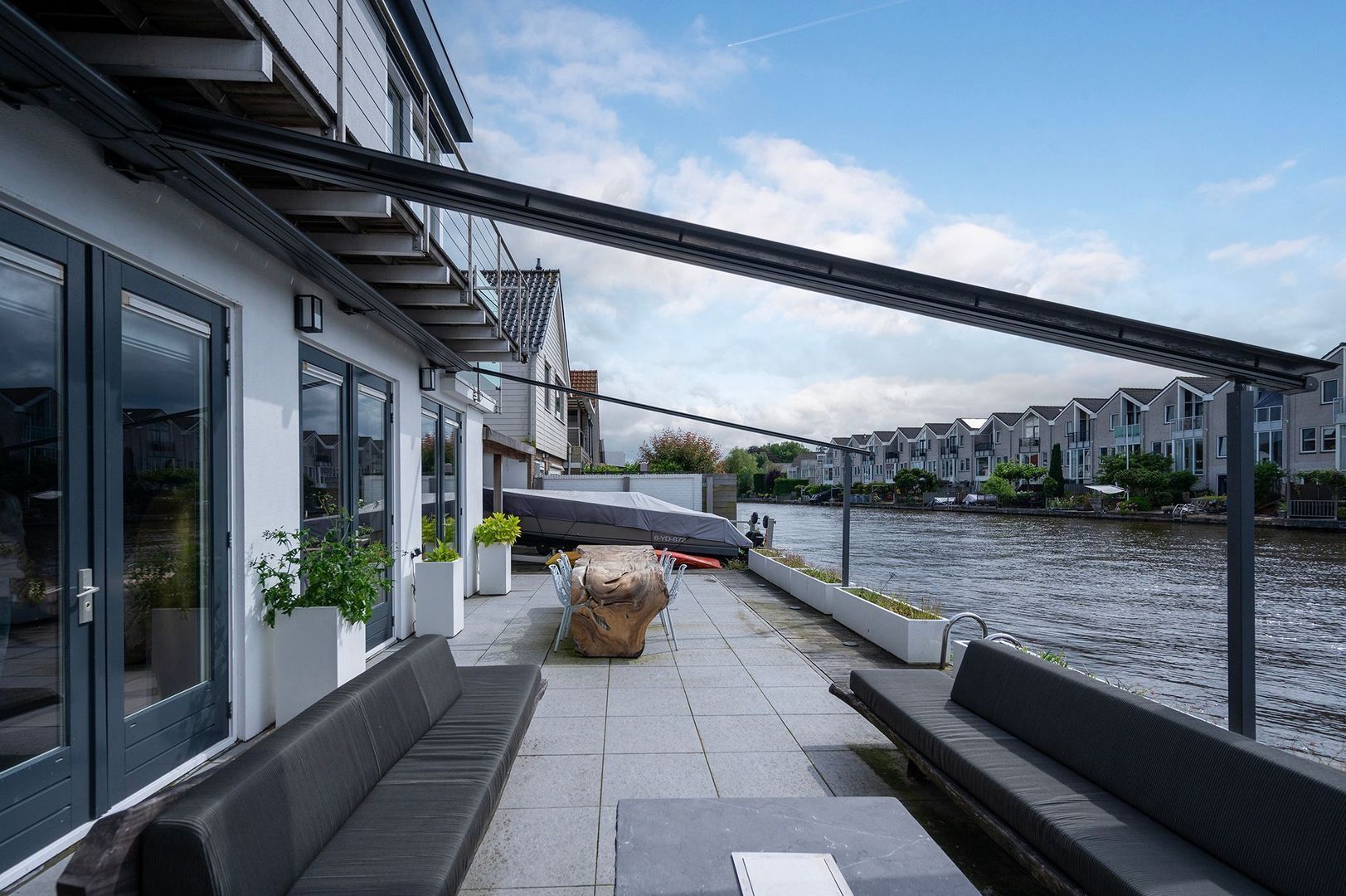 - Royaal betegeld terras met ruime zithoek, grote zonwering doek en botenlift