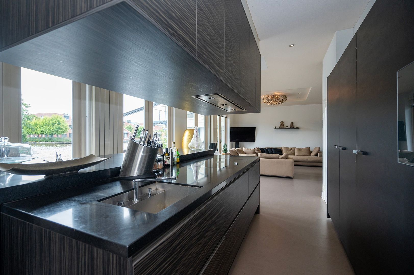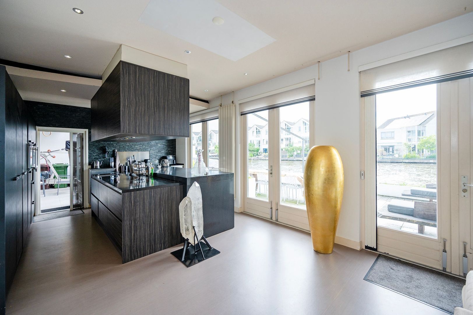De zeer ruime, lichte woonkamer is voorzien van openslaande deuren naar het terras en heeft zicht op het water. De open keuken met bar, kookeiland en natuurstenen aanrechtblad is modern en voorzien van diverse inbouwapparatuur. Vanuit de keuken is er directe doorgang naar zowel de boten- als de autogarage. Tevens is de kelder vanuit de keuken te bereiken. Op de begane grond bevinden zich daarnaast een bijkeuken, ruime zithoek, eettafel, een bureau/kantoorruimte, een apart toilet, een apart urinoir en bergruimte.