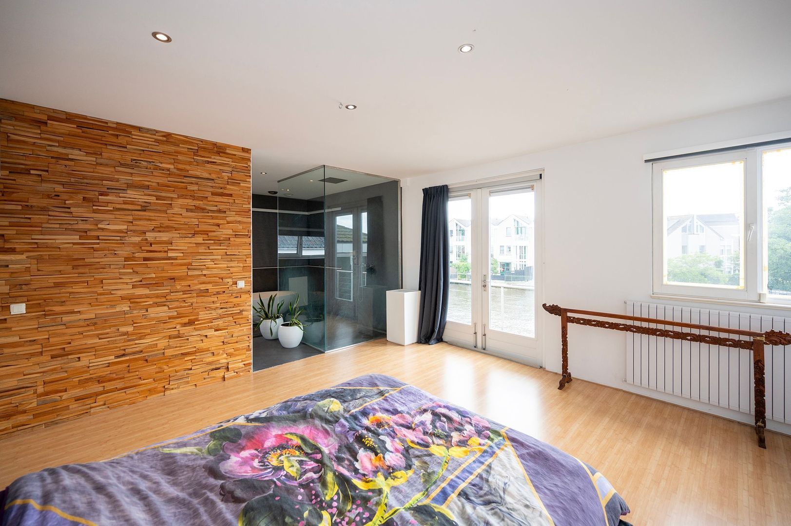 Aan de waterzijde bevindt zich de royale masterbedroom, uitgerust met een inbouwkast en openslaande deuren naar het aangrenzende balkon. De badkamer en-suite is voorzien van een douchecabine, hoekbad (whirlpool) en zwevend toilet. Daarnaast zijn er nog twee extra slaapkamers, beide voorzien van inbouwkasten. Tevens is er een bergruimte met inbouwkast en dakraam, die de mogelijkheid biedt om als vierde slaapkamer te fungeren. Aan de zijkant van de woning bevindt zich een groot, zonnig dakterras op het zuiden, compleet met een jacuzzi, dat zich uitstrekt naar een balkon op het westen. Dit terras biedt een ideale ruimte voor ontspanning en geniet van de zon gedurende het grootste deel van de dag. De unieke ligging en de uitgebreide voorzieningen maken deze woning tot een buitengewoon aantrekkelijk aanbod.