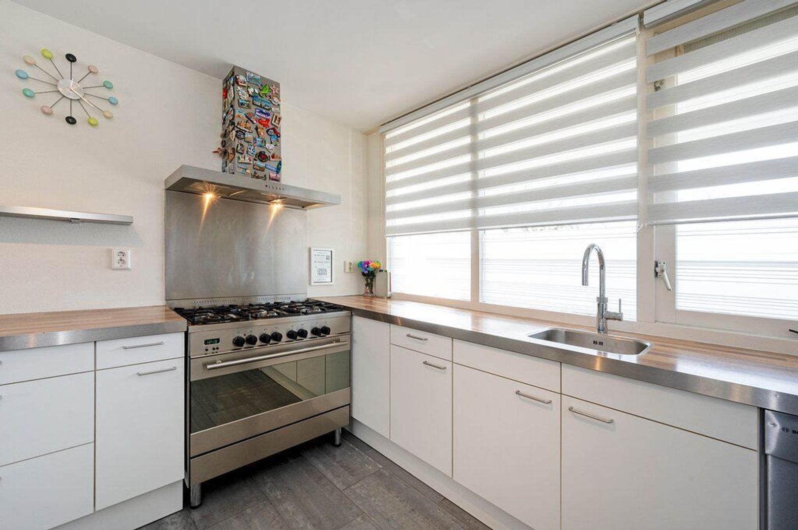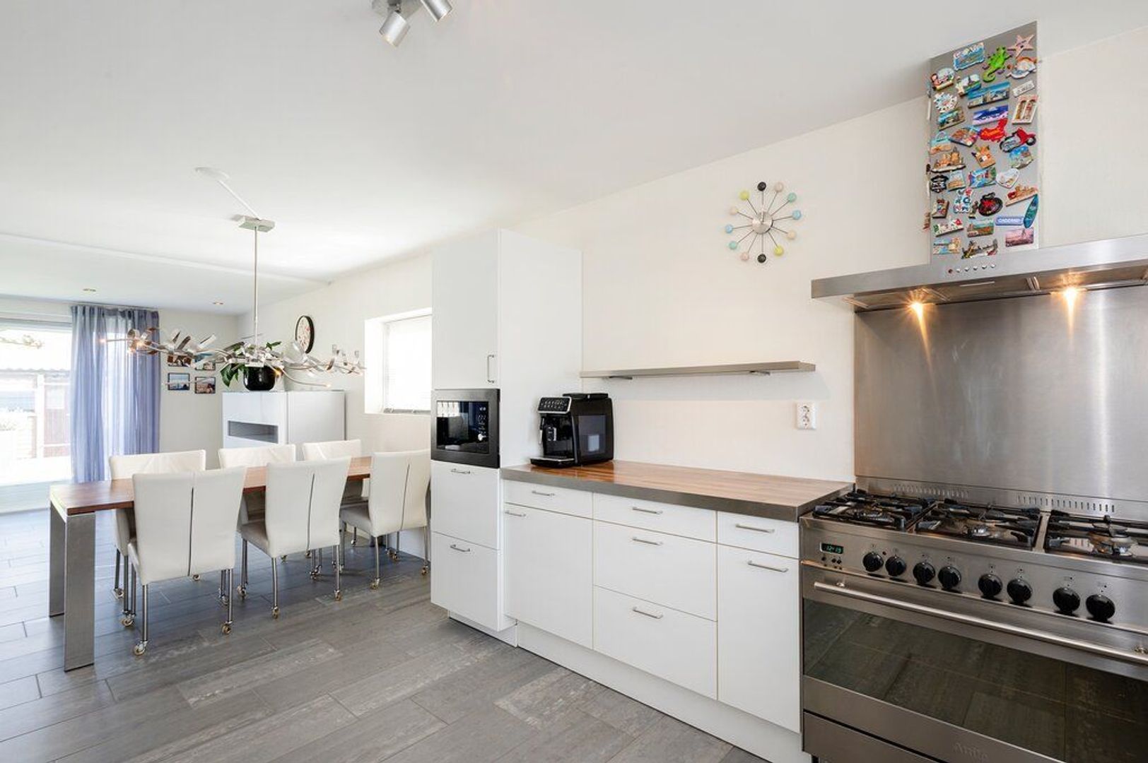Aan de voorzijde van de woning bevindt zich de zeer ruim opgezette keuken voorzien van een 6-pits gasfornuis met oven, chique kleurstelling, vaatwasser, magnetron en Quooker.