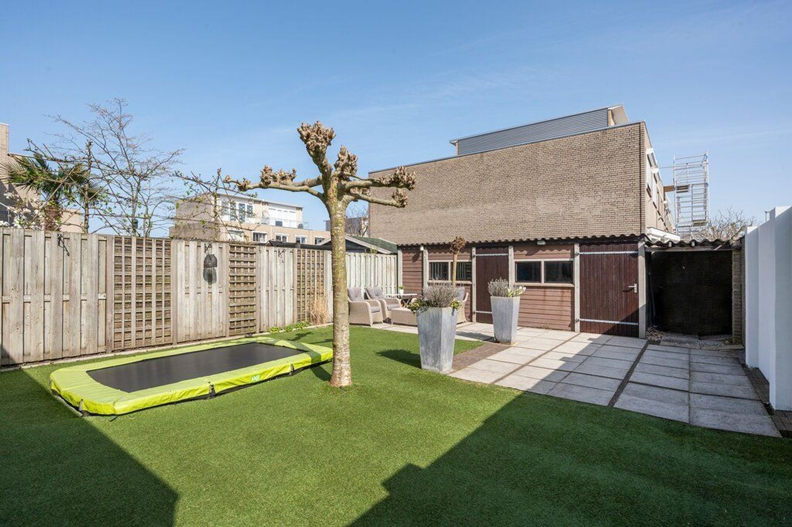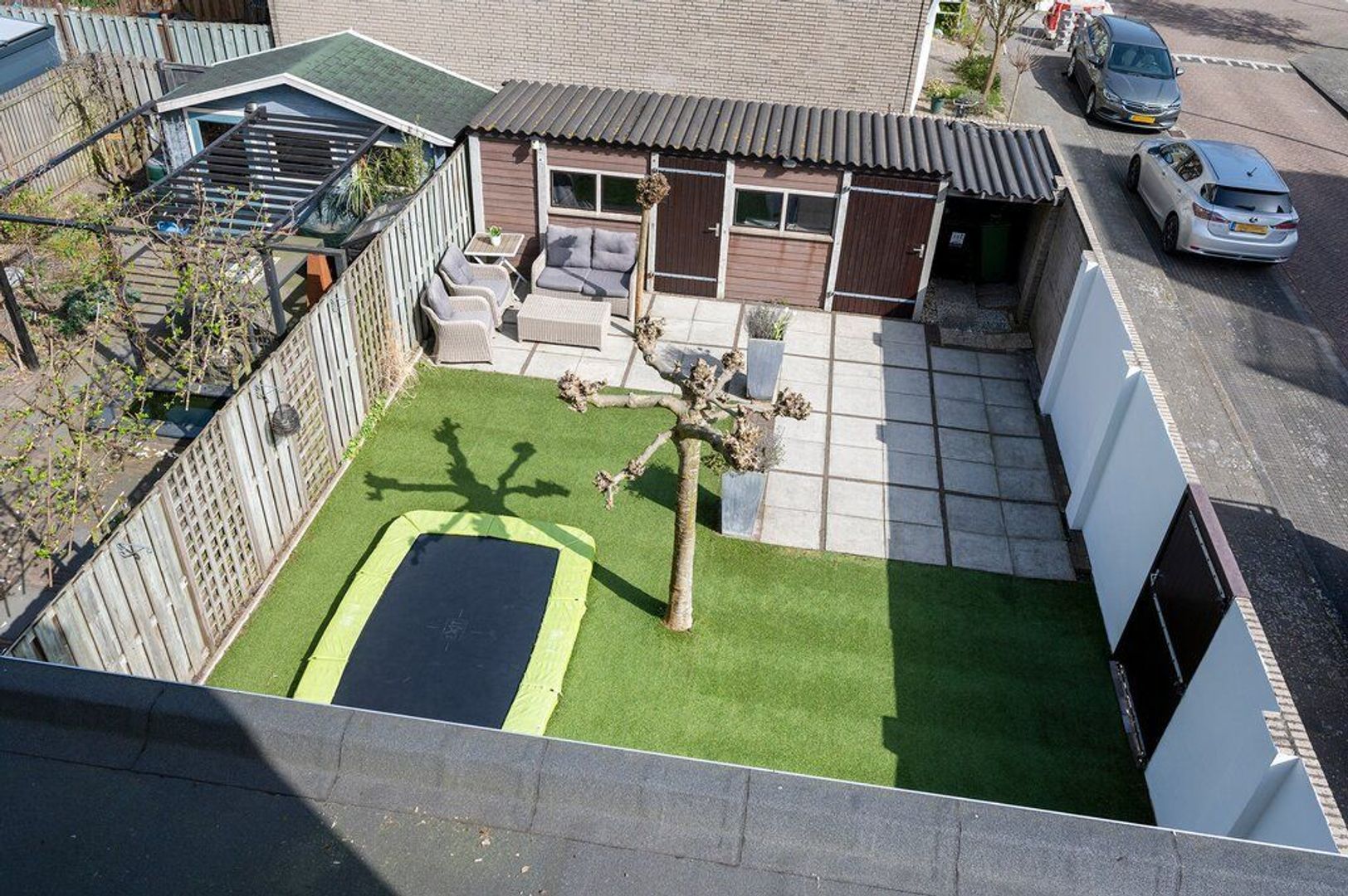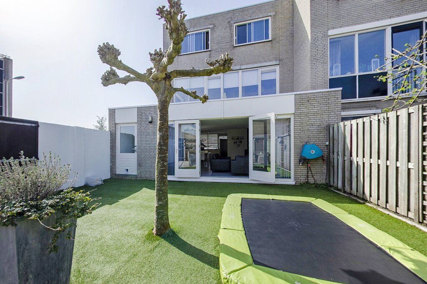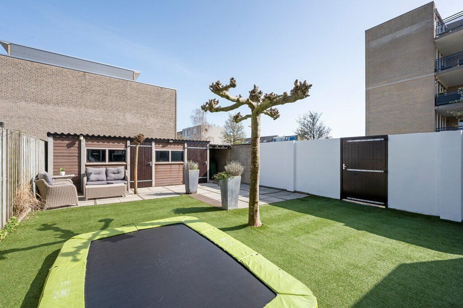 Riante tuin voorzien van kunstgras en tegelwerk. Momenteel is er ook een trampoline aanwezig. Verder vindt u achterin de tuin een berging en aan de zijkant een ingang naar de straat.