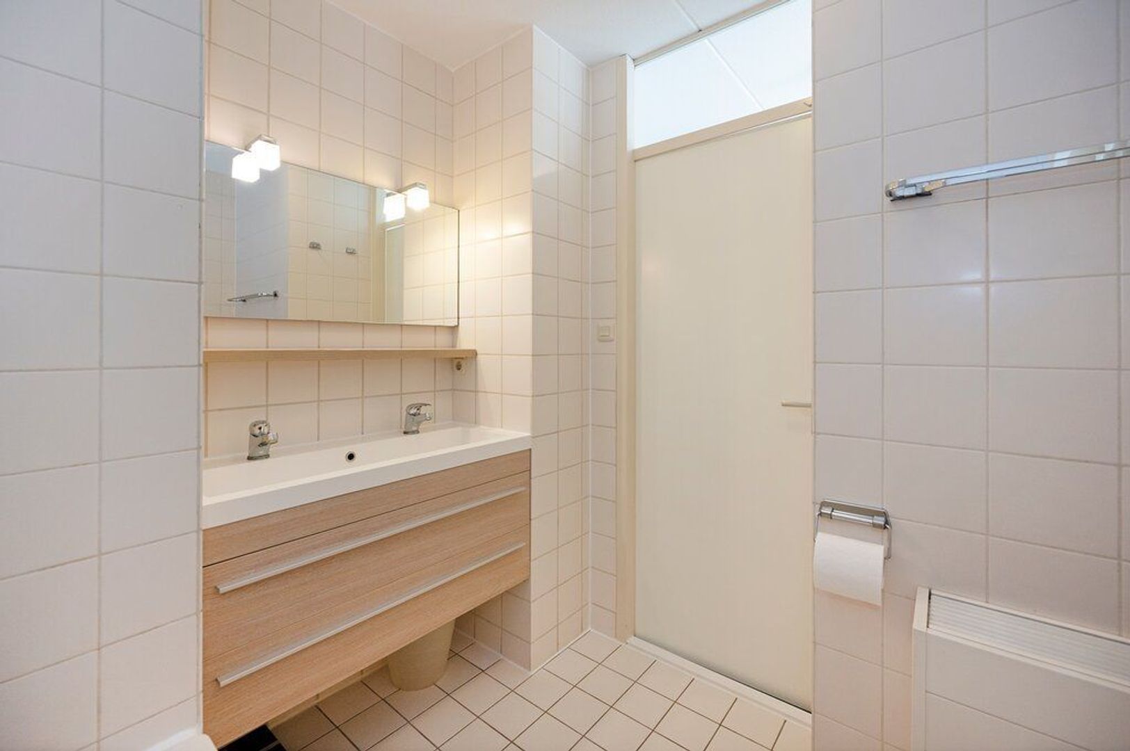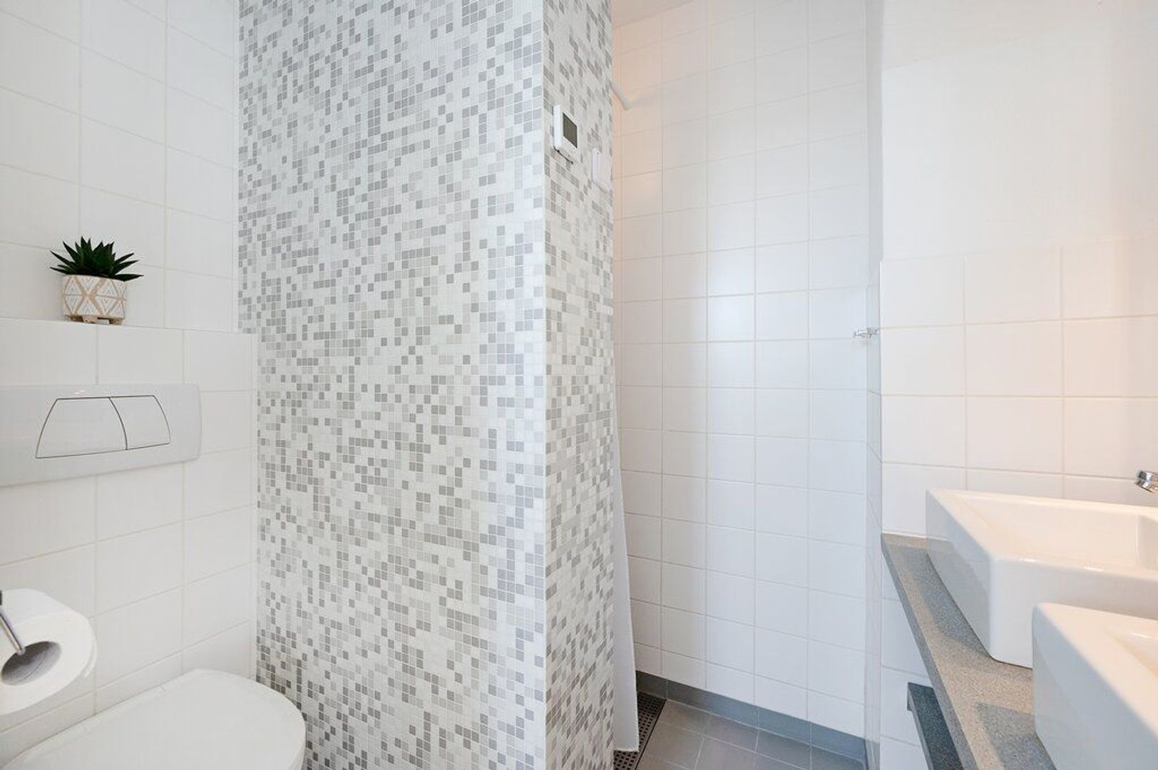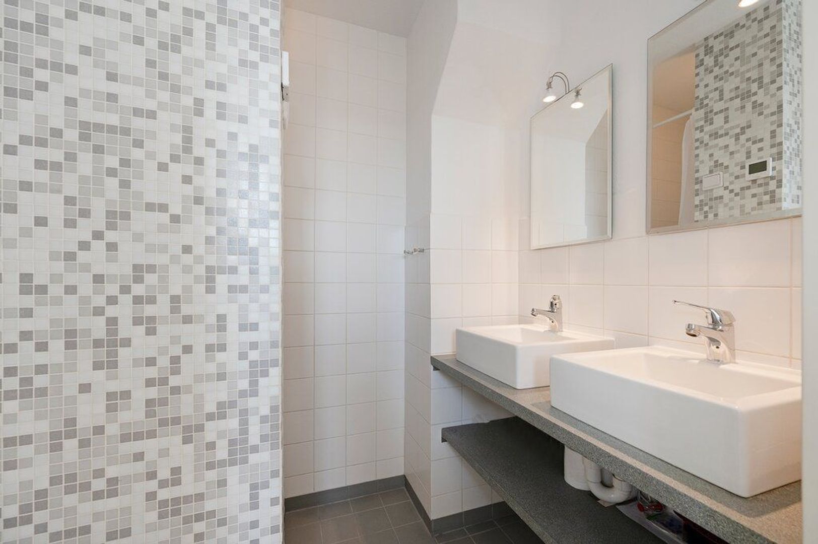 Ook bevindt zich op deze etage een badkamer met douchehoek, toilet en dubbele wastafel.