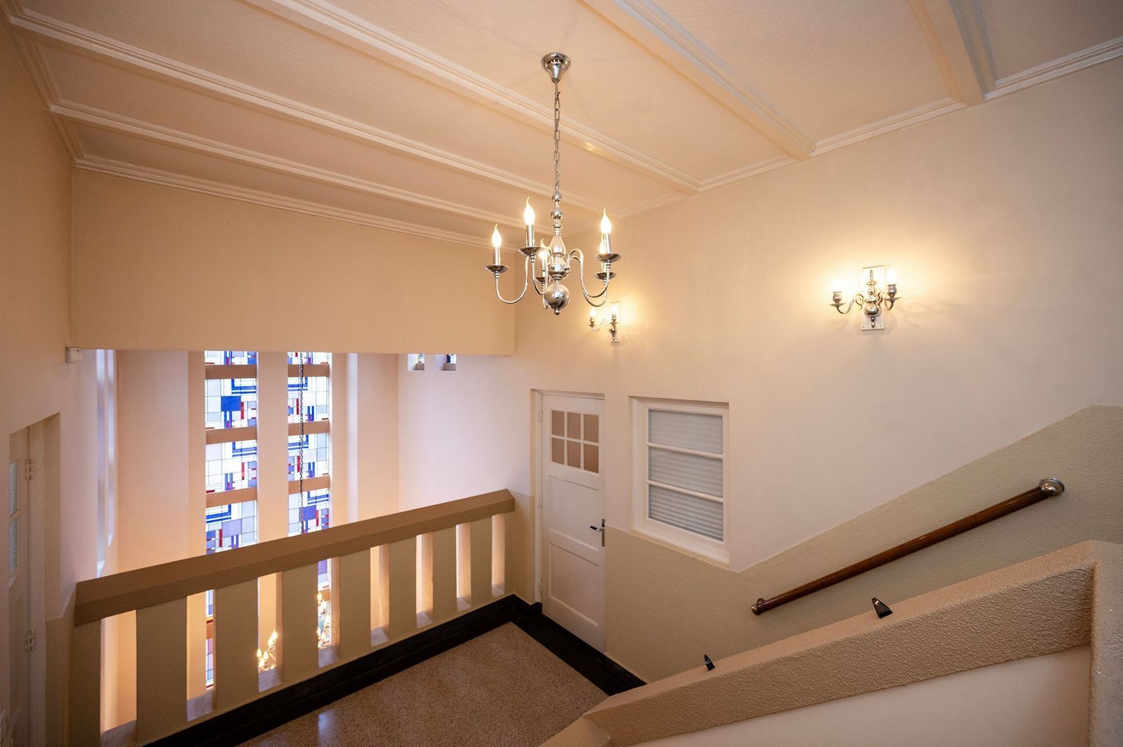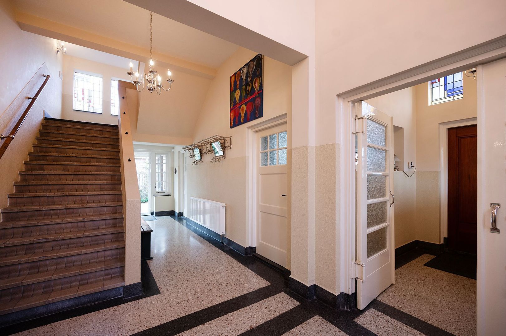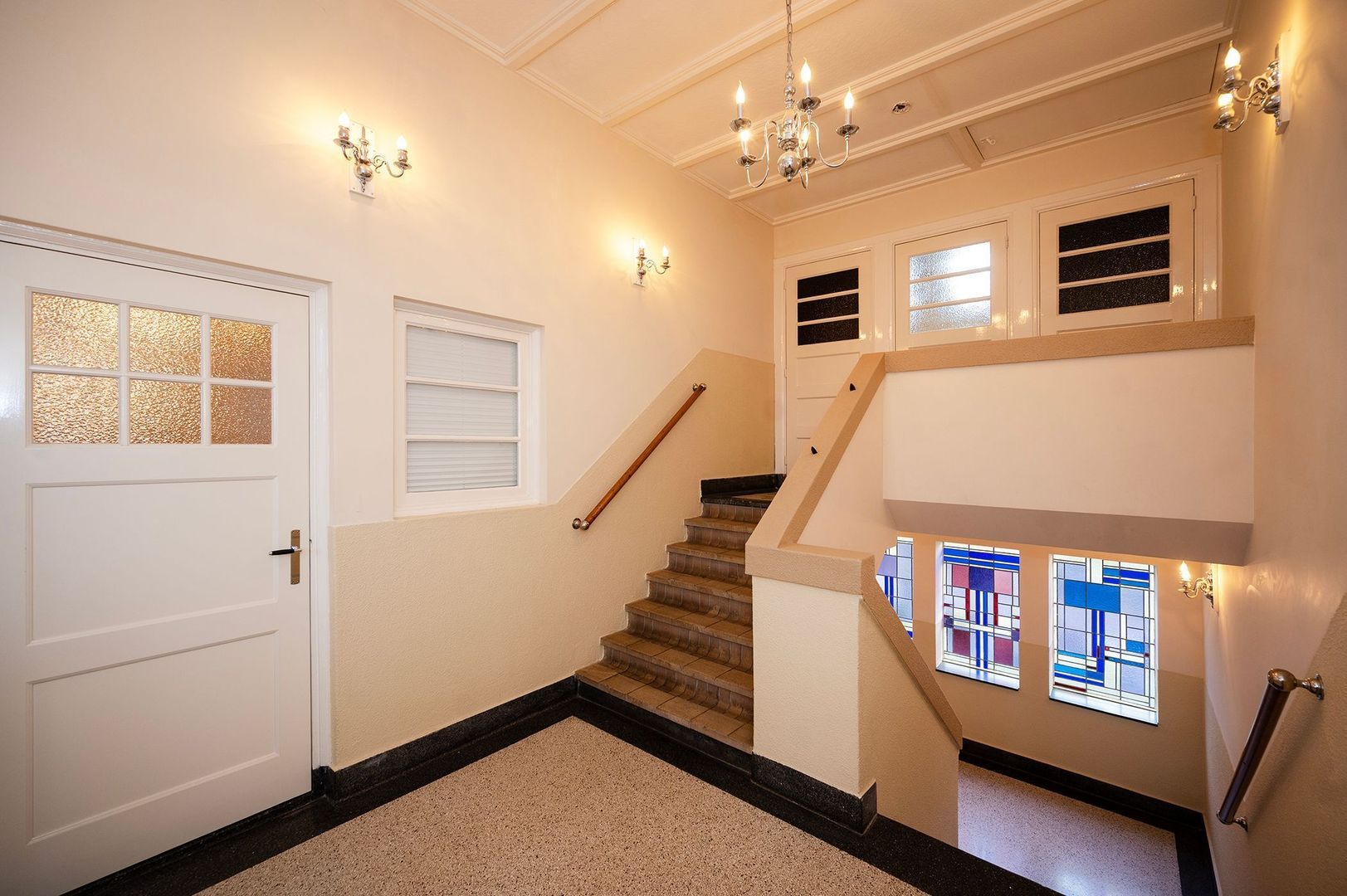 Authentieke details zoals glas-in-loodramen en paneeldeuren