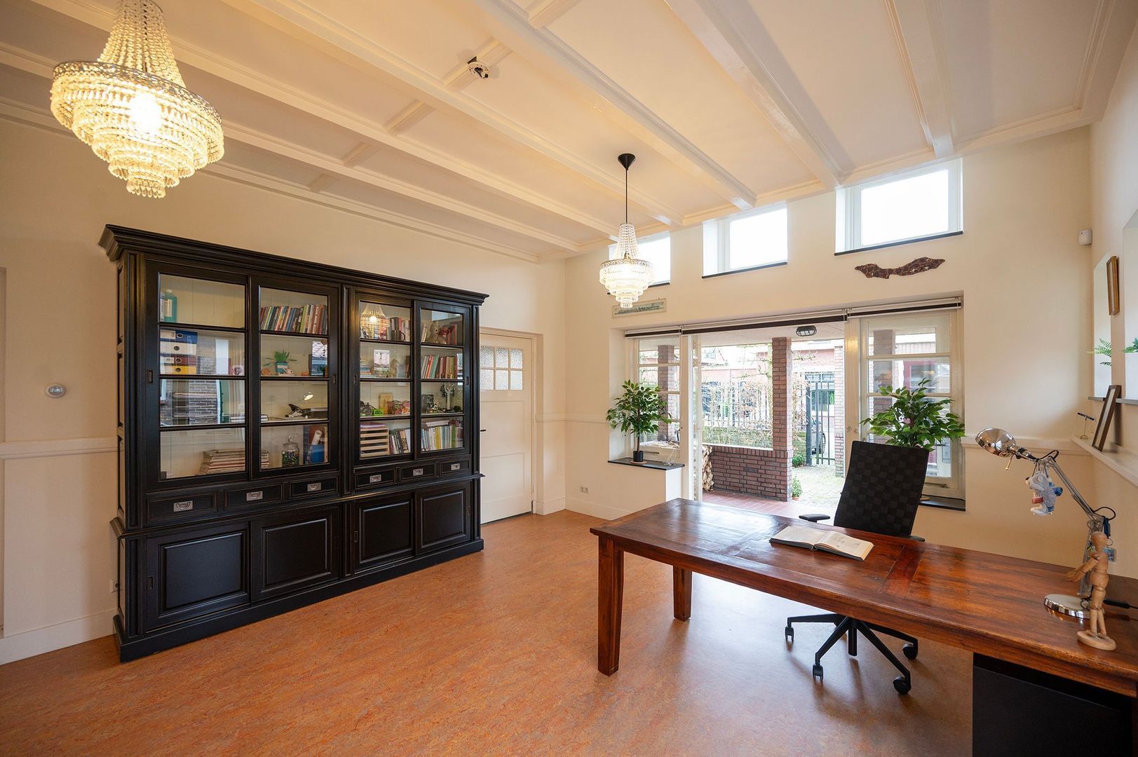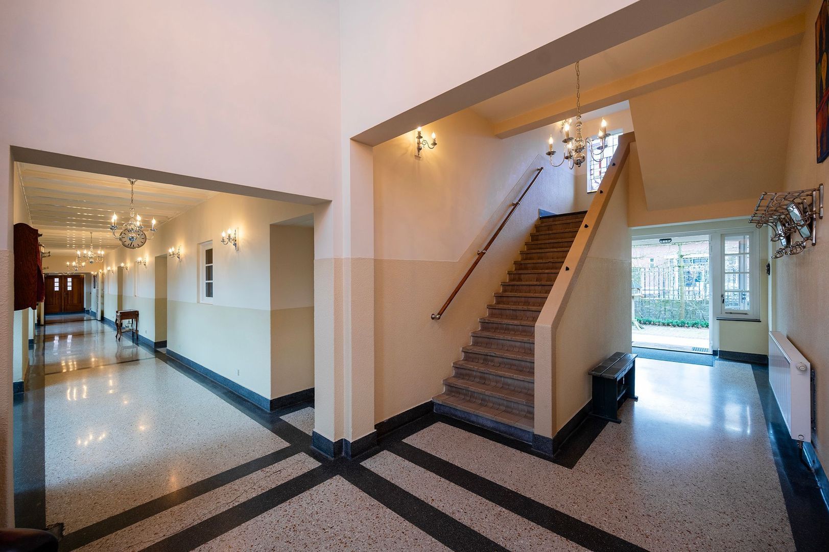 Via de authentieke entree met overdekte luifel en originele dubbele deuren betreedt u de indrukwekkende ontvangsthal. Hier vallen direct de monumentale hoogte, de terrazzo vloer, het glas-in-lood en het karakteristieke trappenhuis op. De elementen die herinneren aan de rijke historie van het gebouw. Vanuit deze centrale hal loopt de karakteristieke gang door het pand, met aan weerszijden verschillende ruimtes die oorspronkelijk als klaslokalen in gebruik waren. Op de begane grond bevinden zich onder meer een ruime woonkamer, een eetkamer en een keuken met kookeiland. Daarnaast zijn er meerdere atelier- of werkruimtes aanwezig, evenals diverse toiletruimten en praktische bergingen en kastruimten. Dankzij de oorspronkelijke klaslokaalindeling beschikken de ruimtes over grote raampartijen en een prettige lichtinval en zijn ze middels en-suite deuren allemaal met elkaar verbonden . Aan de achterzijde geven openslaande deuren toegang tot de tuin.