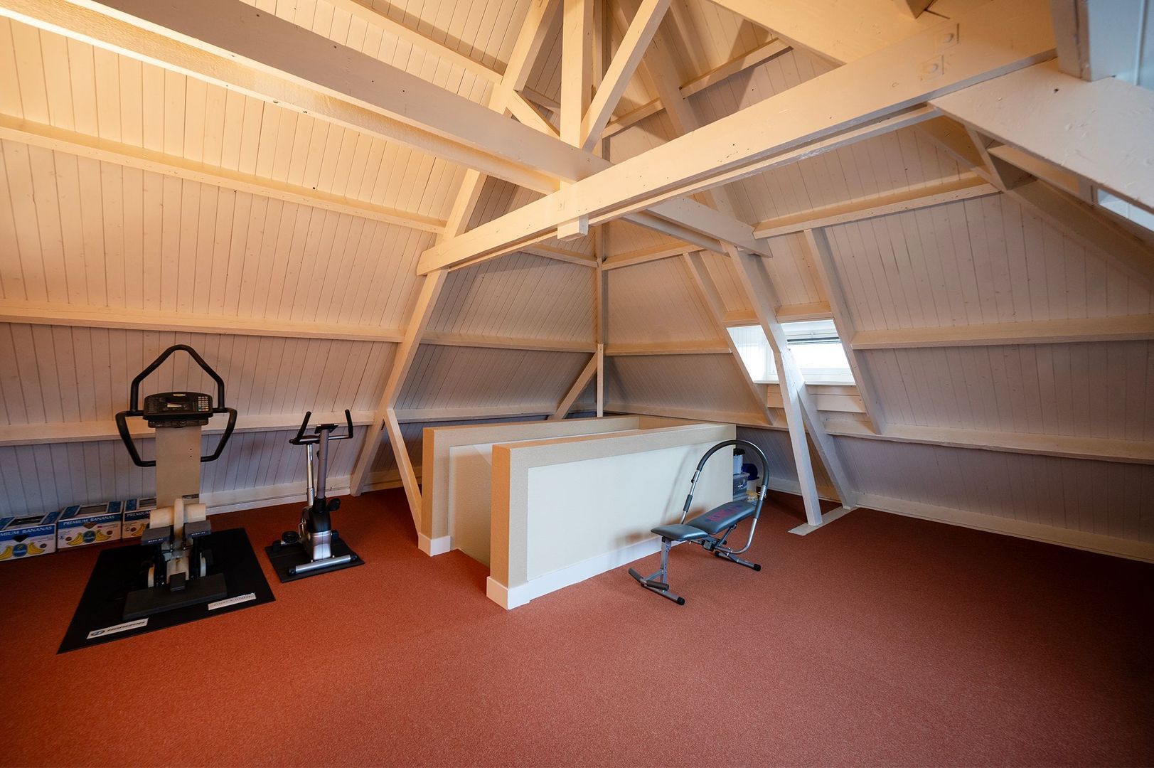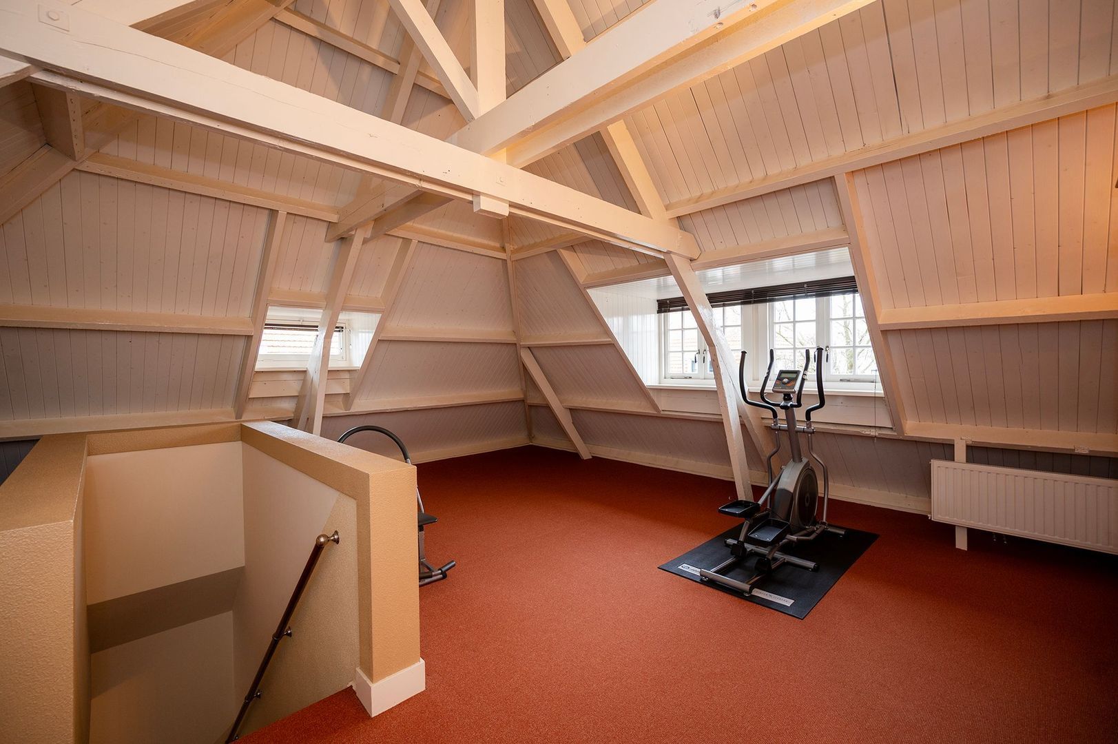 Onder de kap bevindt zich een indrukwekkende open ruimte met zichtbare houten kapconstructie. Deze verdieping wordt momenteel gebruikt als hobby- en sportruimte, maar leent zich uitstekend voor uiteenlopende functies, zoals een atelier, studio, kantoor of extra slaapkamer(s). De open kap en de royale hoogte geven deze ruimte een bijzonder ruimtelijk karakter en onderstrepen het unieke gevoel van ruimte dat dit voormalige schoolgebouw zo bijzonder maakt.