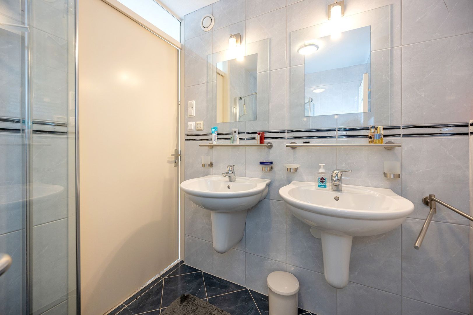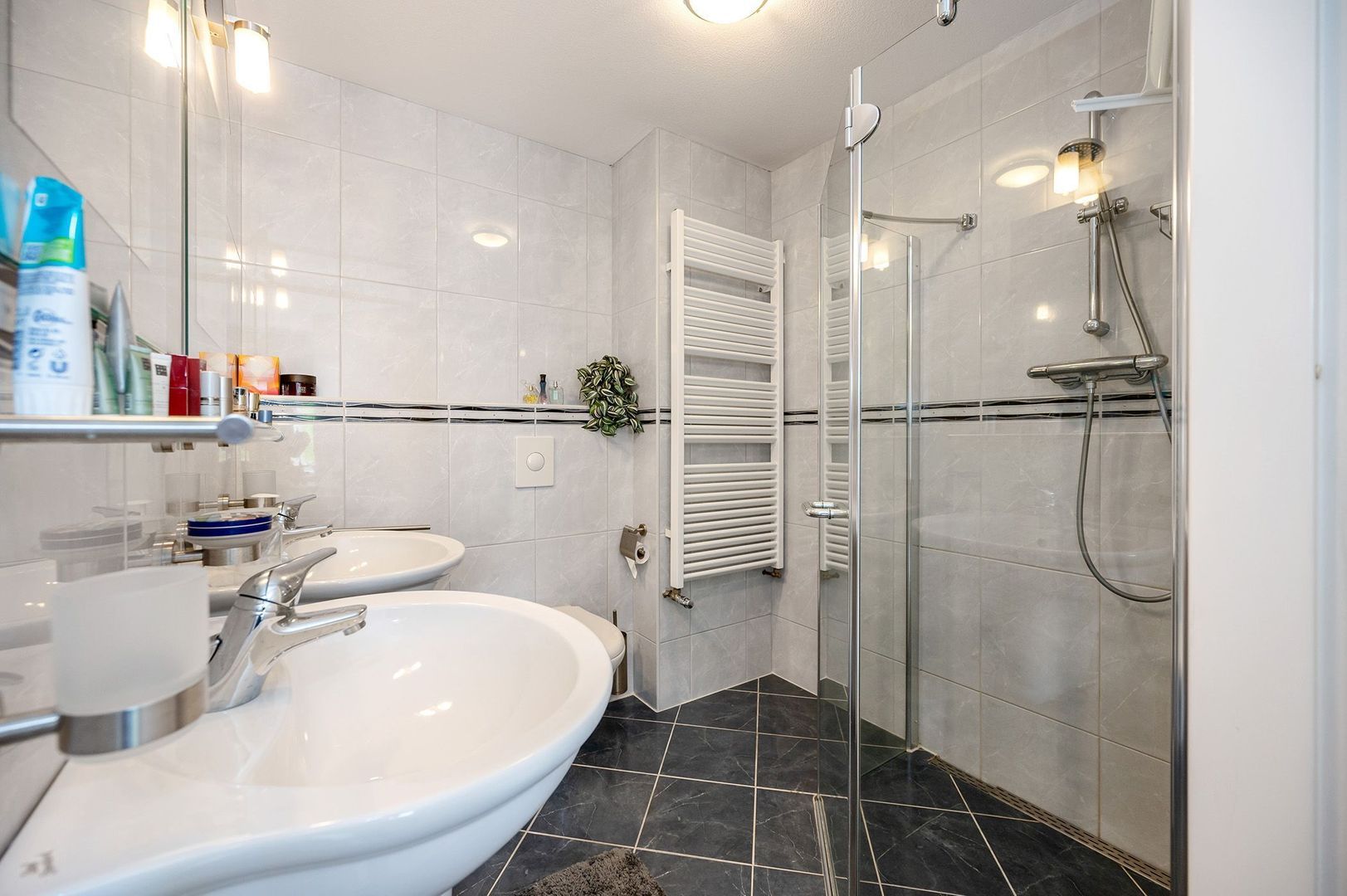 De badkamer is direct toegankelijk vanuit de grote slaapkamer. De ruimte is geheel betegeld, heeft een inloopdouche, een wastafelmeubel, een radiator én vloerverwarming.