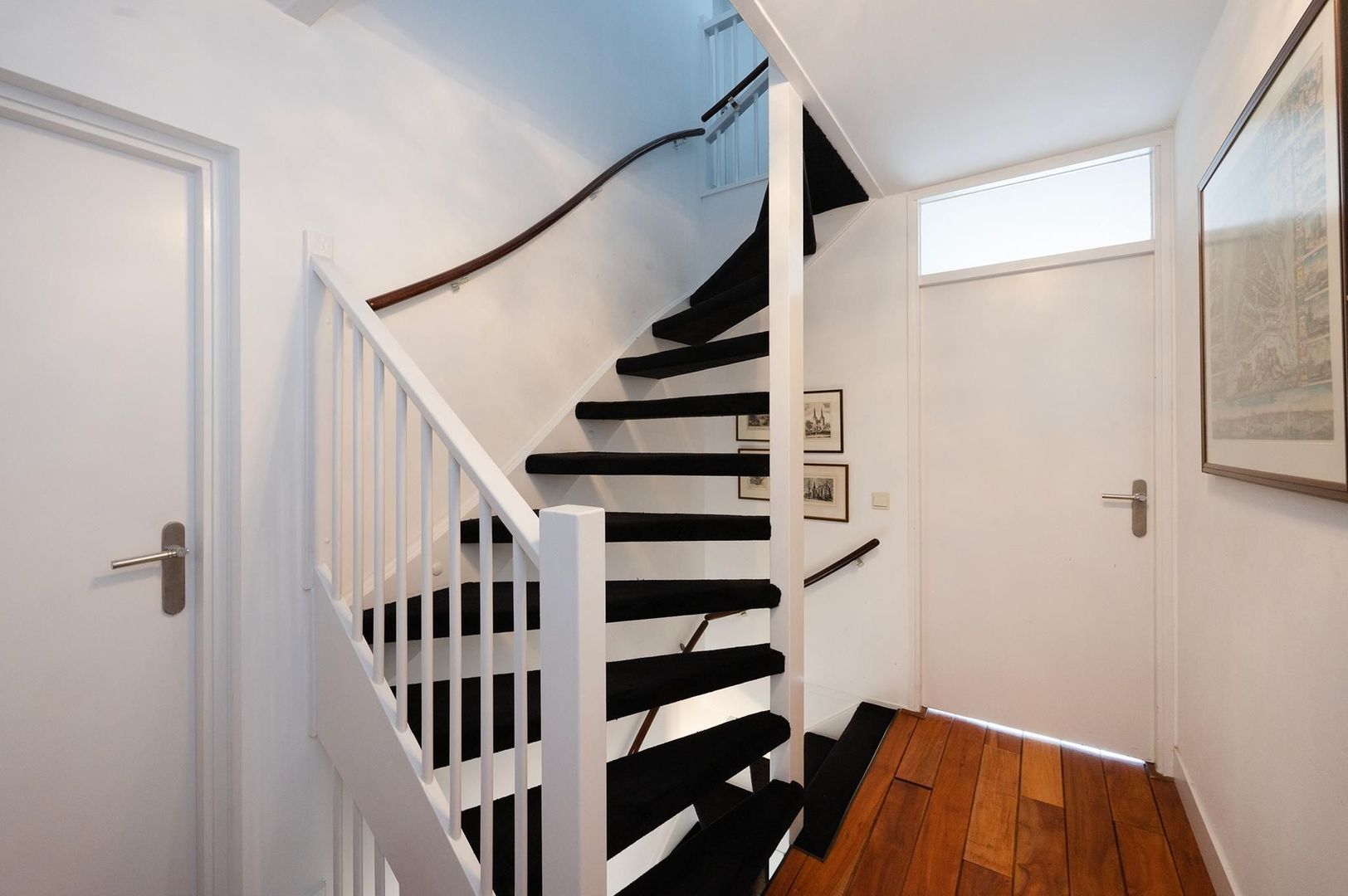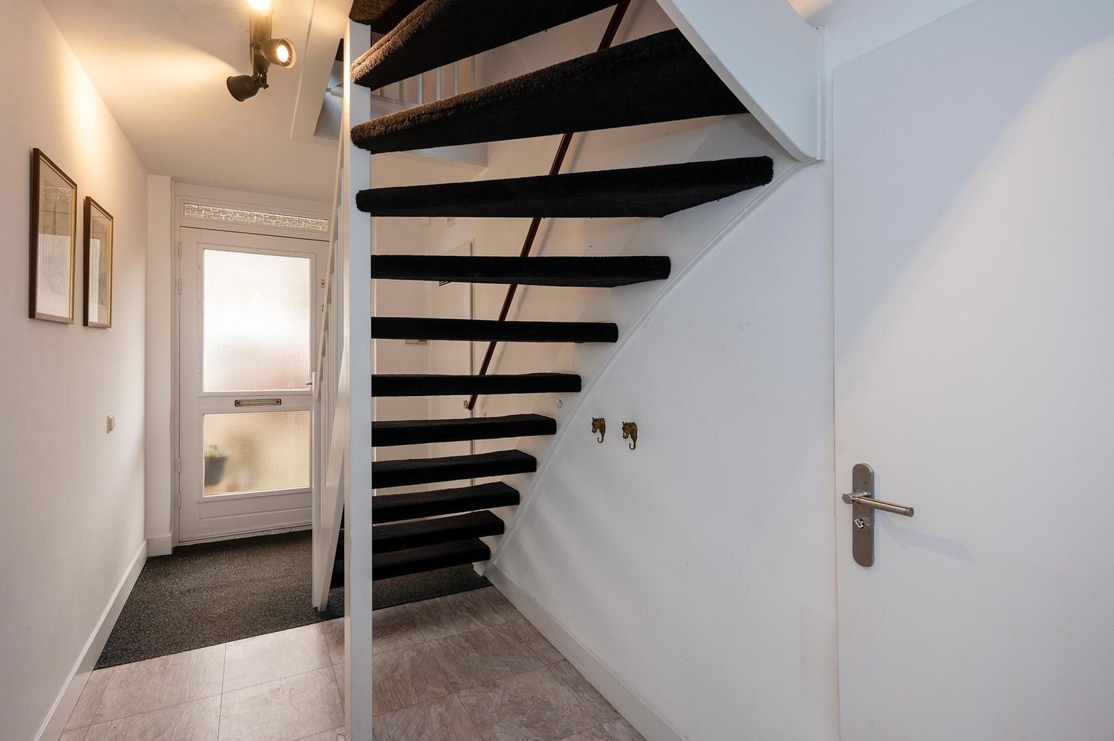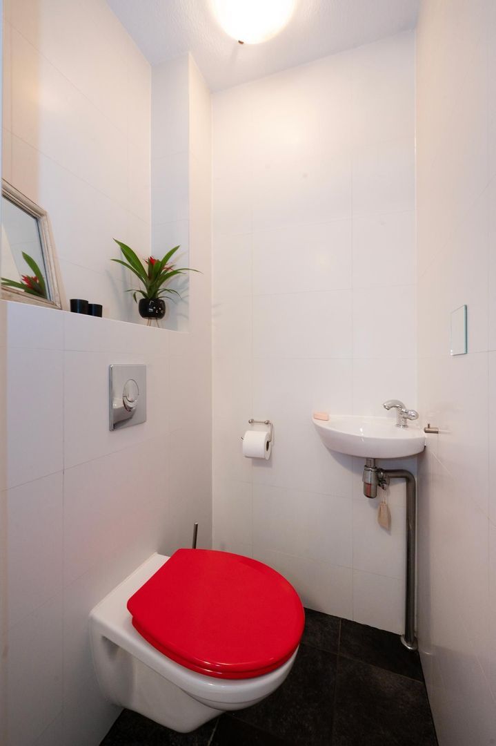 Overloop met trapopgang naar de 2e verdieping, toilet (vrijhangend) met fonteintje, bergkast met cv-. en mv.-opstelling en toegang tot de living en eethoek.