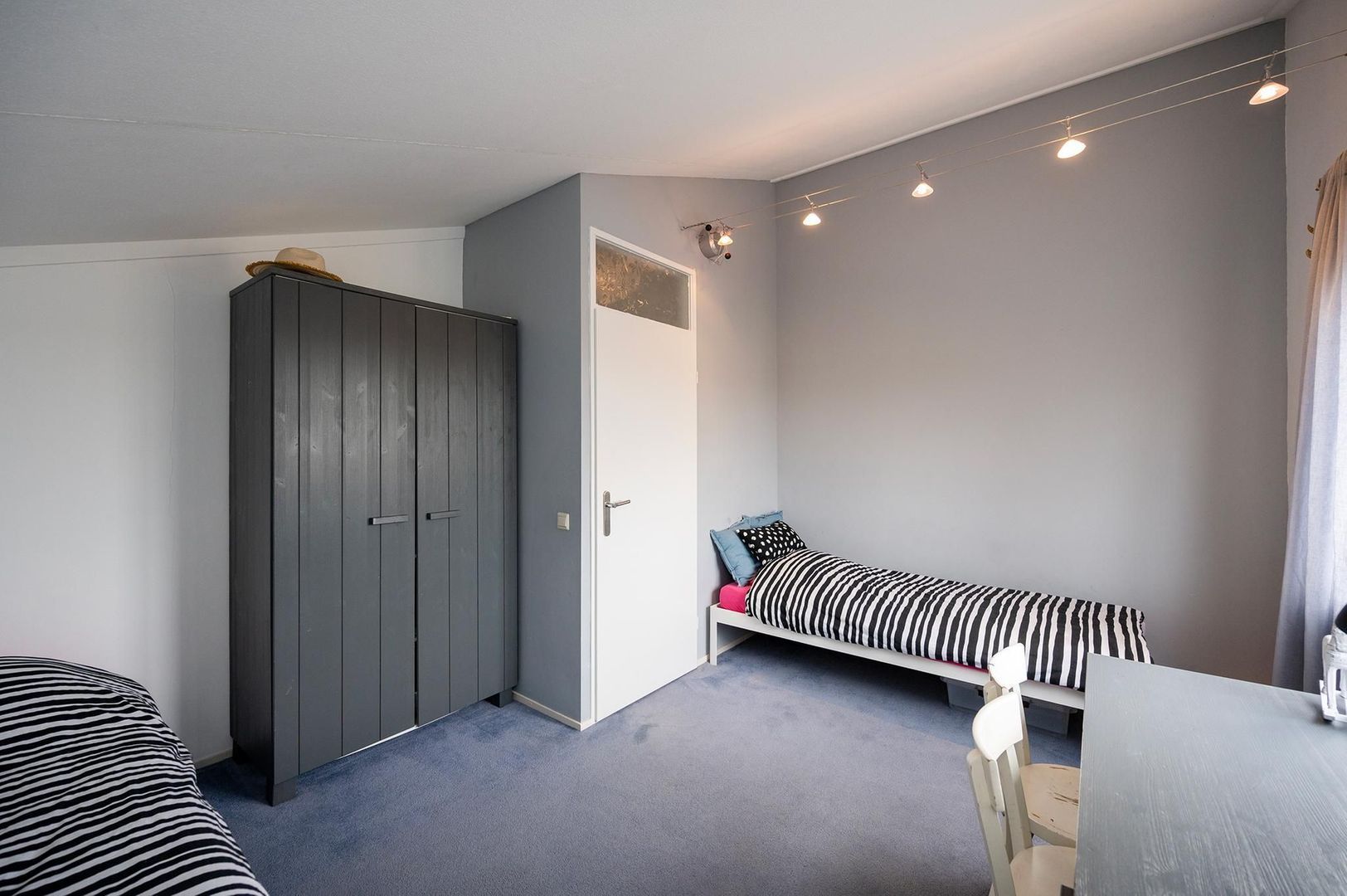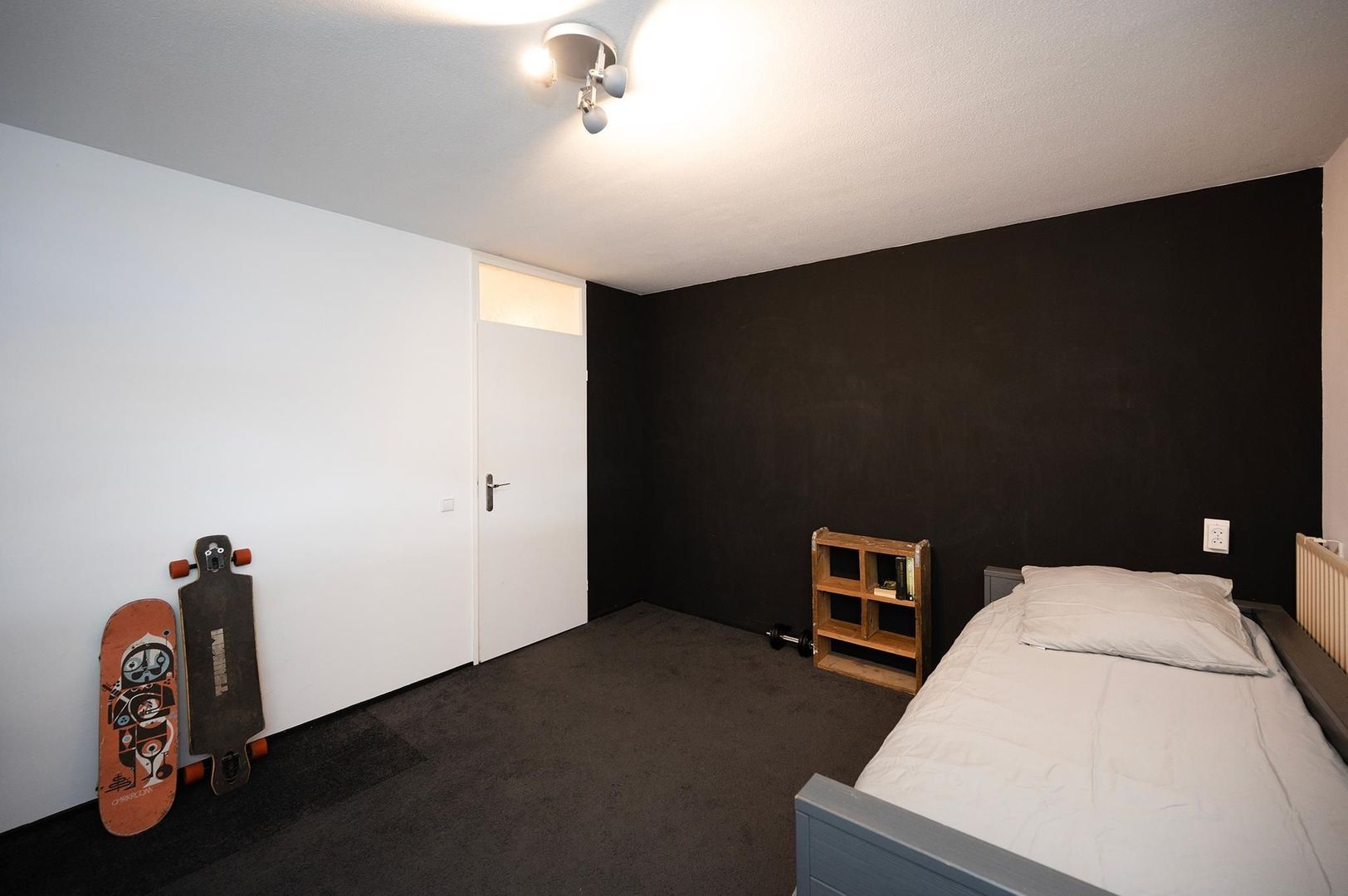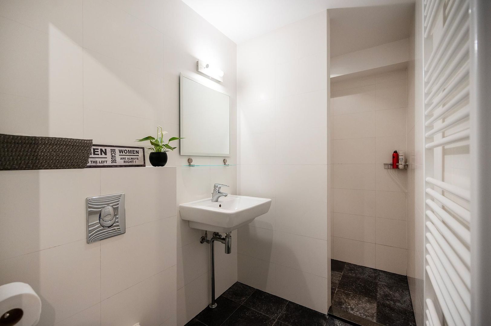 Hal met meterkast, trapopgang naar de verdieping, toegang tot de garage alwaar de aansluiting voor de wasmachine en de droger, slaapkamer aan de voorzijde, flinke slaapkamer aan de achterzijde en eigen badkamer met ruime inloopdouche, vaste wastafel en toilet.