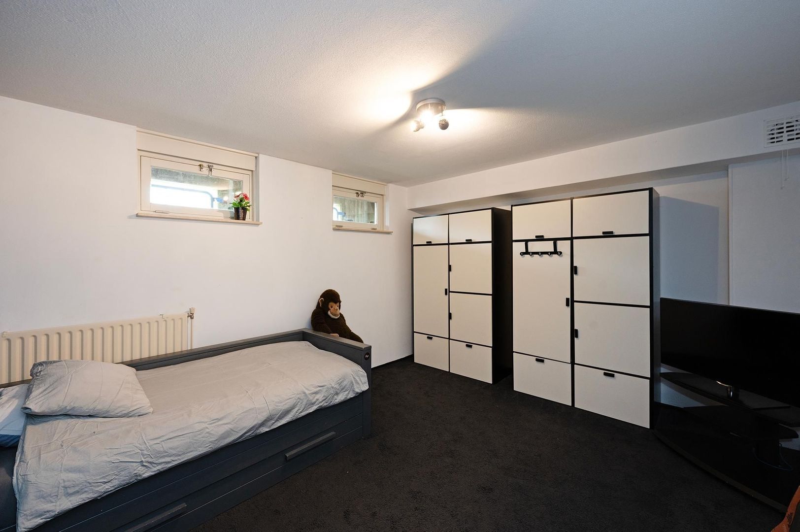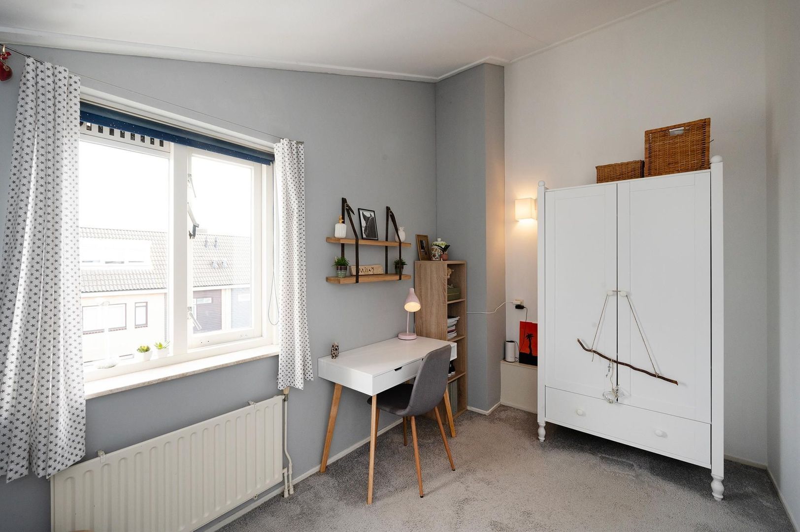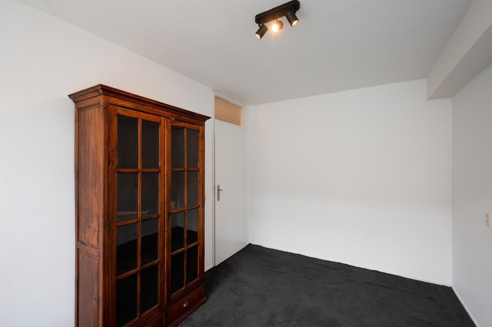 Hal met meterkast, trapopgang naar de verdieping, toegang tot de garage alwaar de aansluiting voor de wasmachine en de droger, slaapkamer aan de voorzijde, flinke slaapkamer aan de achterzijde en eigen badkamer met ruime inloopdouche, vaste wastafel en toilet.