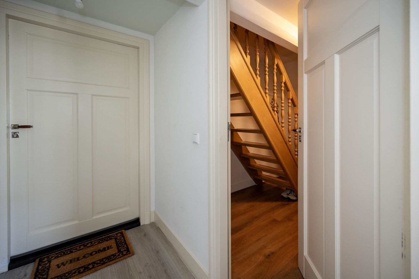 De entree van het pand bevindt zich aan de Koekebakkersteeg, waar een verzorgd bellentableau en brievenbussen je welkom heten. Via het gezamenlijke trappenhuis bereik je het loft. De royale hal leidt naar de inpandige trap, en bij binnenkomst valt meteen de indrukwekkende oude dakconstructie op.