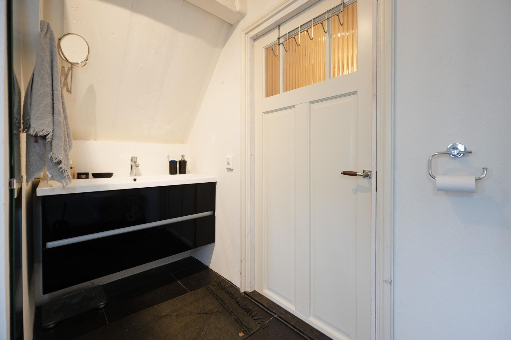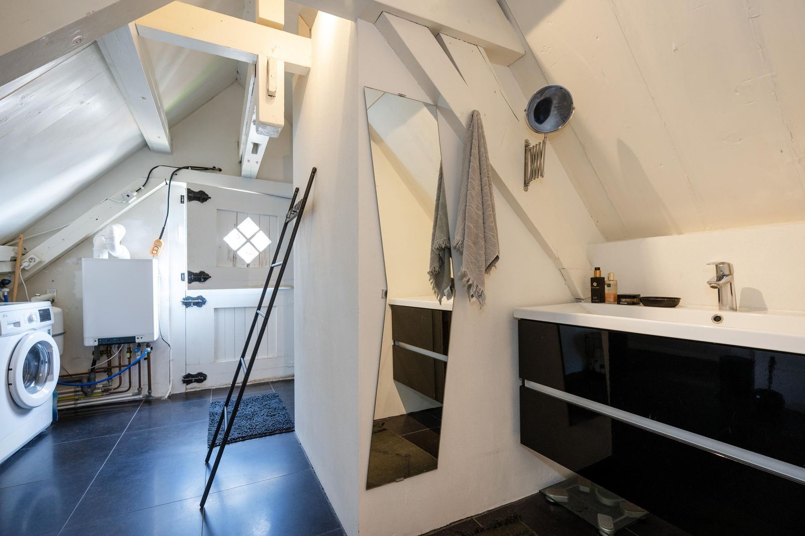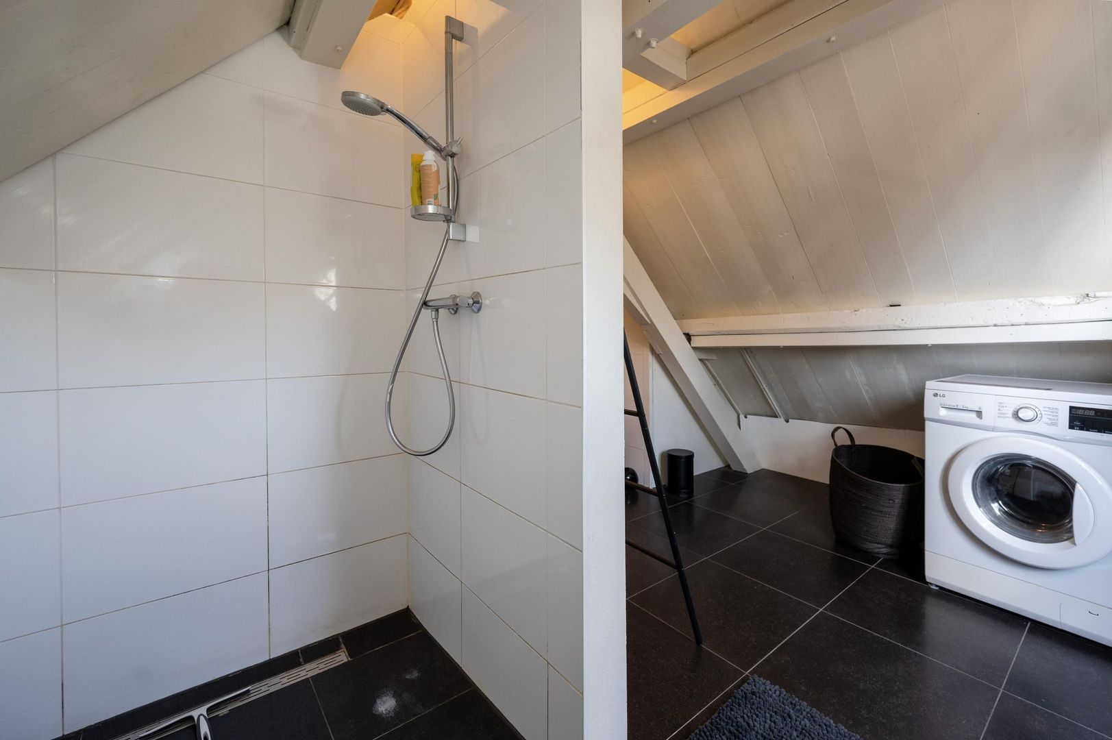 Aan de achterzijde van het loft vind je de badkamer, compleet met vloerverwarming, een royale douchehoek, wastafelmeubel en toilet. Hier is ook plaats voor een wasmachine en droger. Bovendien is er een praktische bergruimte achter het knieschot.