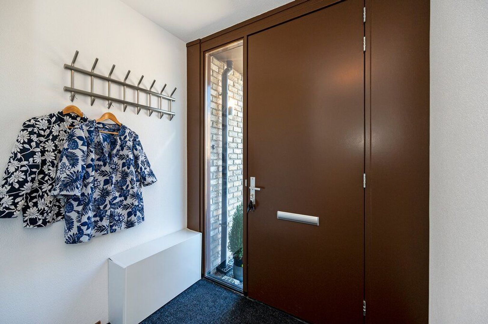Hal met garderobe, meterkast, moderne toiletruimte en toegang tot de woonkamer.
